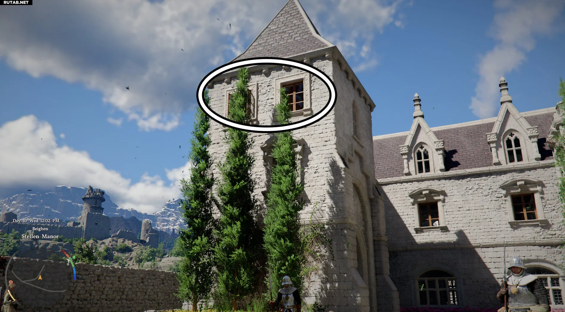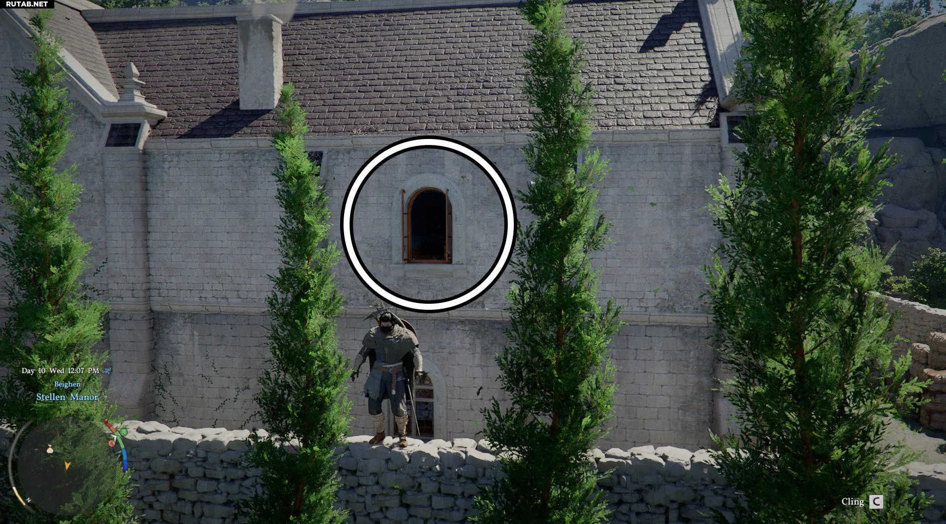 Добравшись до поместья, сначала поднимитесь на башню слева от главного входа. Вокруг много стражников, но если вы не будете привлекать внимание, то сможете беспрепятственно забраться на башню и открыть окно. Для большей безопасности делайте это под покровом ночи.