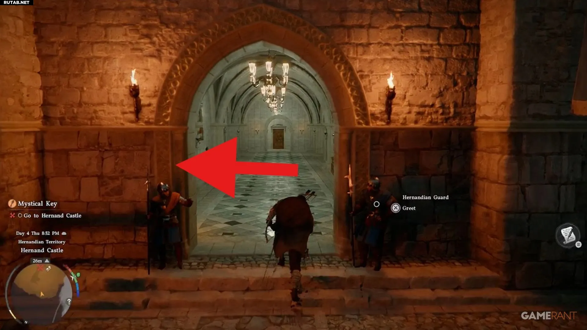 - Поднимитесь по небольшой лестнице и продолжайте движение внутрь замка, пока не увидите двух стражников у арки.