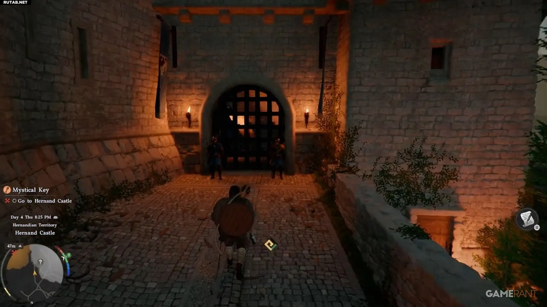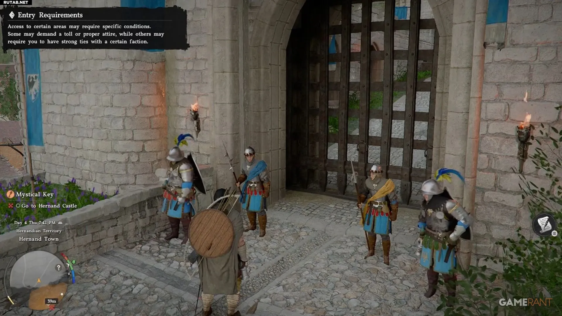 Чтобы попасть в замок, сначала нужно выполнить основной квест «Действия говорят громче слов» и получить одеяние жителя Хернанда. В этом наряде стража пропустит вас через главные ворота. Альтернативно можно попытаться перелезть через стену, но проще следовать правилам.