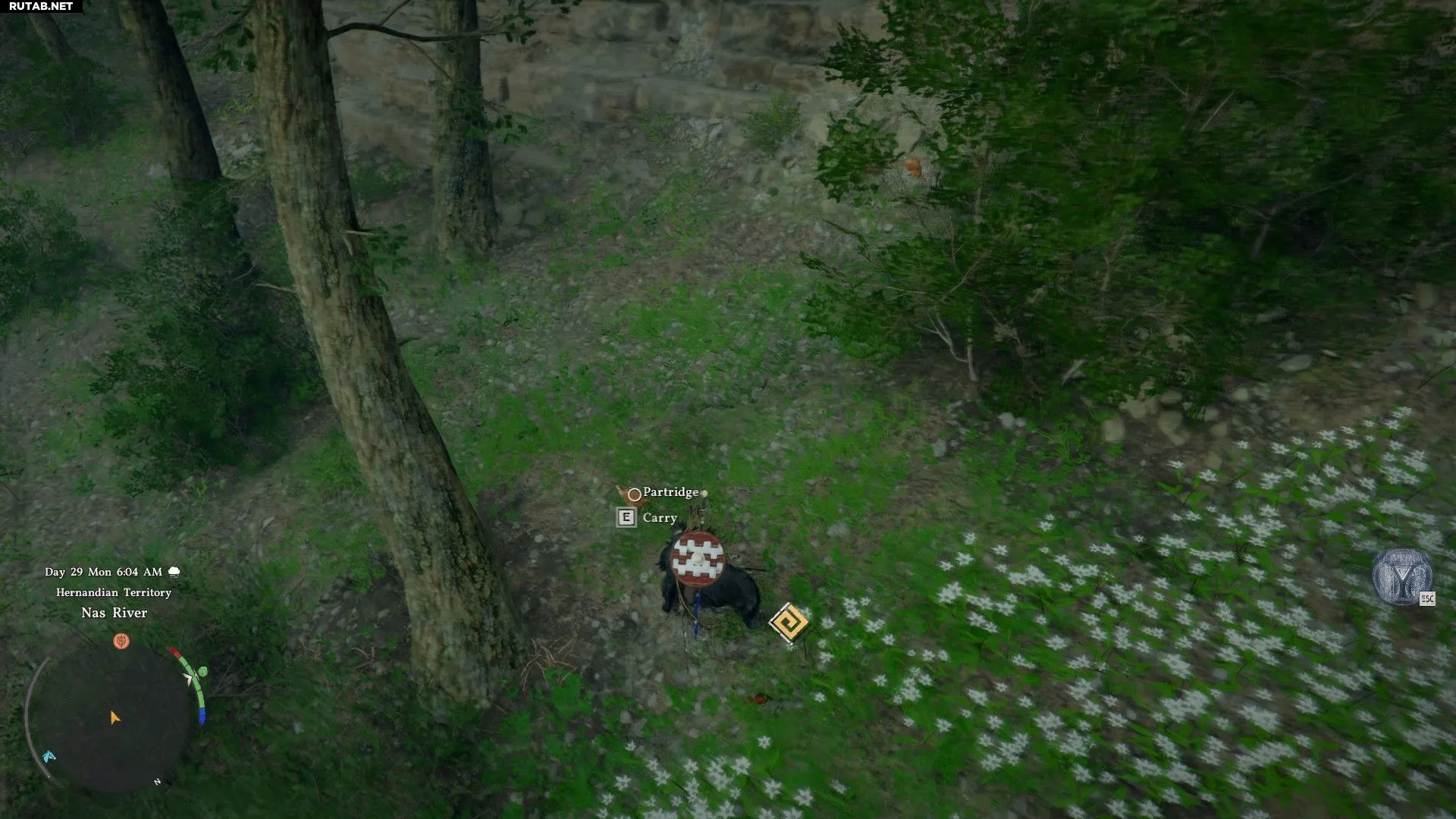Приблизившись к любой птице, вы увидите подсказку о возможности взять её. Вы можете взаимодействовать с убегающими животными, даже когда сами бежите за ними. Не обращайте внимания на потускневшую подсказку — продолжайте преследование, удерживая кнопку взаимодействия. Вскоре ваш персонаж совершит бросок и схватит птицу. Проделайте это пять раз в районе реки, и испытание будет завершено.