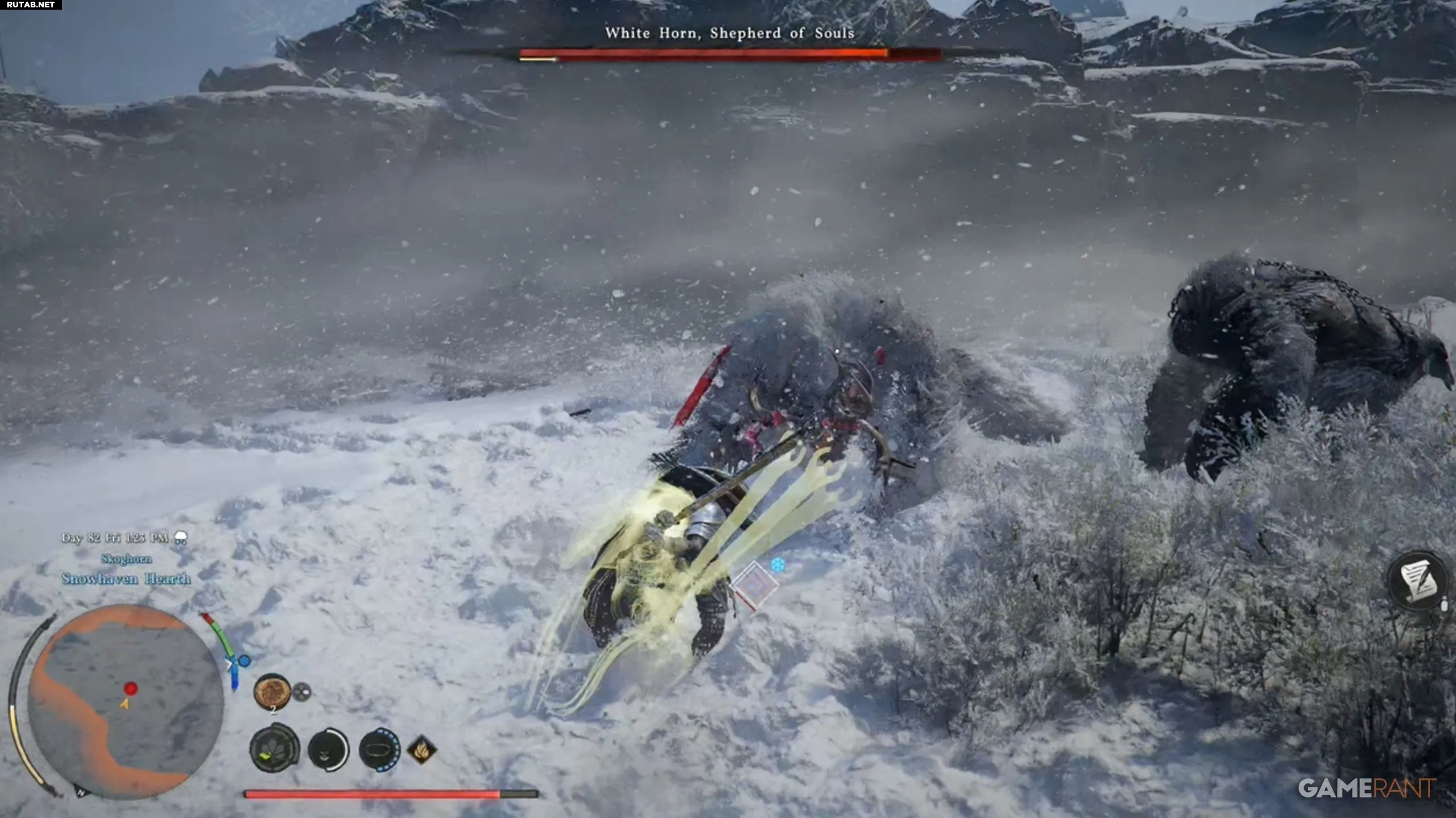 Белый Рог невероятно крепок, так как бой с ним состоит из трёх фаз. Сражаться с ним станет значительно легче, если у вас есть навык «Огненный удар», так как его мех загорится, и он будет вынужден остановиться, упасть и кататься, что позволит вам лучше сосредоточиться на атаках.