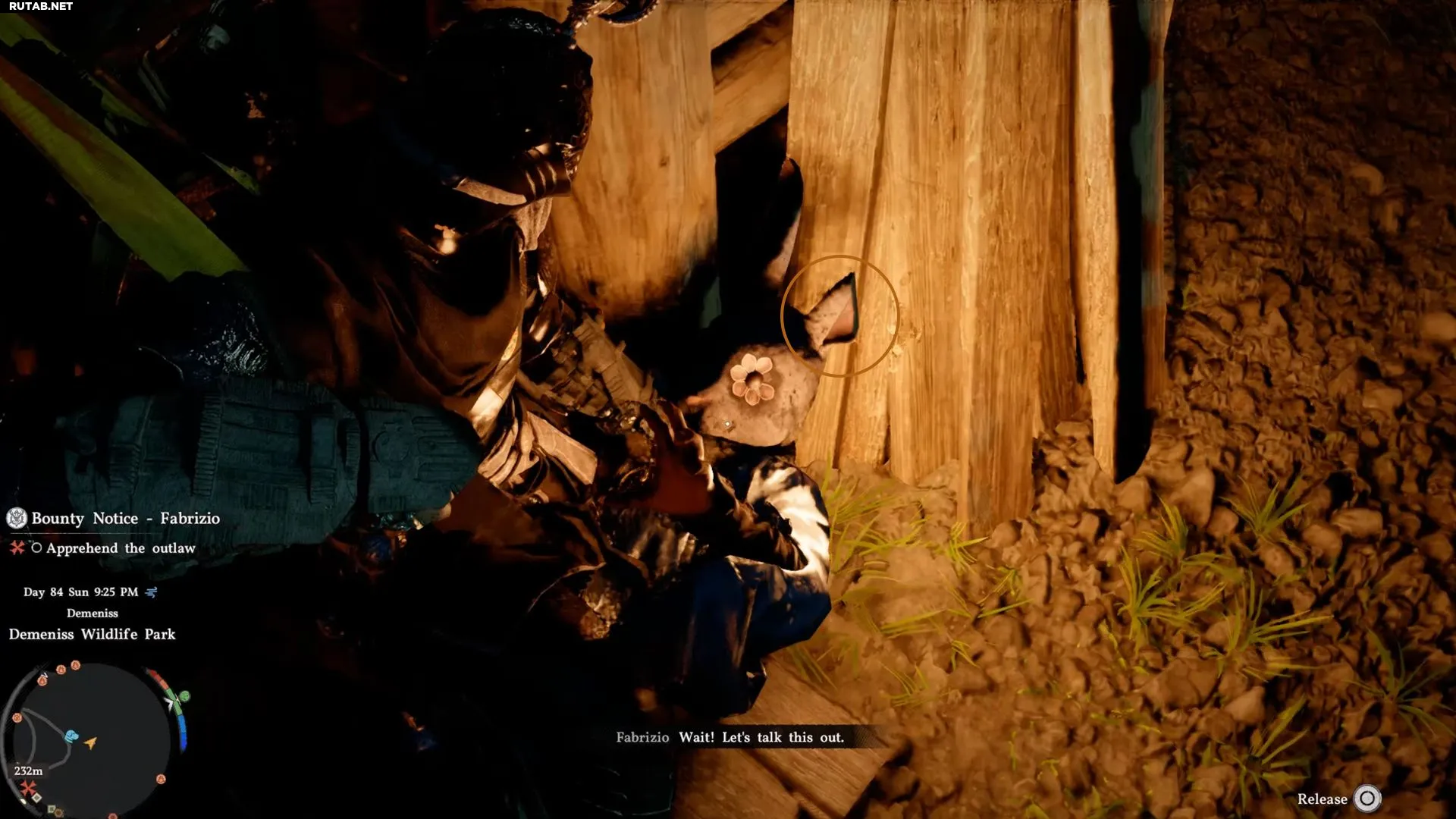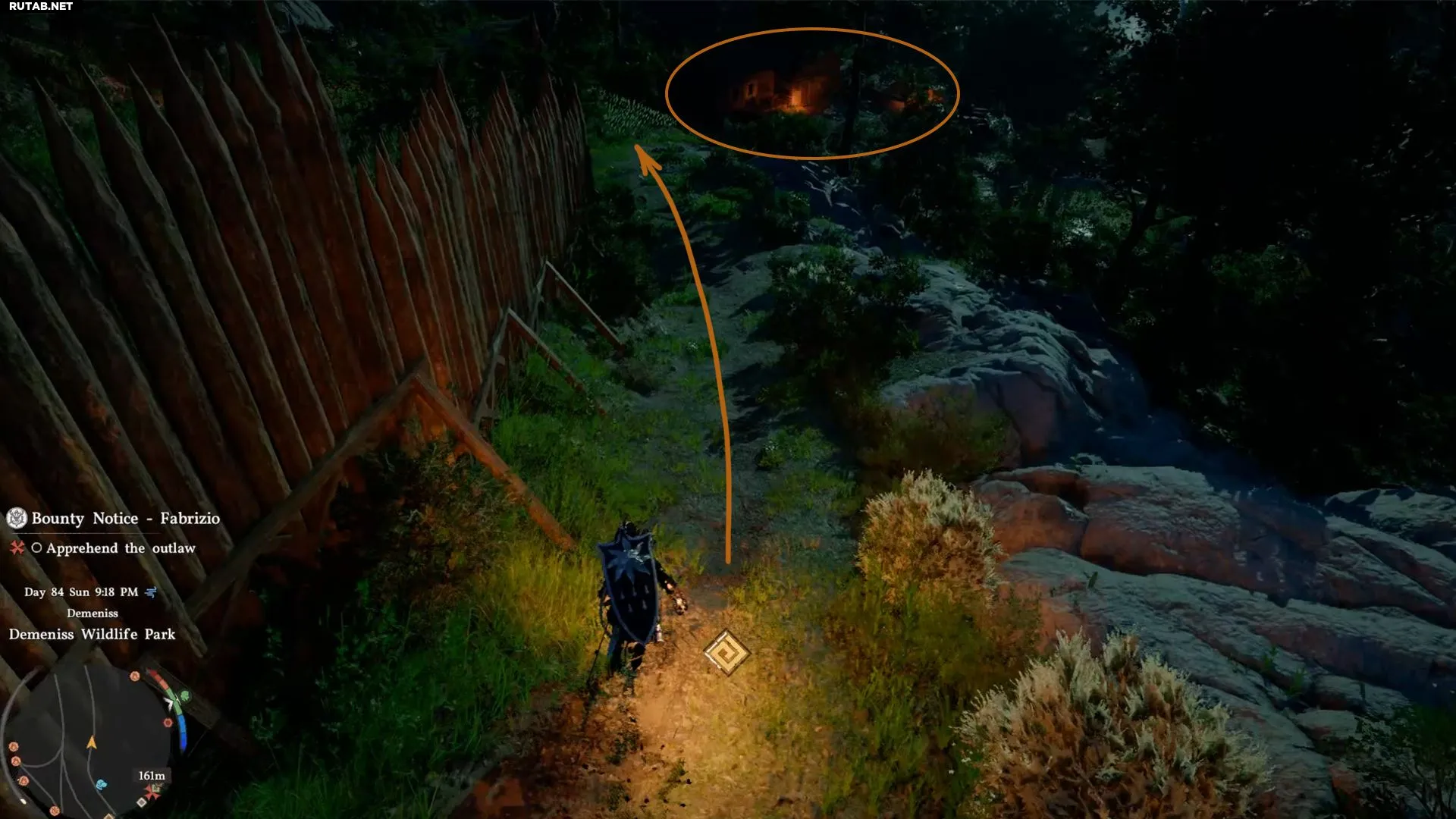 Фабрицио находится внутри Парка дикой природы Деменисс, на его восточной стороне. Не полагайтесь на маркер задания, так как он неточно указывает его местоположение. Вам нужно войти в парк, двигаться на восток и следовать по дороге, чтобы найти его прячущимся за домом.