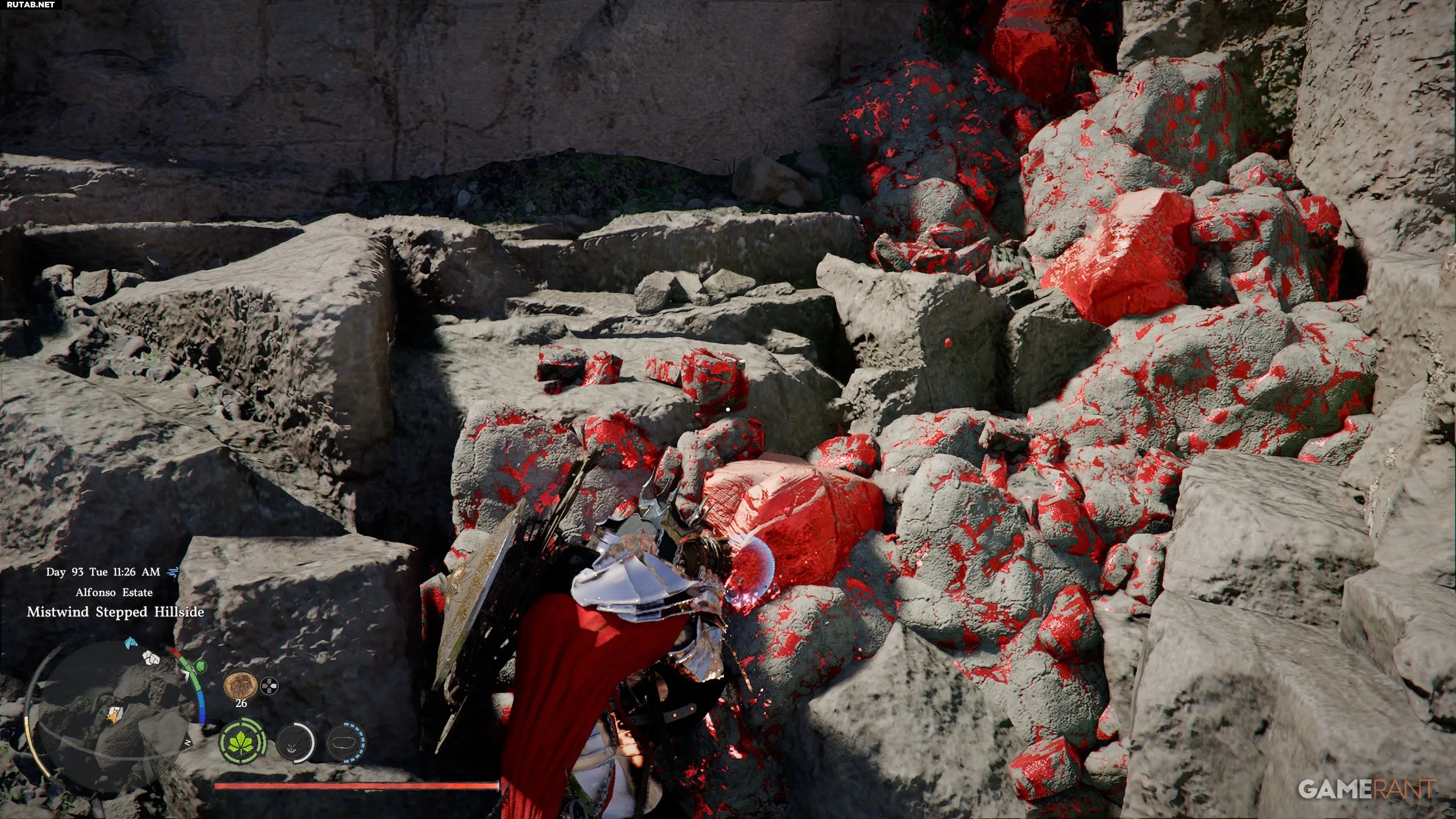 Кровавый камень всегда находится в скальных стенах. Его можно добыть с помощью обычной кирки или, что ещё лучше, Бурового перфоратора от «Экскаватрона Марни» (гайд здесь), который даёт +10% шанс получить дополнительный камень!