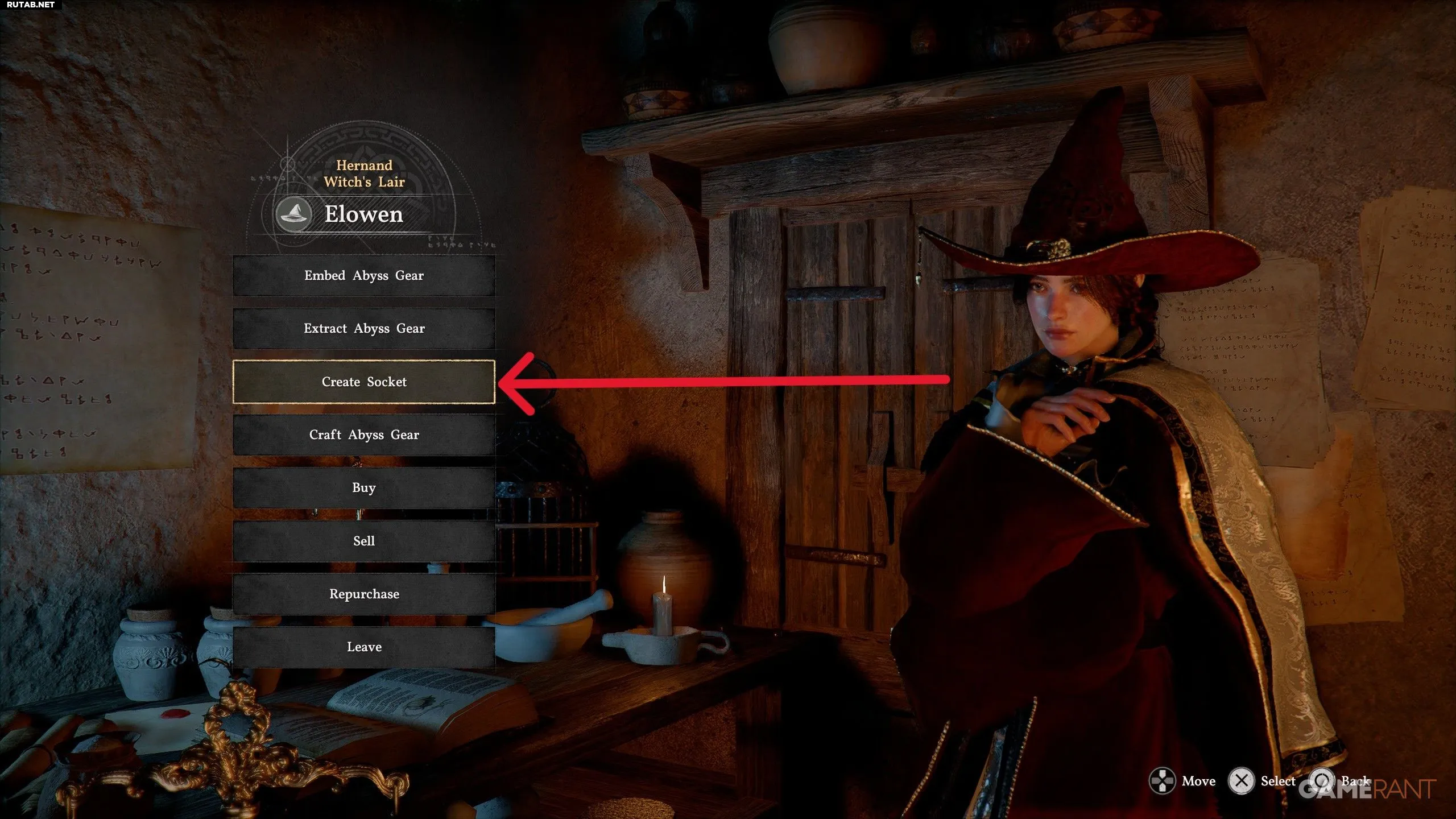 - Чтобы начать, найдите Ведьму (Witch) и выберите опцию «Создать сокет» (Create Socket). Это купит слот на нужной вам экипировке.