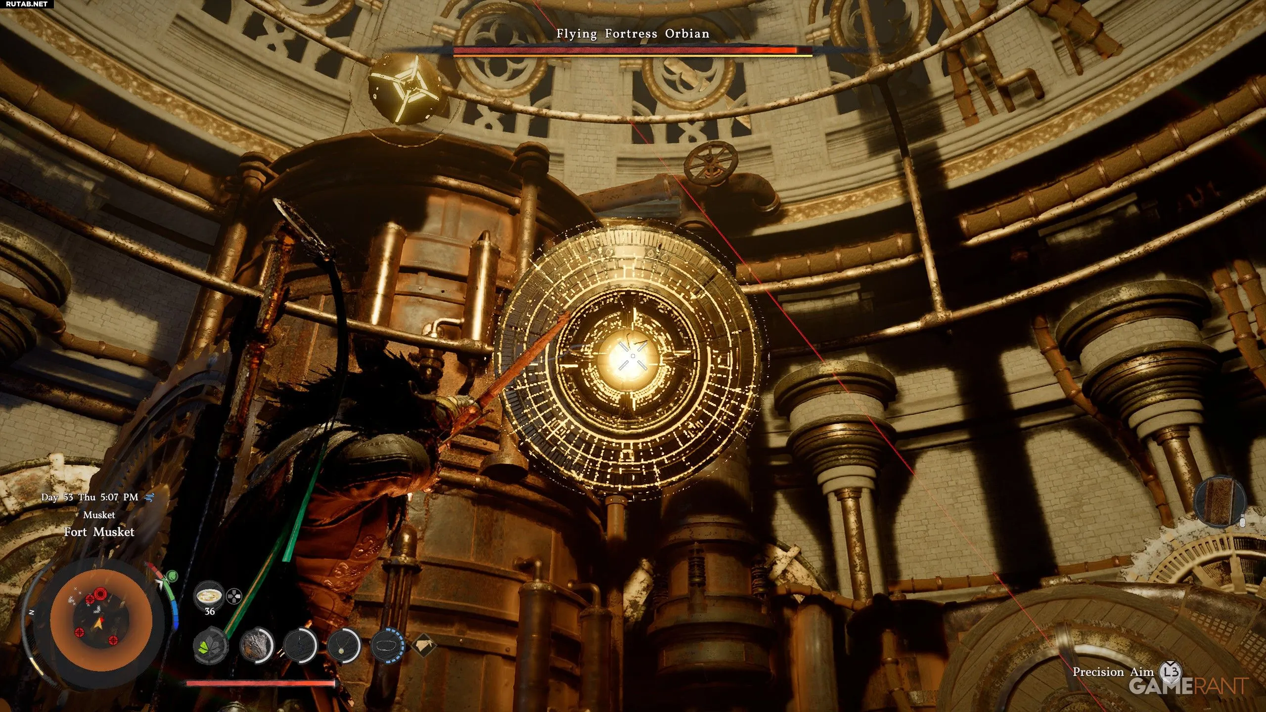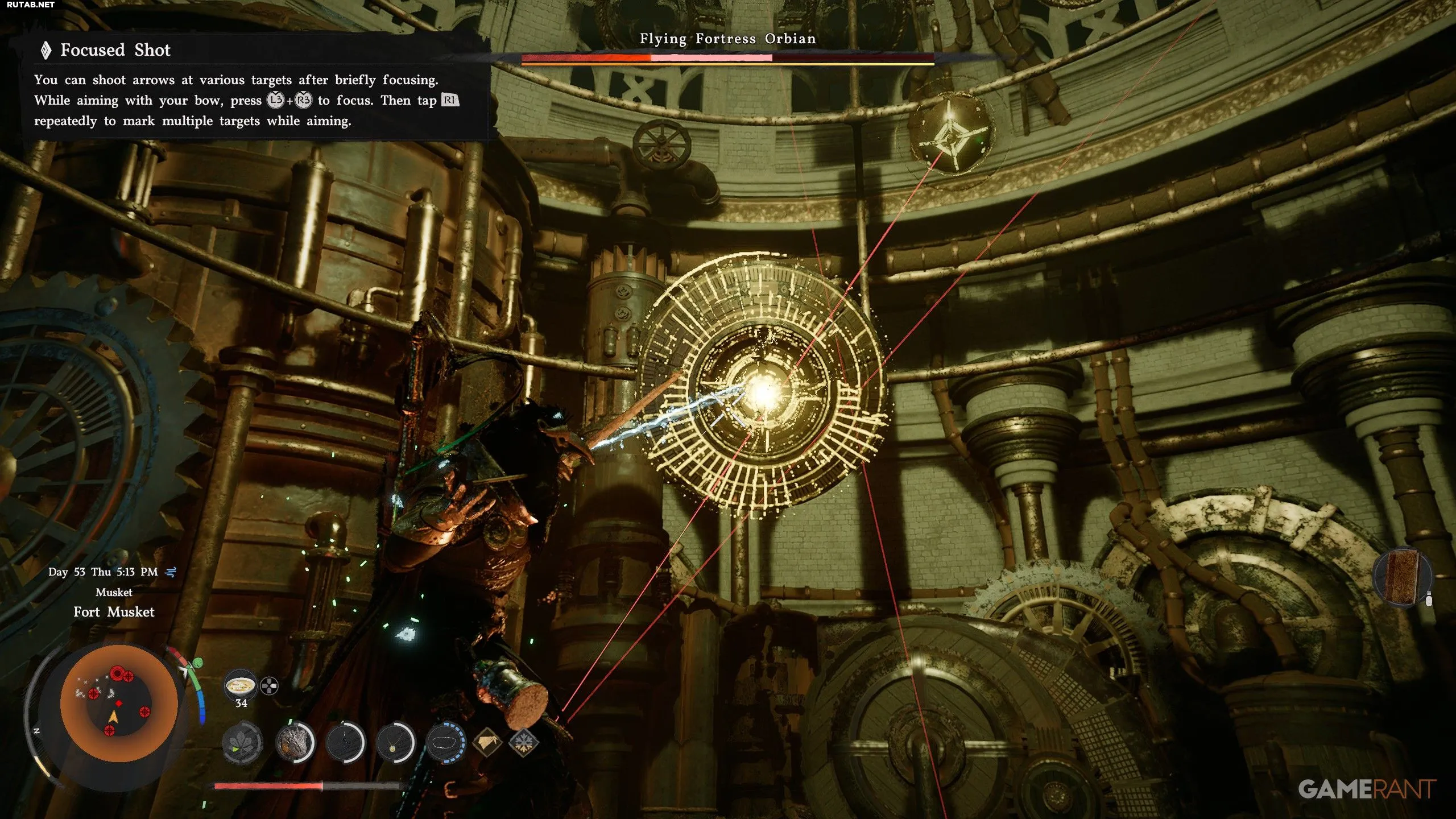 Попав в комнату с H.A.L.L., вы начнете битву с боссом — самой Летающей крепостью Орбиан. Для этого сражения критически важно иметь лук, стрелы и умение «Прицельный выстрел».