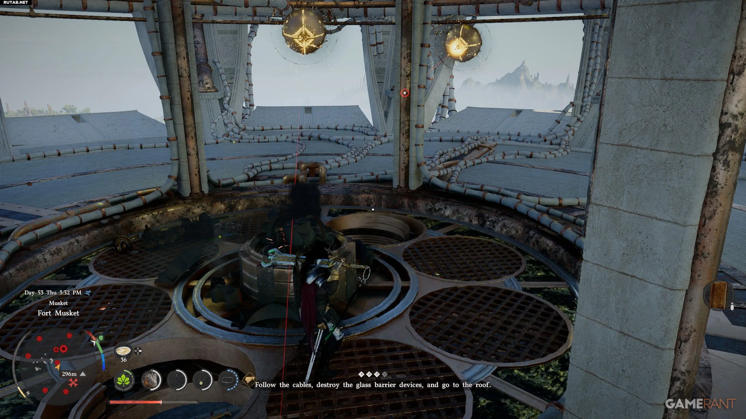 - Запрыгните на провода и карабкайтесь по ним до самой крыши. Вам может понадобиться много выносливости или прием «Прыжок + Тройной Силовой толчок», чтобы забраться.