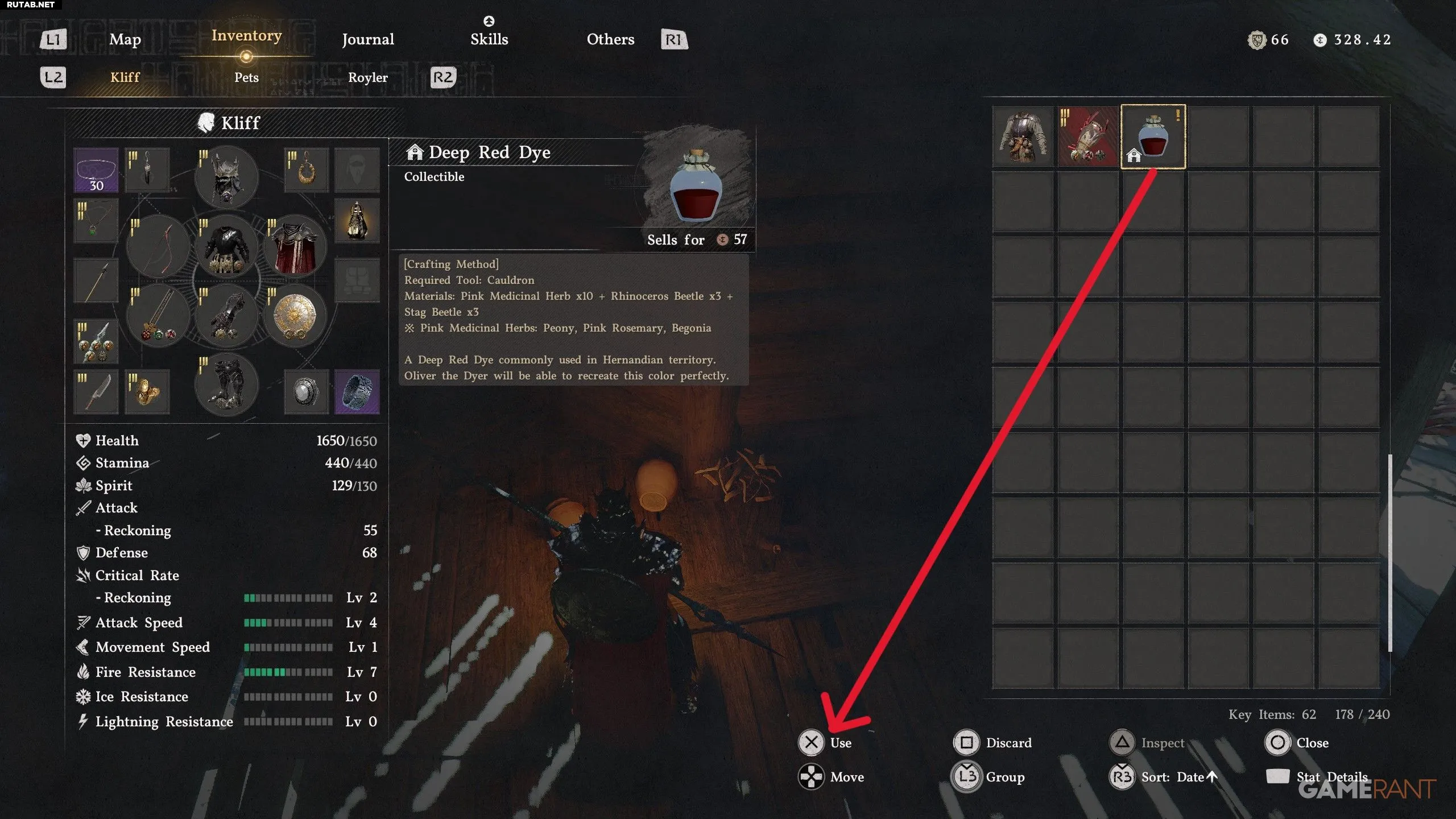 - Подобрав Темно-красную краску, зайдите в инвентарь и выберите «Использовать» (X/A).