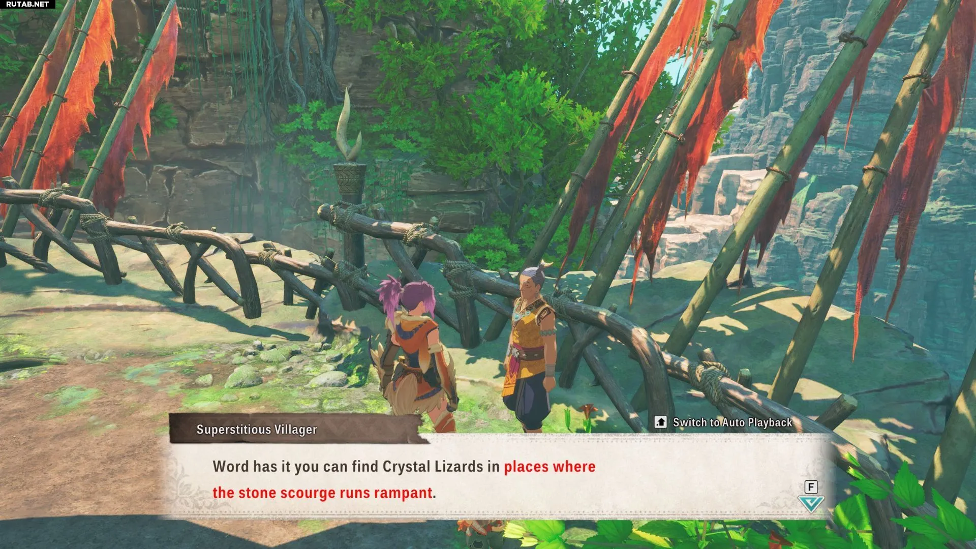 Направляйтесь в правую часть поляны и спуститесь по небольшому склону. Внизу, посреди поляны, будет стоять кристаллизованная ящерица. Когда появится значок взаимодействия, осмотрите Кристального Ящера.