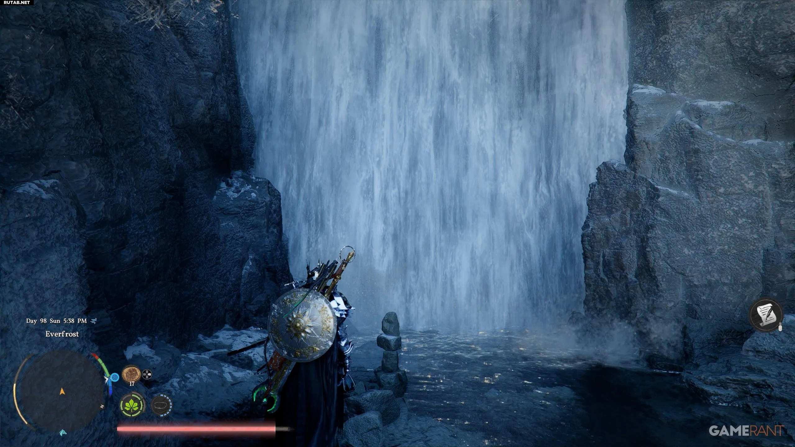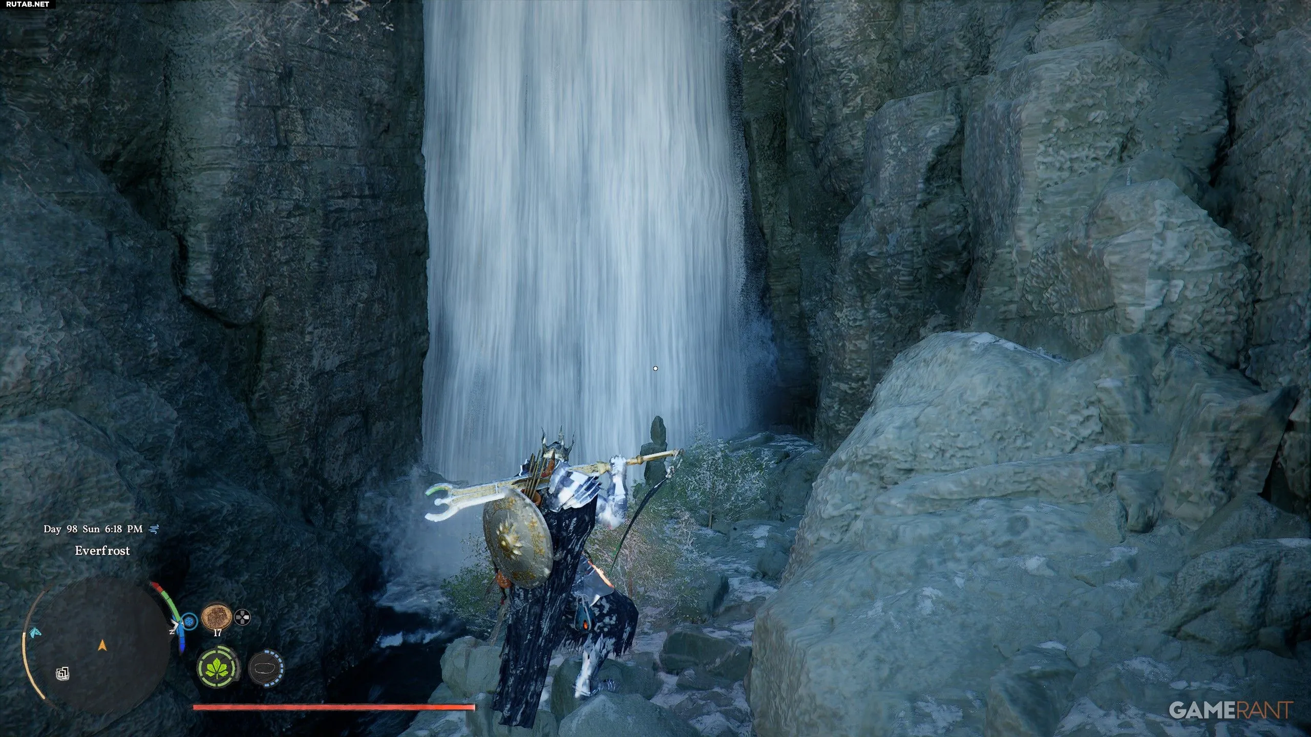 - Над первой «N» на карте следуйте по реке на запад, пока не найдёте водопад.