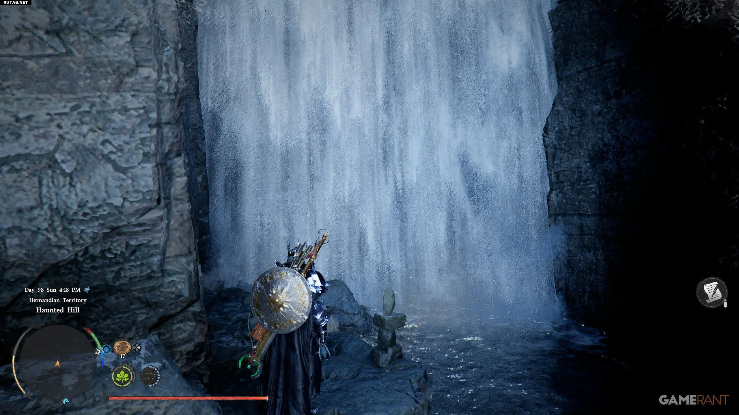 - Двигайтесь на запад вдоль реки, пока не найдёте водопад. Чтобы войти за него, используйте комбинацию R1+Треугольник.