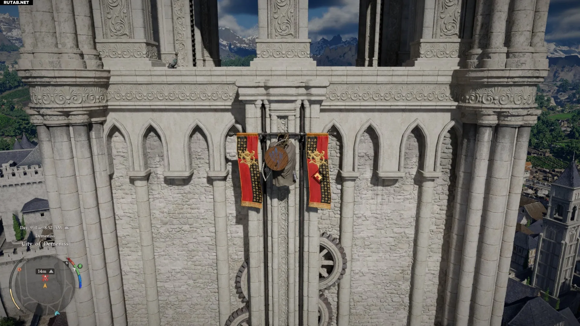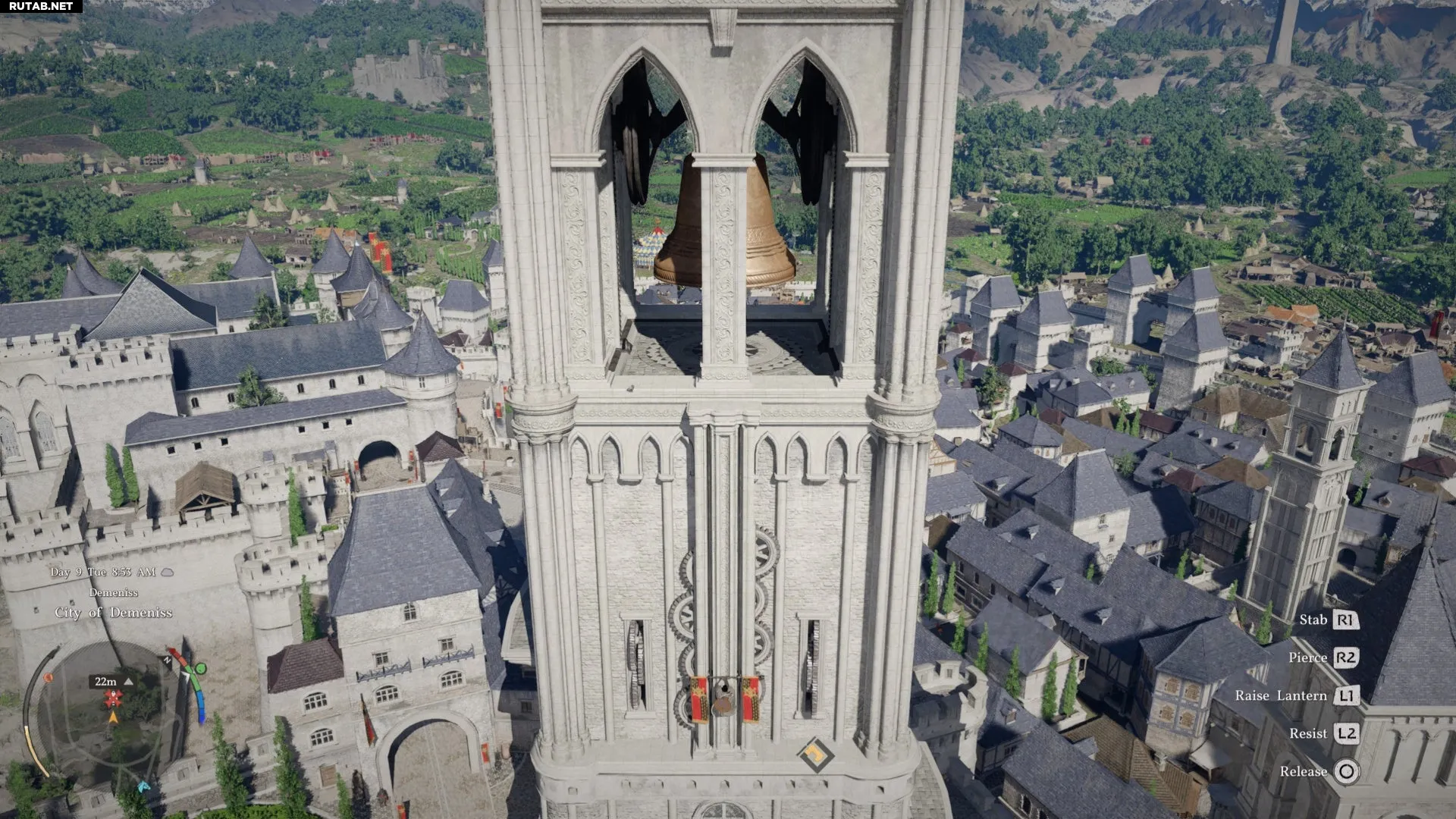 Чтобы позвонить в колокол Деменисса, вам нужно потянуть вниз красные флаги на фасаде колокольни. Чтобы добраться до них, придётся забраться довольно высоко, поэтому убедитесь, что вы хотя бы раз улучшили свою выносливость. Не забывайте делать остановки на уступах, чтобы восстановить силы.