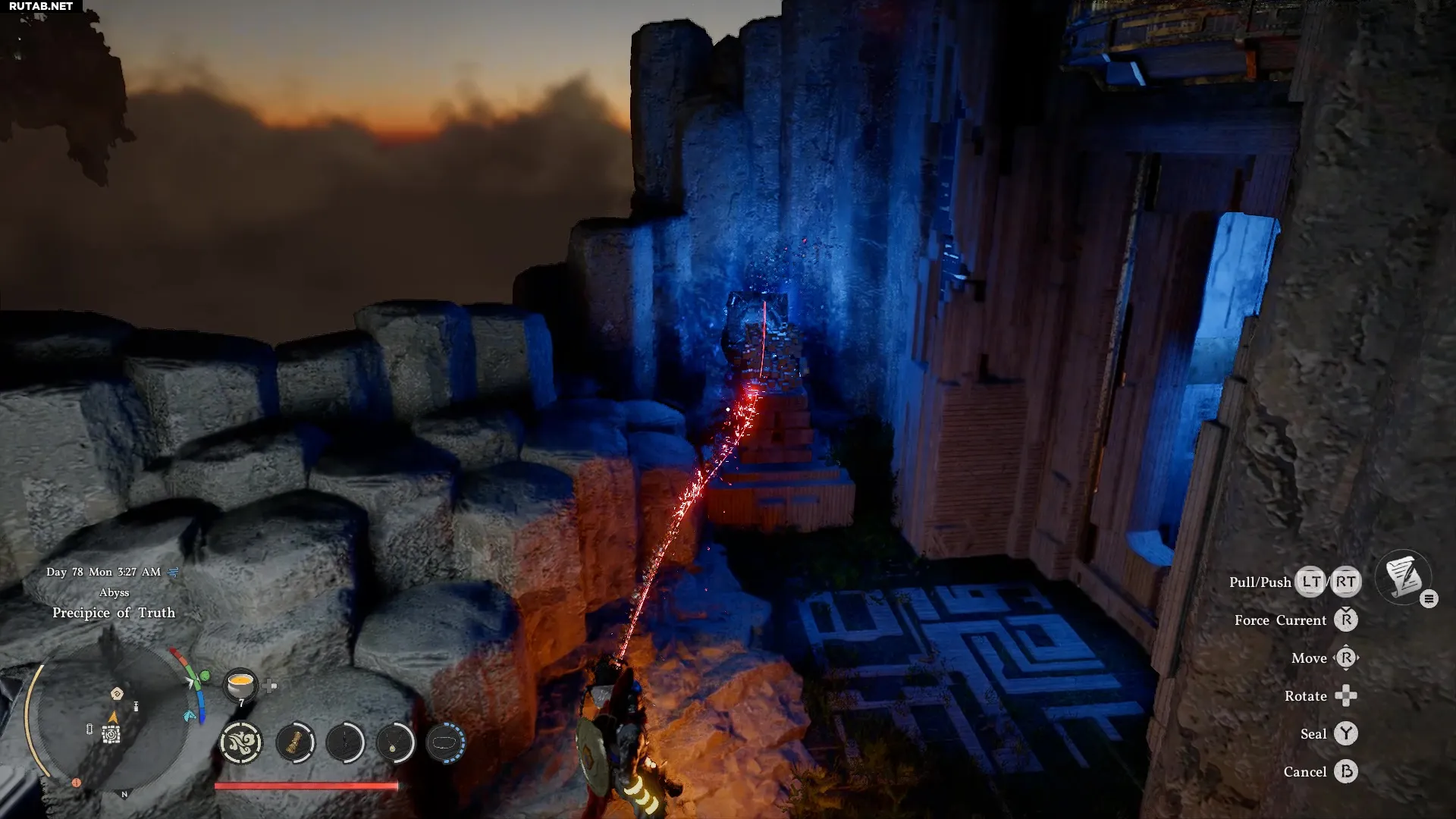 – К северо-востоку от поля, через серию платформ, находится слот для установки панели давления. Перенесите её туда и используйте «Ладонь силы», чтобы установить на место. После этого механизм активируется, и появится новый вентилятор, создающий горизонтальный поток воздуха. Используйте этот поток, чтобы добраться до другой стороны острова, где вас ждёт очередное препятствие.
