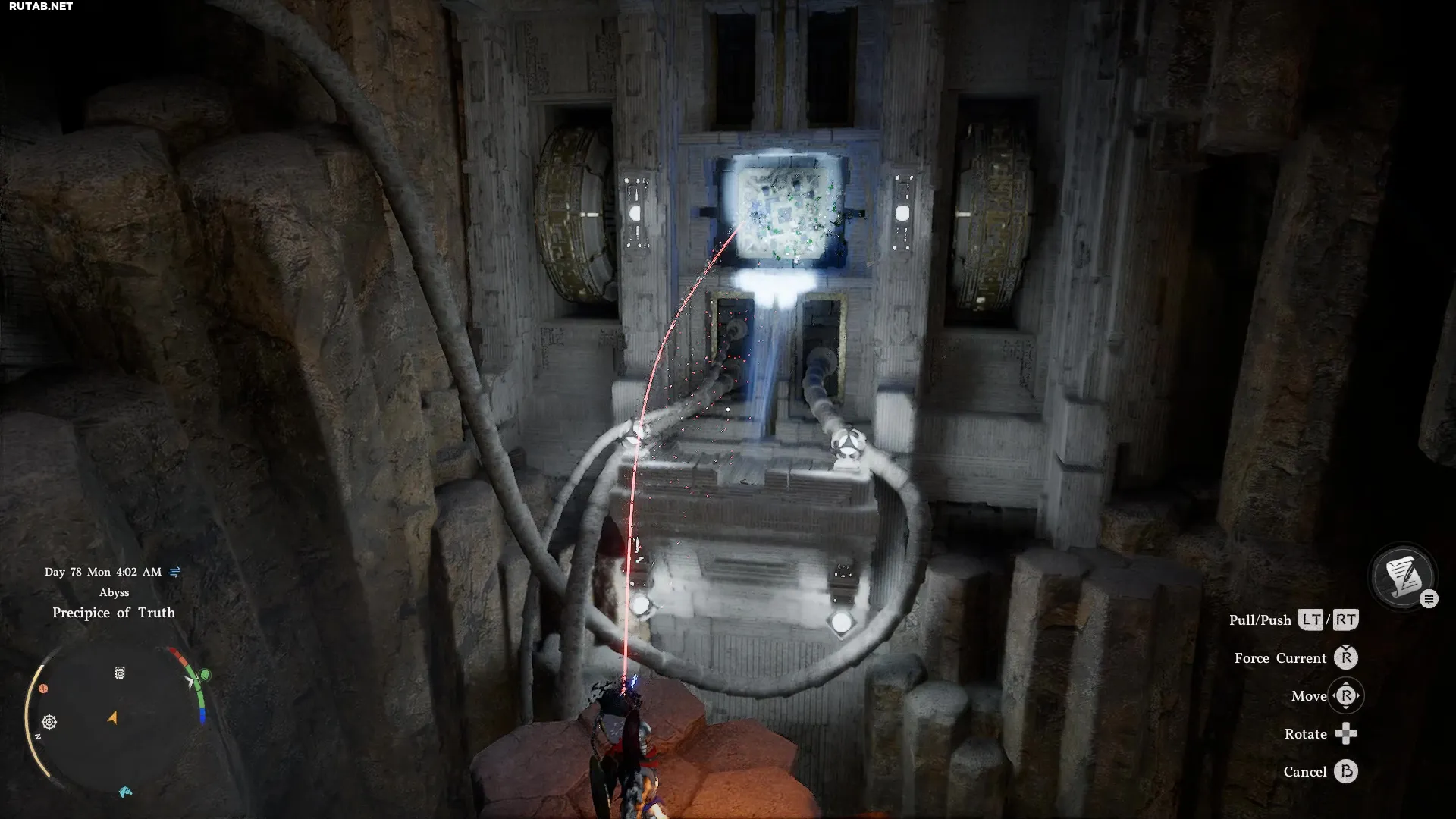– Путь преграждает скала, которая частично открывается, обнажая турель, стреляющую лазером. Чтобы уничтожить её, отойдите назад, чтобы она открылась, а затем схватите сферу турели рукой «Силы аксиомы». Малейшего усилия будет достаточно, чтобы вырвать её и обрушить стену, открыв путь дальше. На месте останется большой заряженный электричеством объект — «Энергетическое ядро — Врата коллапса».