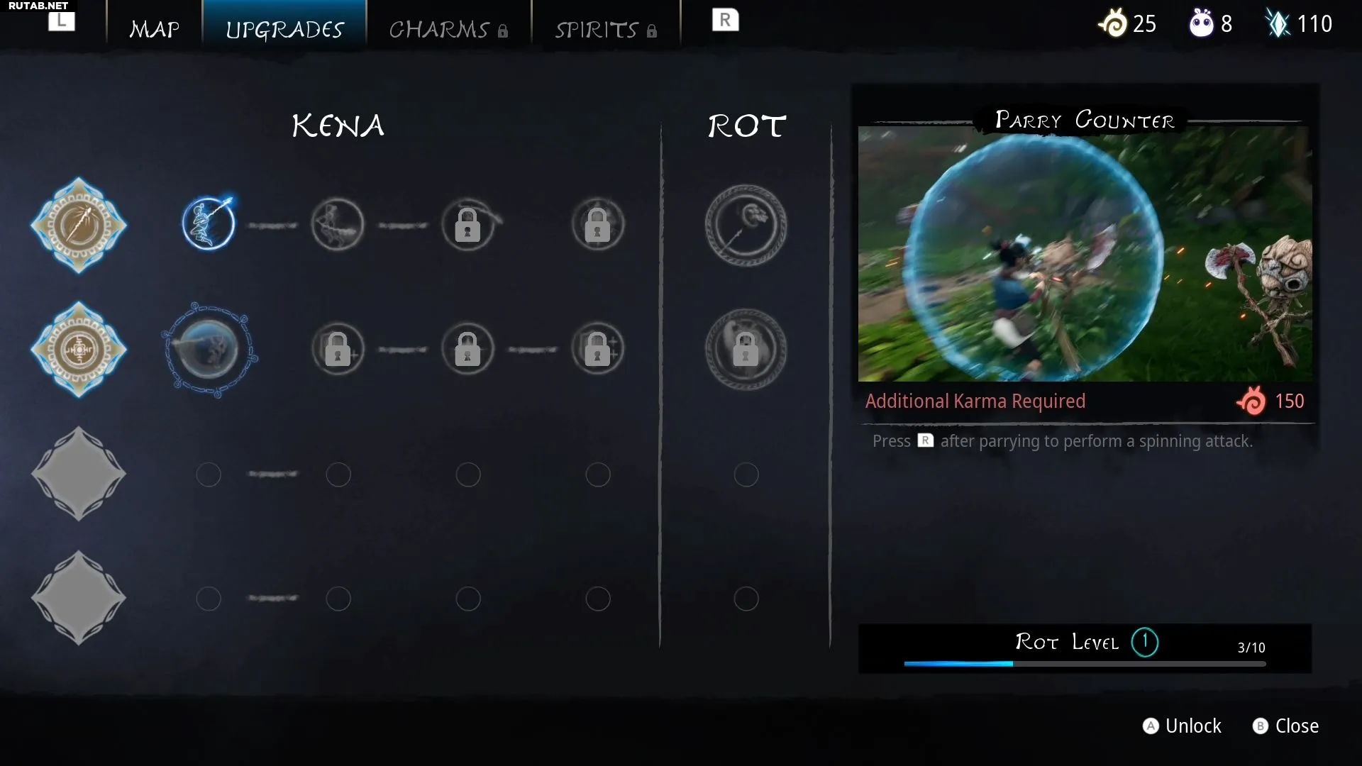 Контратака после парирования: Абсолютно необходимый навык. Стоит 150 кармы и позволяет выполнить мощную вращающуюся контратаку после идеального парирования атаки врага духовным щитом Кены. Правильно рассчитанное время даст преимущество в бою, даже если вас окружили сильные противники.