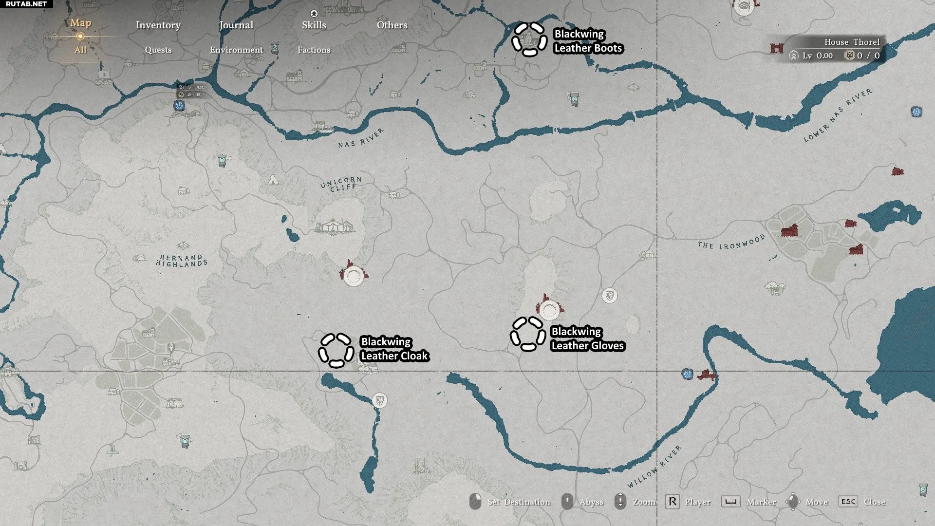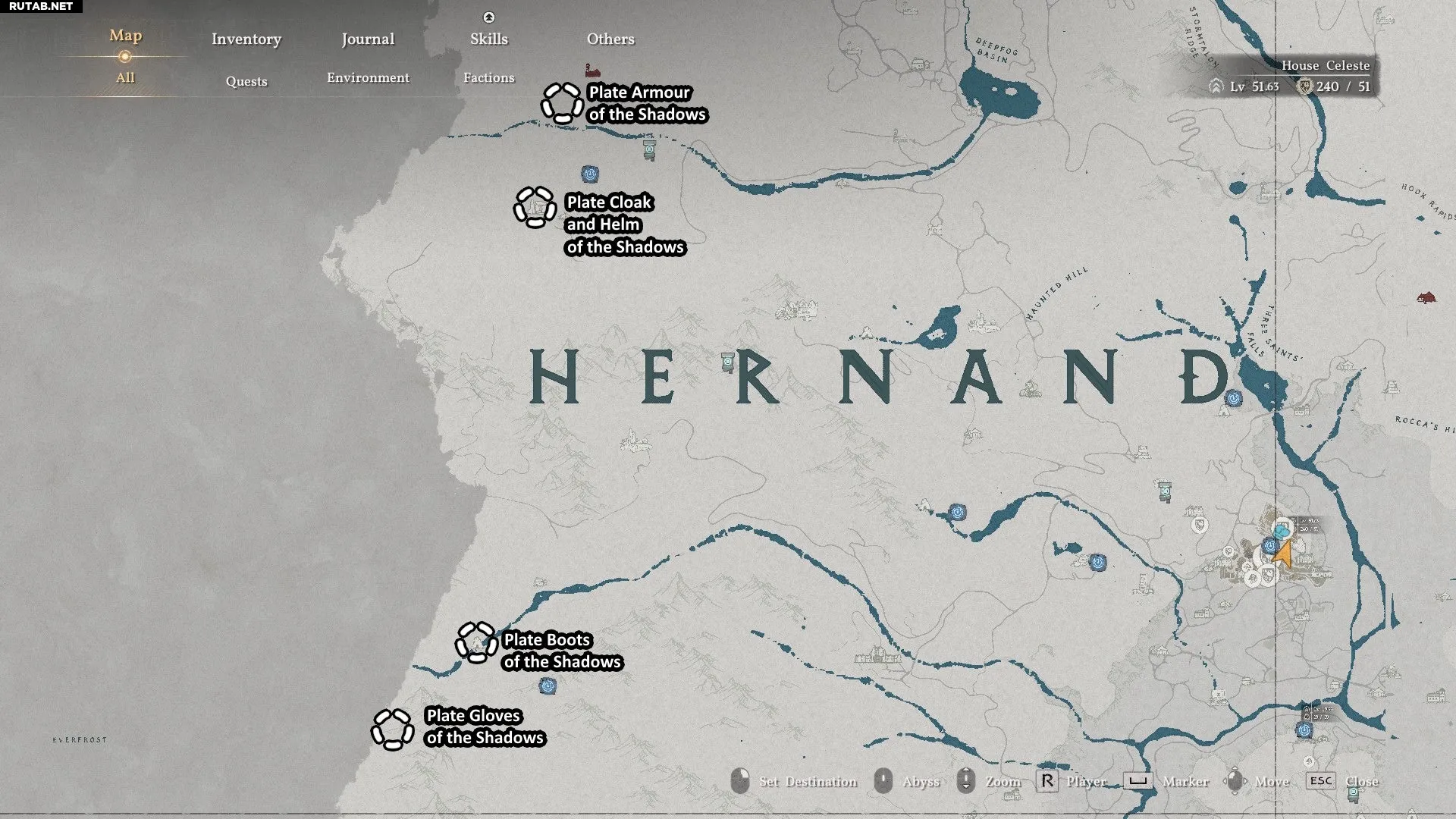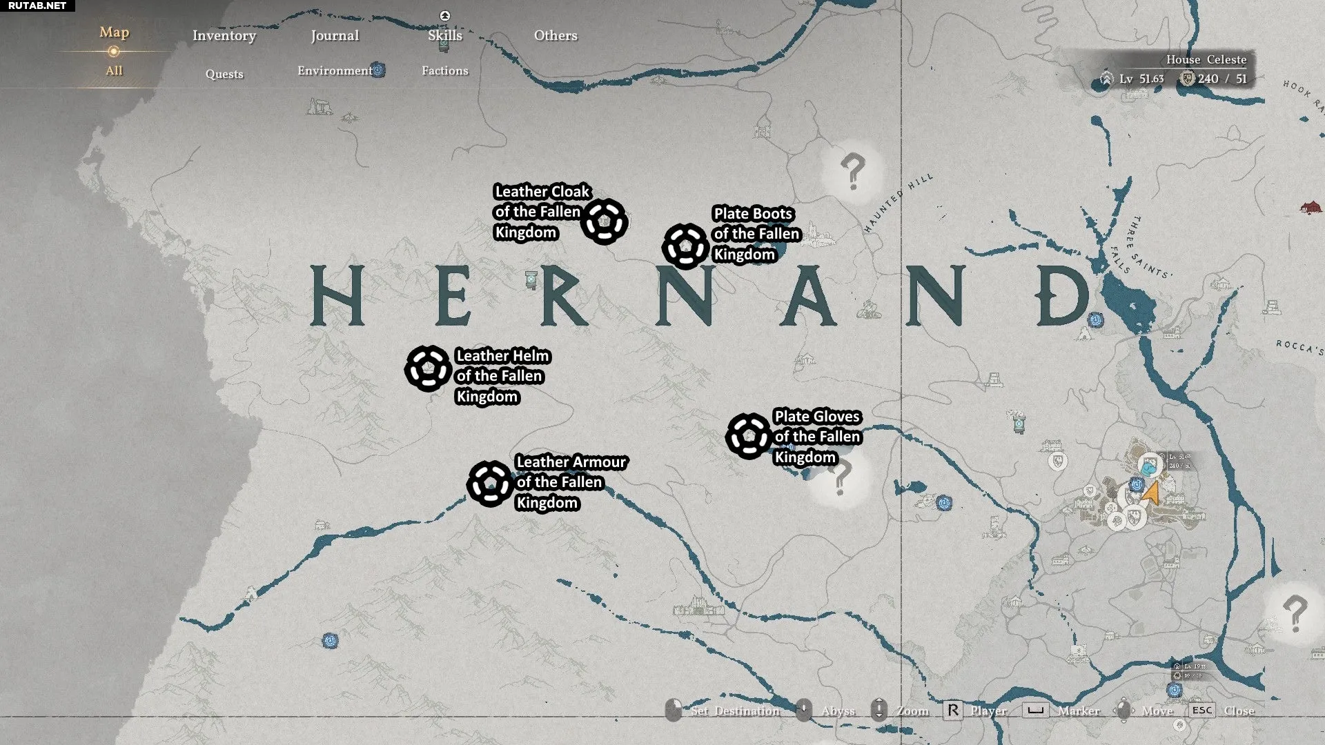 - Местоположение: Все части комплекта находятся примерно в одной области на западе Хернанда, как показано на карте ниже. Будьте осторожны: чтобы собрать весь комплект, вам придётся сразиться с очень сильным боссом (Белот, Клятвопреступник).
