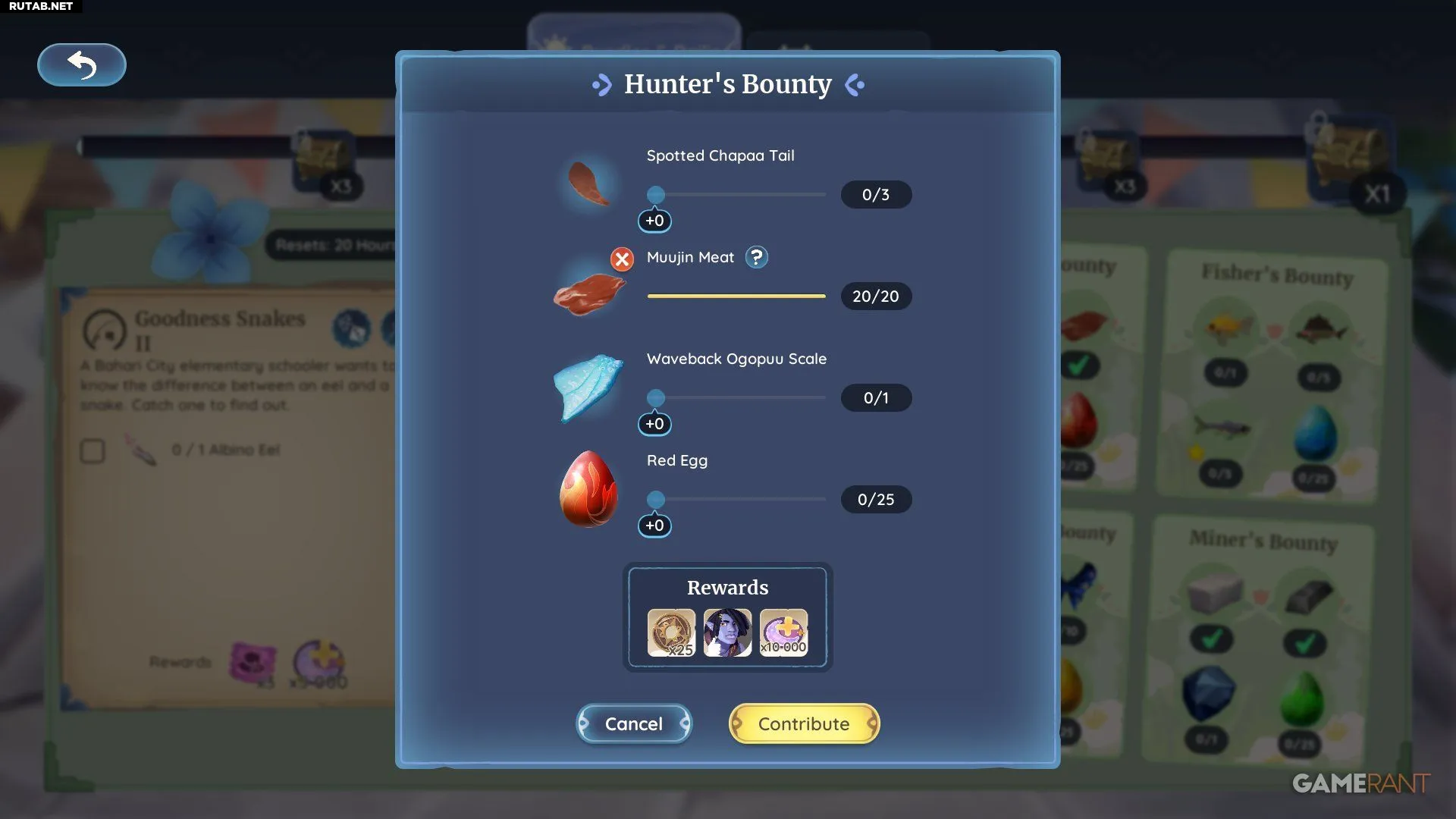 - Мясо мууджина — 20 штук. Это обычная добыча при охоте на все виды мууджинов по всему Заливу Бахари, особенно в районе Тернистых зарослей.