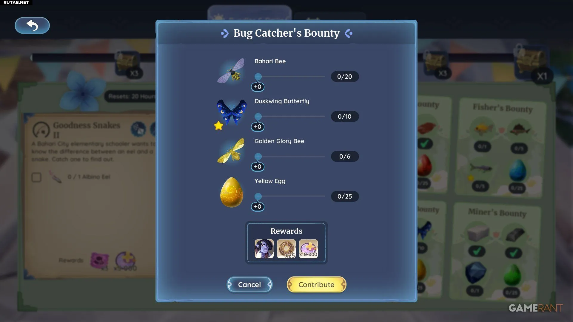 - Жёлтые яйца — 25 штук. Этот новый предмет может случайно выпасть при поимке любого жука или насекомого в Деревне Килима, Заливе Бахари и Элдервуде.