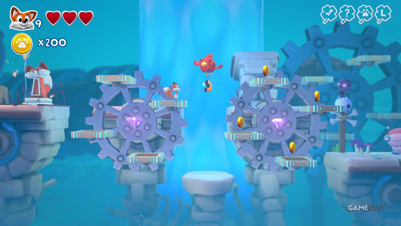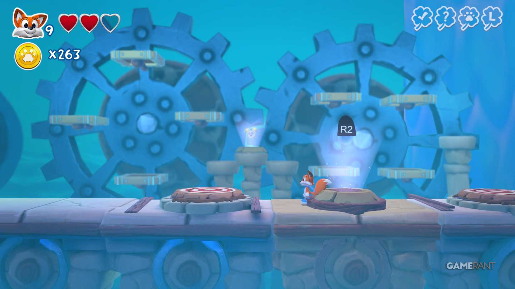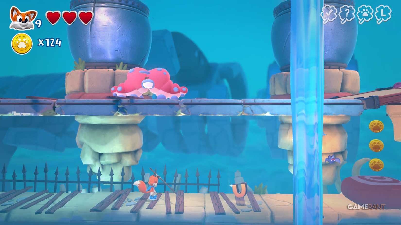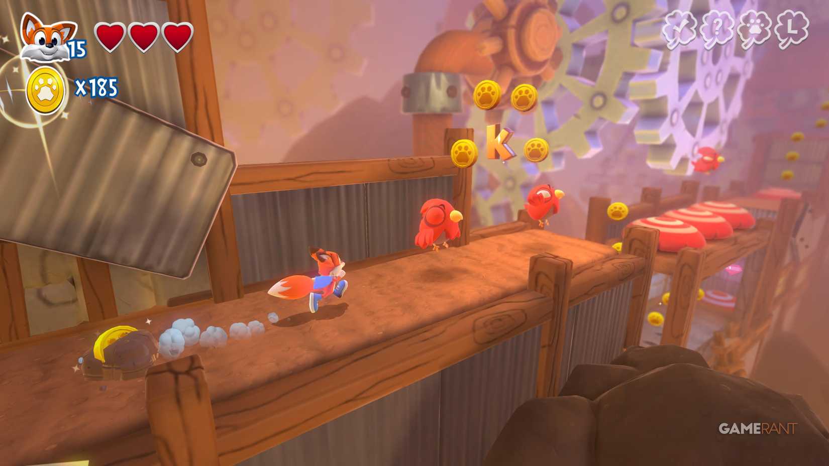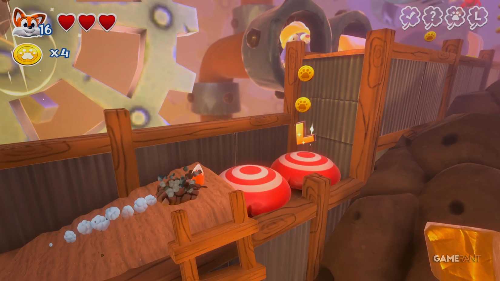 Скрытая страница: Когда вы наткнётесь на два переключателя, прыгните на них, чтобы открыть лисью нору. Она приведёт вас в зону с движущимися платформами позади вас, где вы сможете собрать все монеты и получить скрытую страницу.