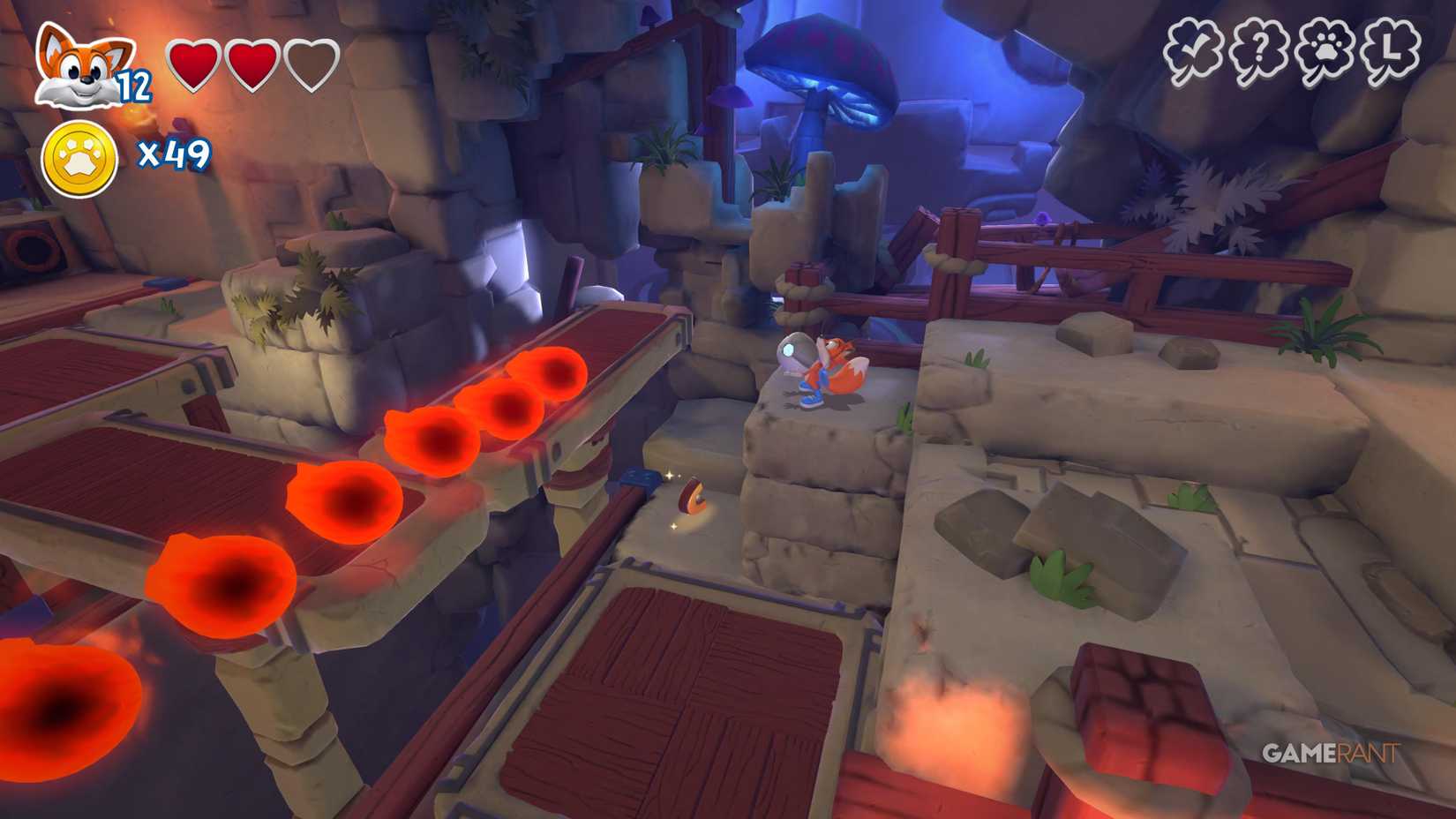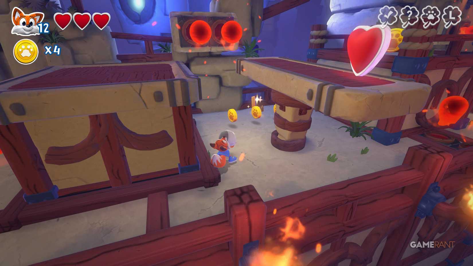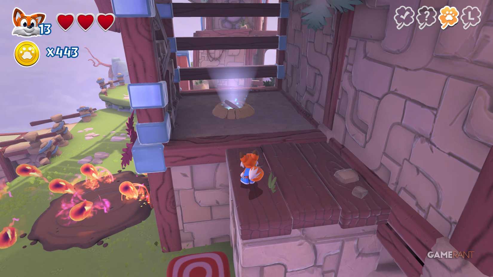 Скрытая страница: На верхней стороне, после подъёма на башню с движущимся огнём, идите по правому пути. Используйте подкоп, чтобы избежать урона от огня, и прыжковую панель, чтобы найти лисью нору.