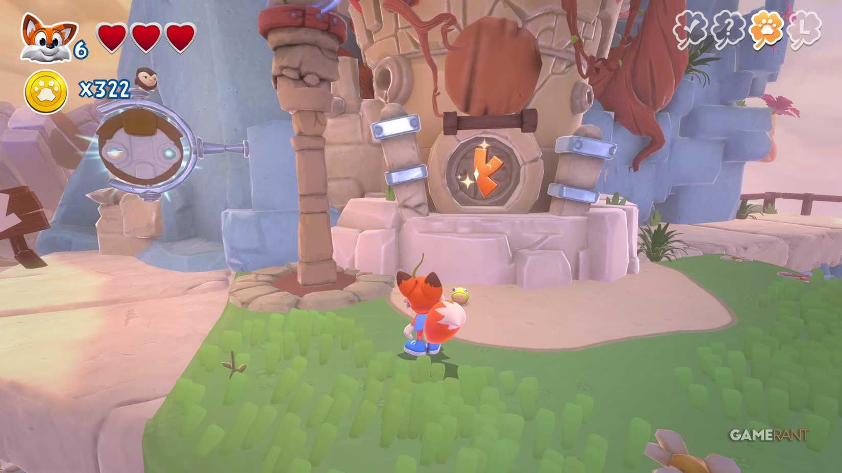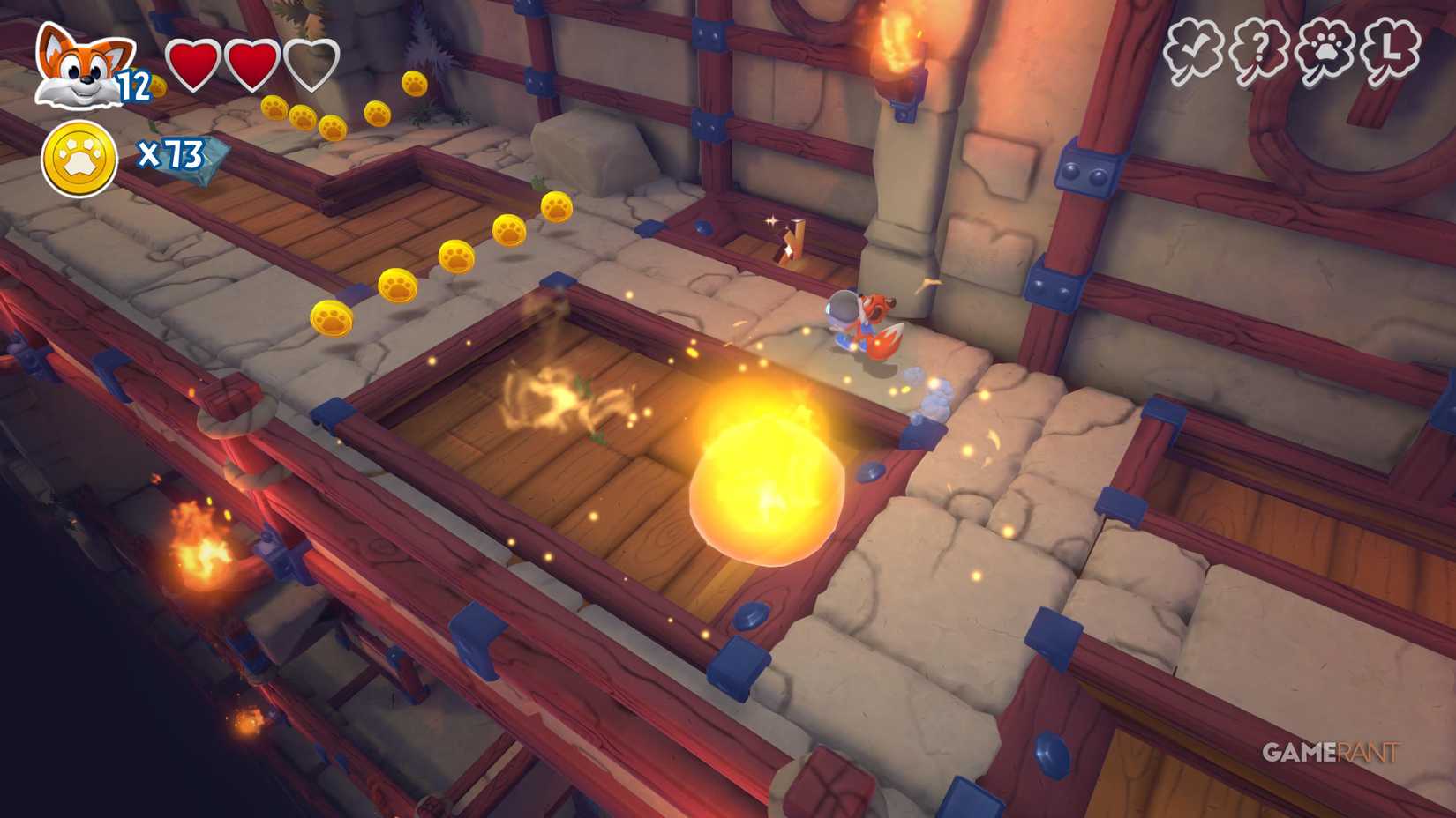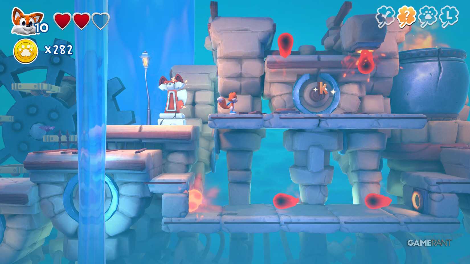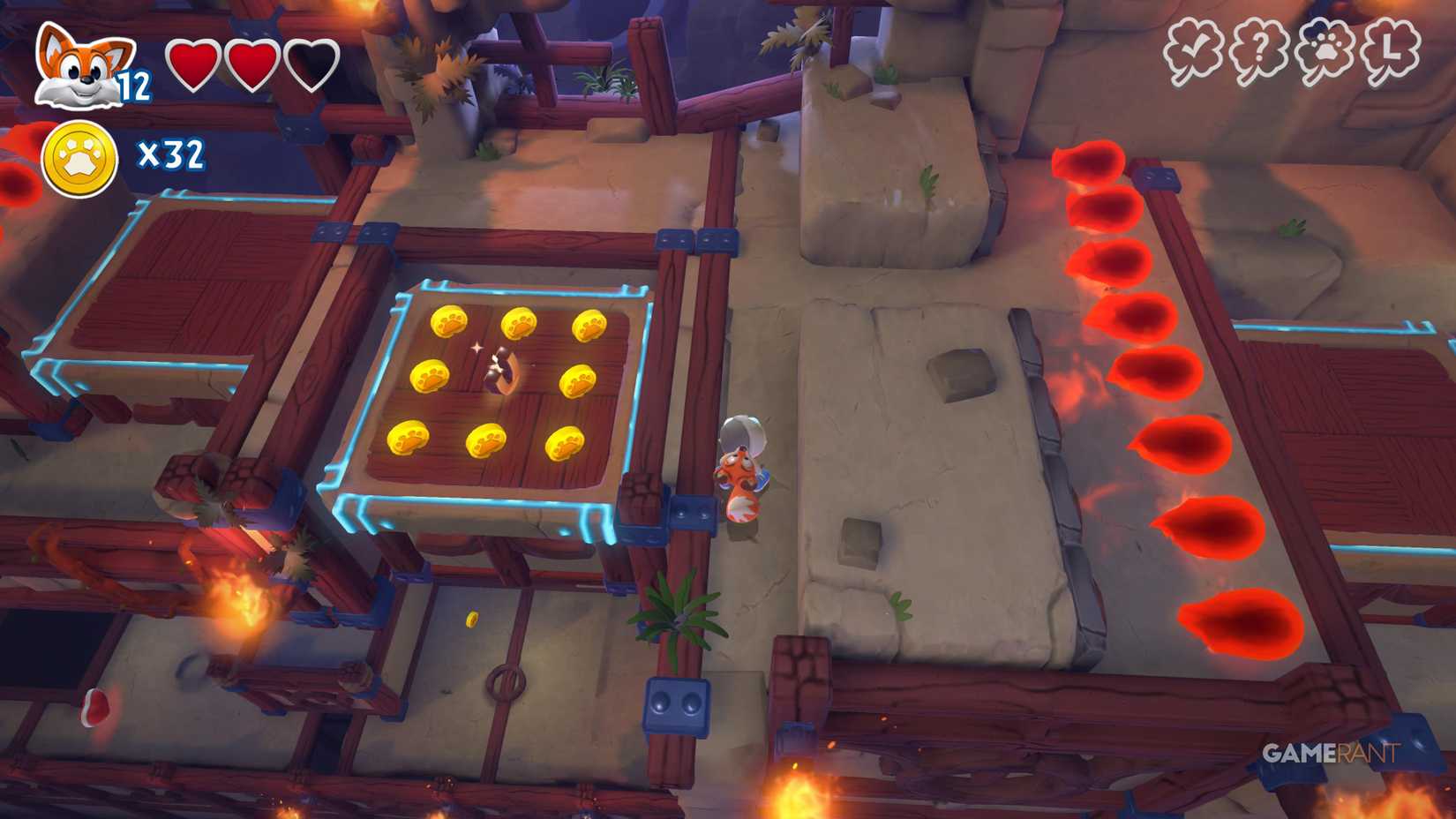 Скрытая страница: На верхней стороне, после подъёма на башню с движущимся огнём, идите по правому пути. Используйте подкоп, чтобы избежать урона от огня, и прыжковую панель, чтобы найти лисью нору.