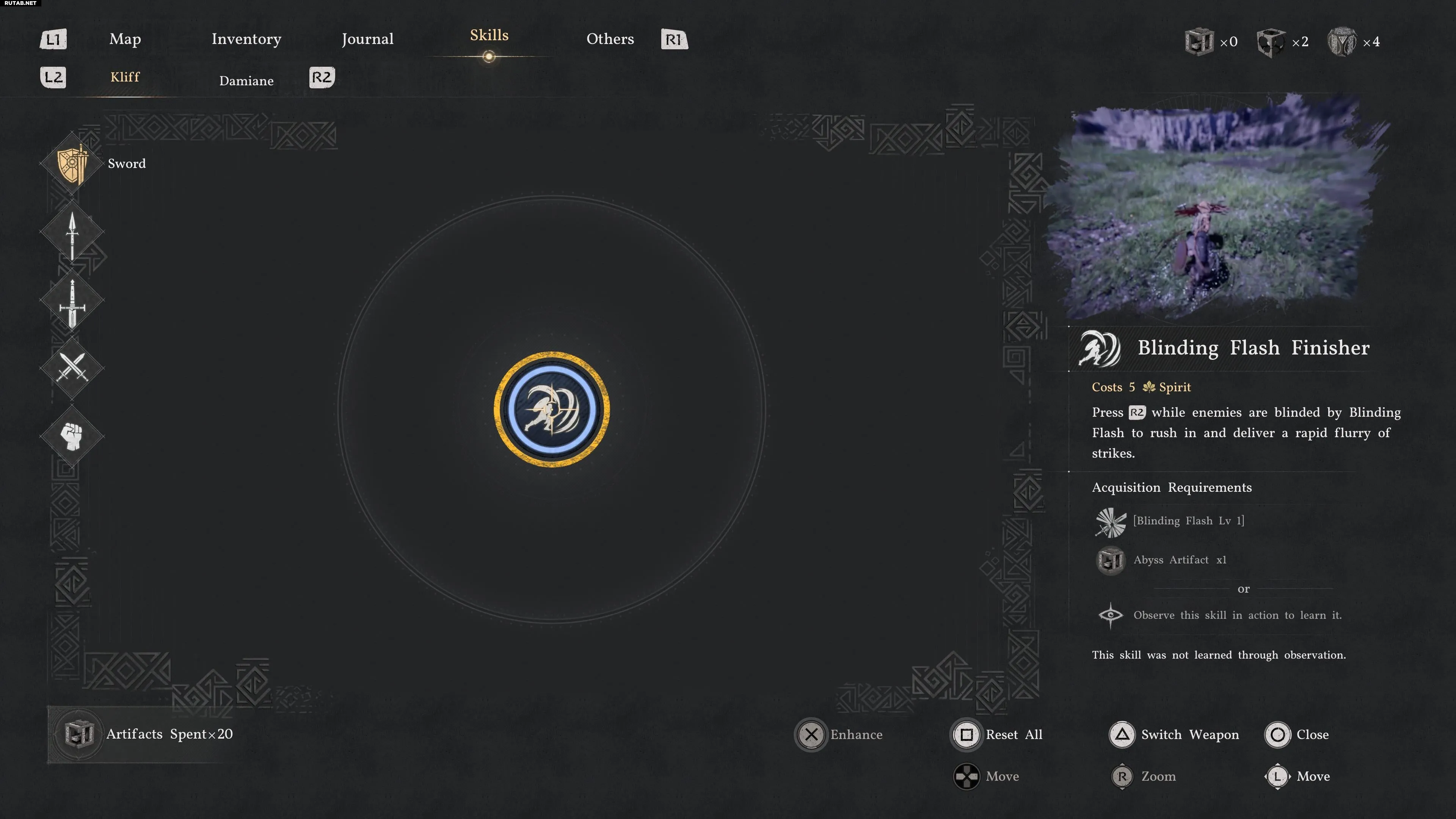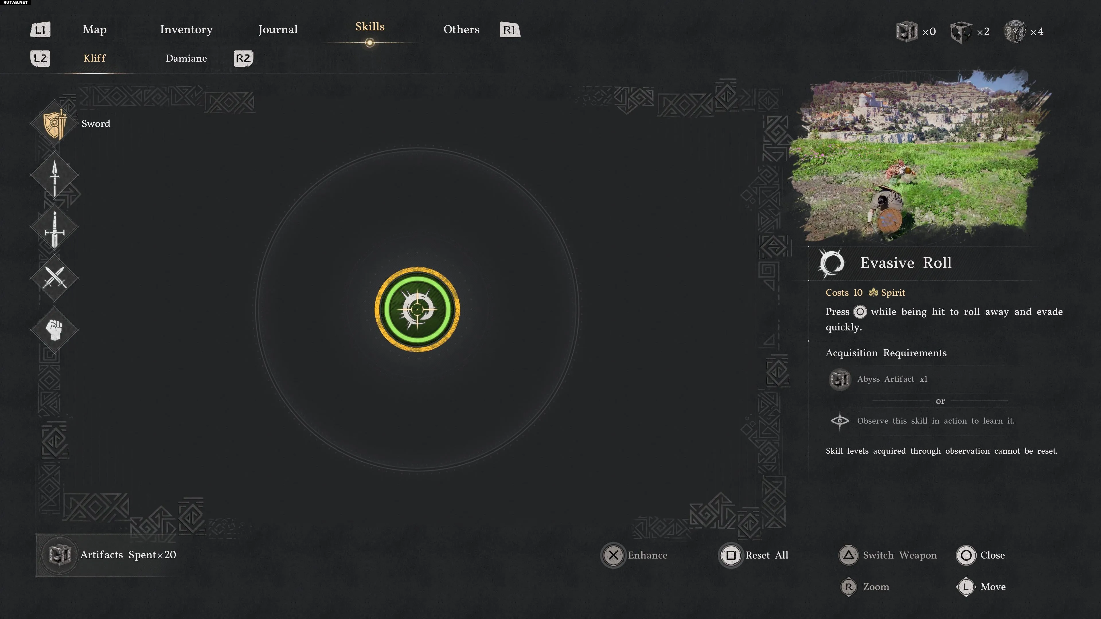 Уклонение с перекатом можно разблокировать за один Артефакт Бездны в ветке навыков духа. Однако мы рекомендуем подождать до конца второй главы. Босс Рогораскалыватель использует этот навык, и Клифф изучит его, увидев это.