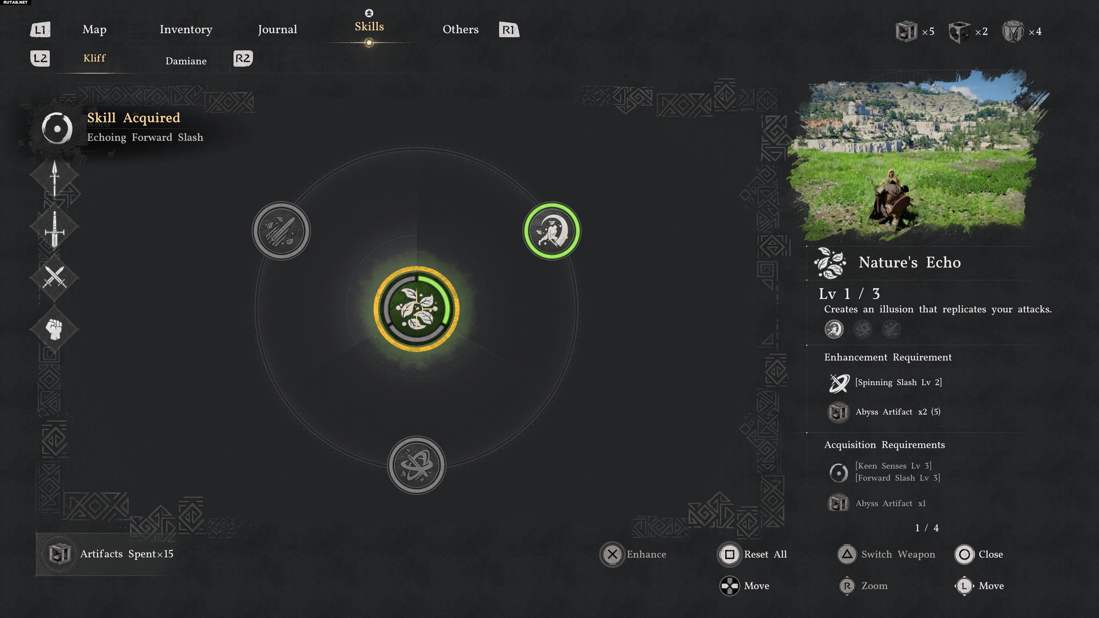 Естественно, столь мощный навык требует серьёзных вложений. Хотя его, по-видимому, можно изучить, наблюдая за миром, в начале игры мы его не встречали, а это умение стоит получить как можно раньше. Вам потребуется прокачать до 3-го уровня как Острое чутьё, так и Режущий удар (что обойдётся в четыре Артефакта Бездны), просто чтобы разблокировать узел Эхо природы в ветке навыков духа.