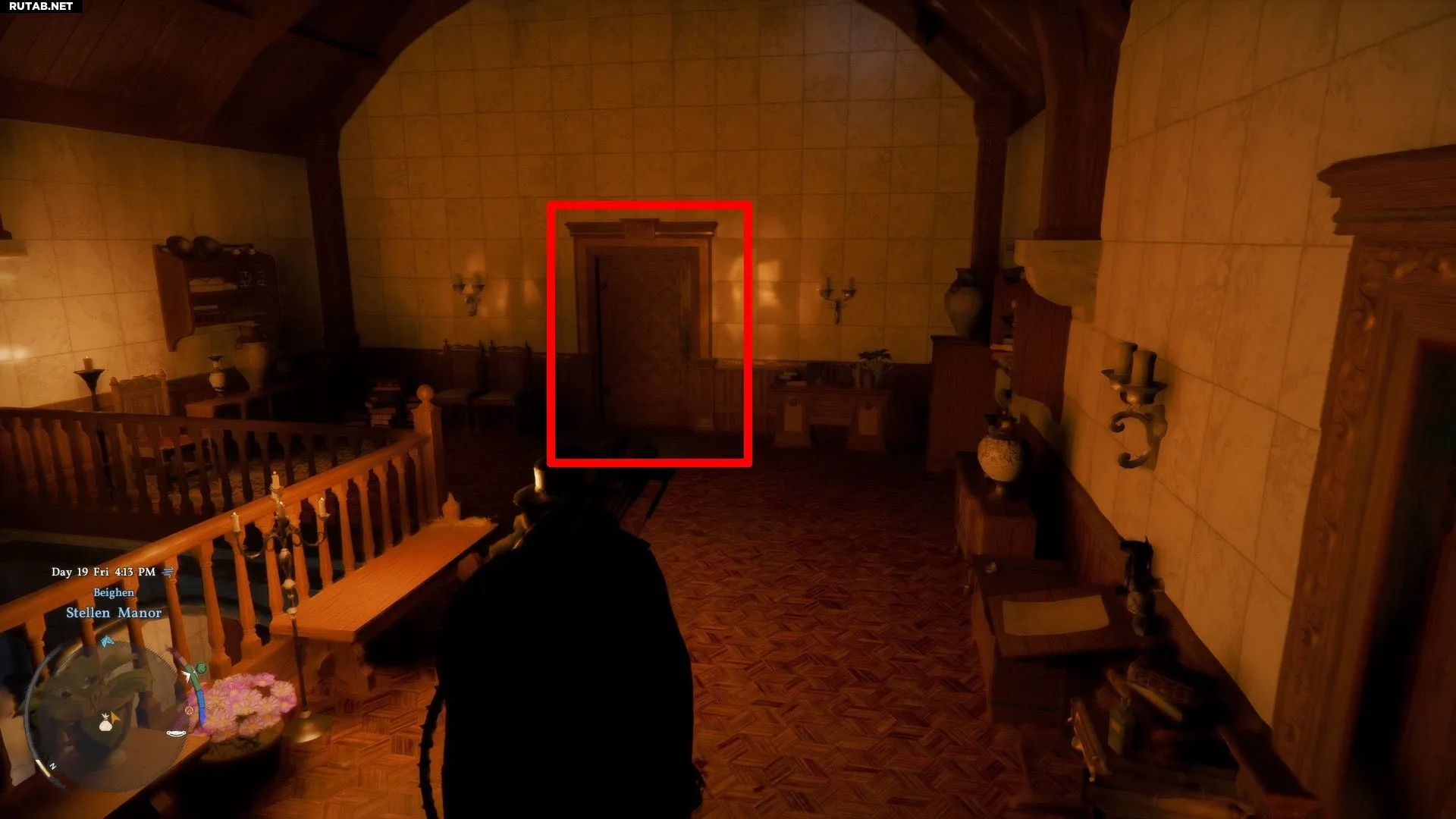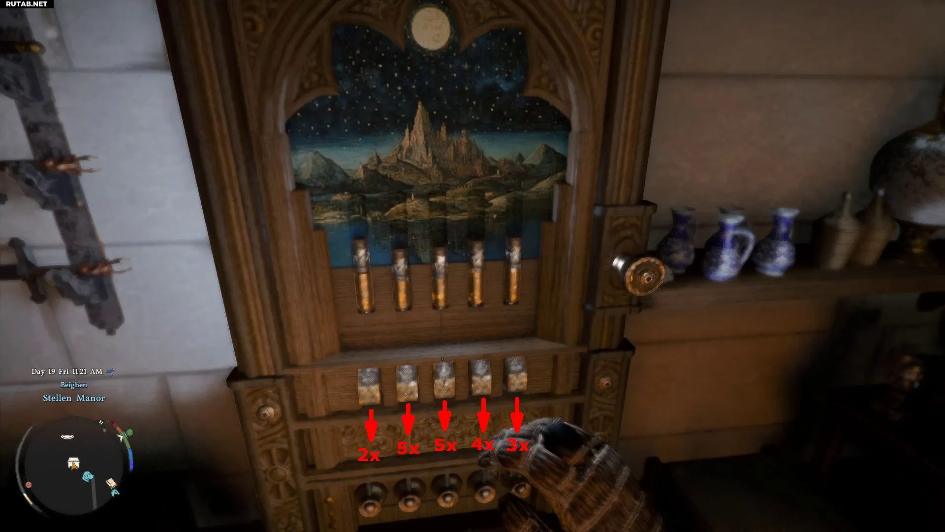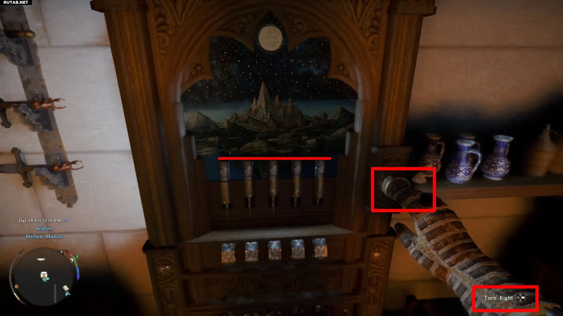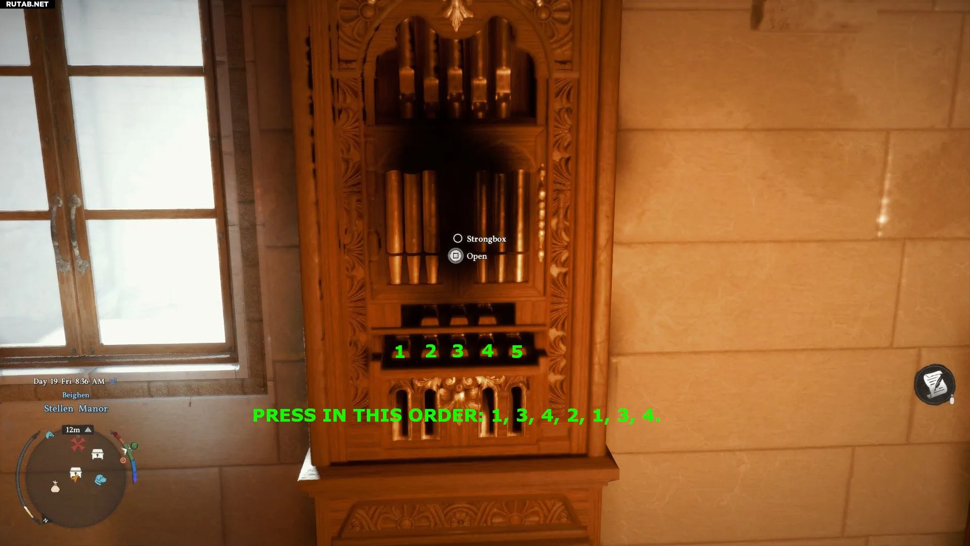 Чтобы попасть в комнату с сундуком, залезьте в окно в юго-западном углу поместья. Взаимодействуйте с механизмом и выполните следующие действия: