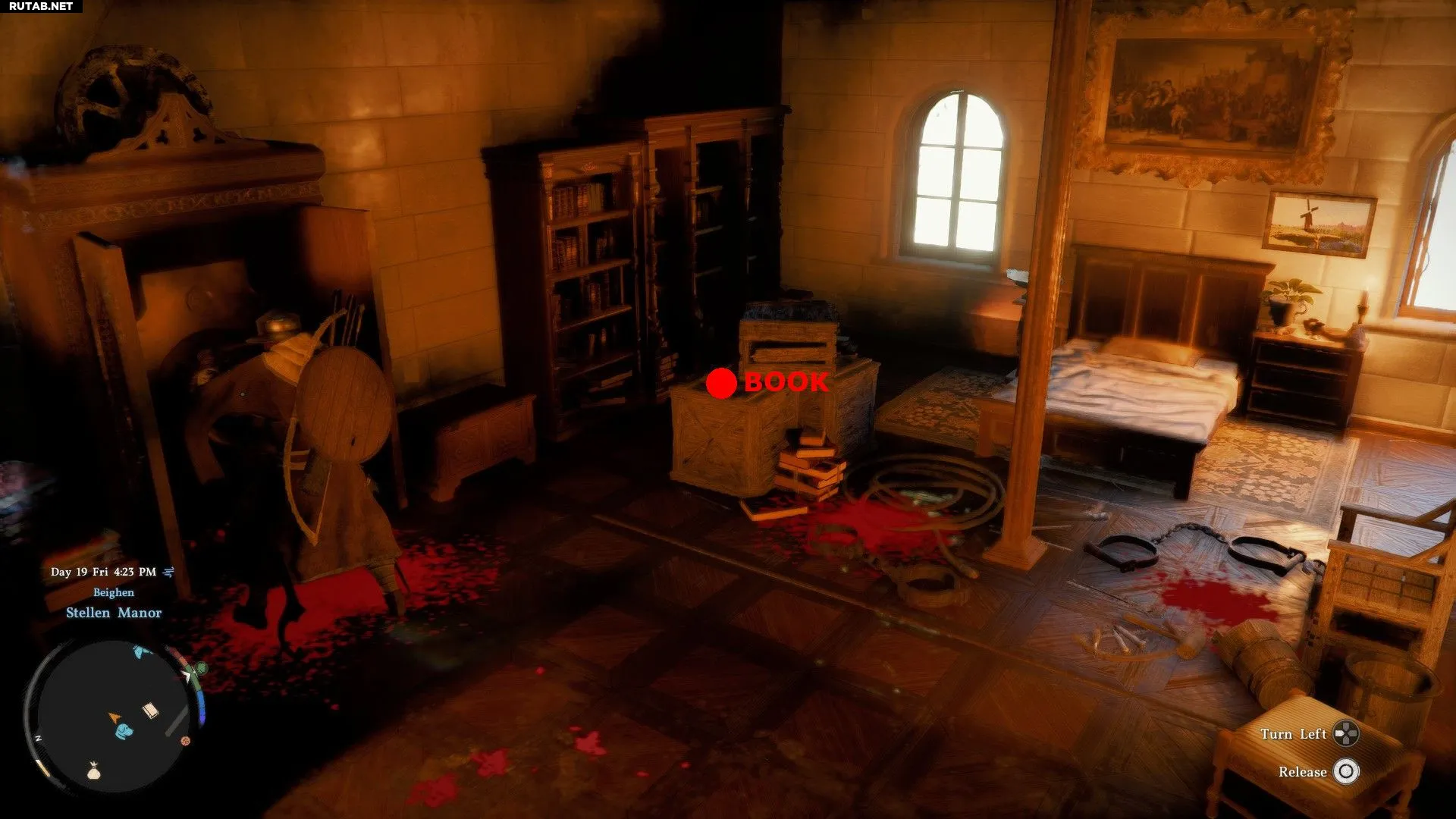 Теперь пройдите в спальню на втором этаже поместья и используйте полученный ключ, чтобы открыть гардероб. Внутри возьмите штурвал и поверните его, чтобы опустить платформу в спальню. Поднимите книгу, лежащую на ящиках на этой платформе.