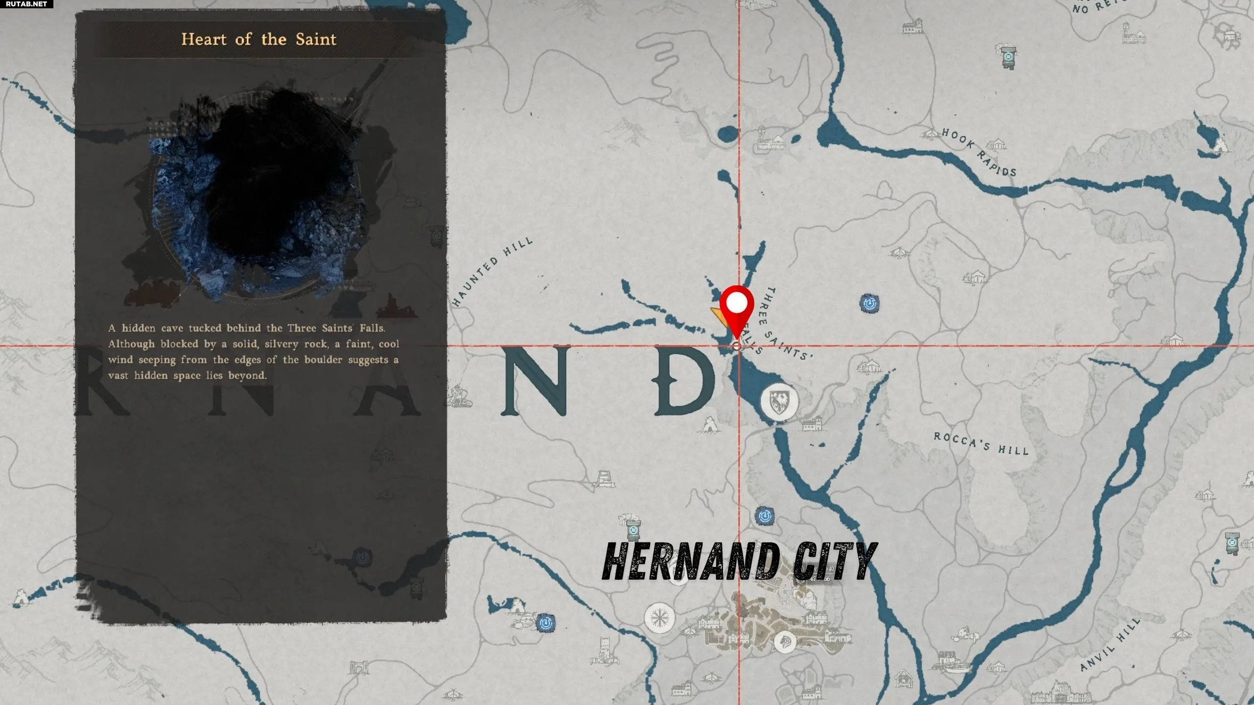 Пещеру с серебряной рудой можно найти к северу от города Хернанд, в водопаде Сердце Святого в районе Трёх Святых Водопадов. Обязательно возьмите с собой кирку, которую можно недорого купить в лавке поставщика в Хернанде.