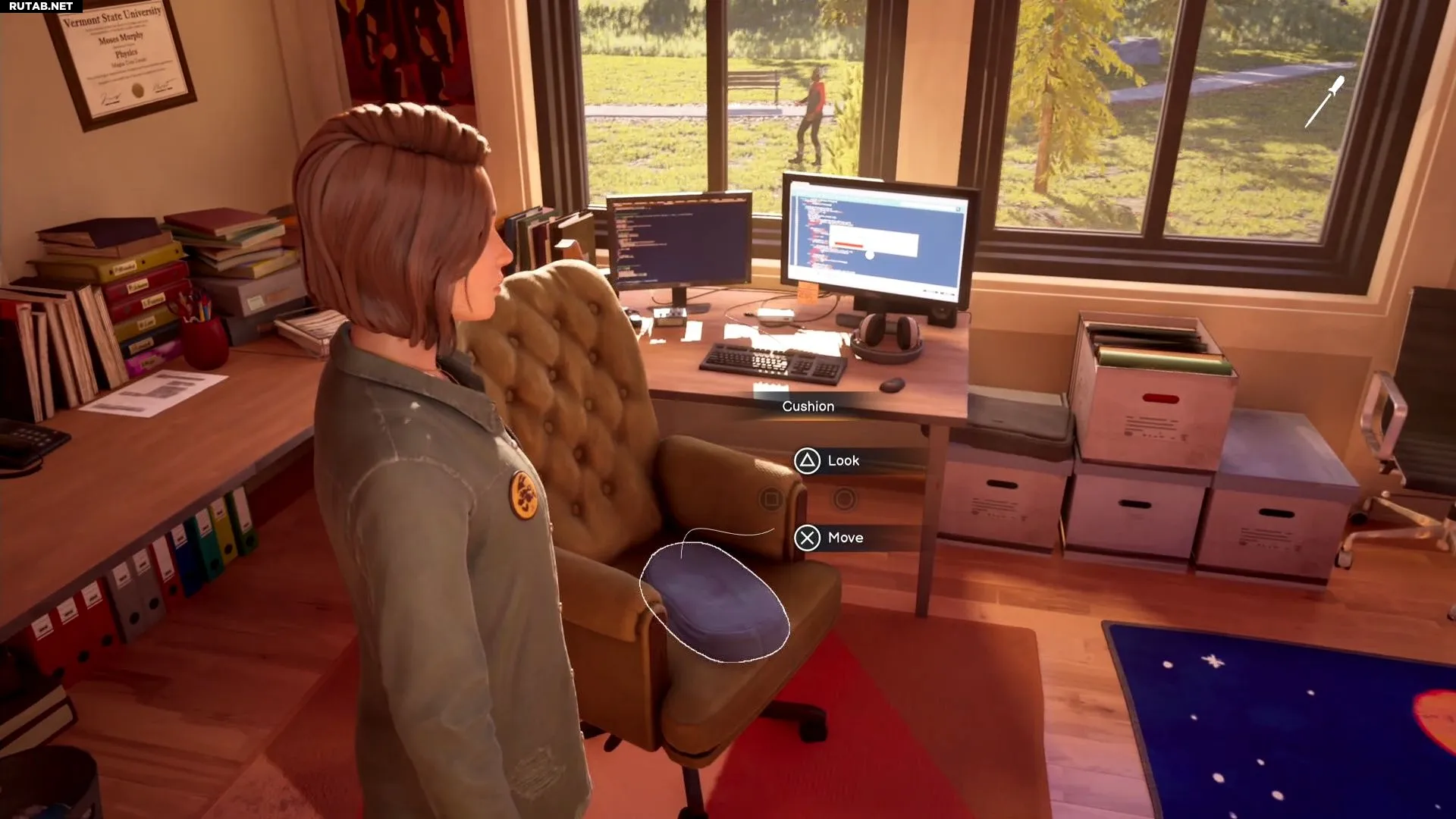Решение — использовать подушку с кресла, которая находится напротив Моисея, рядом с его компьютером. Положите ее под шкаф перед открытием. После того как кружка окажется у вас, перемотайте время, чтобы восстановить дверцу. Не беспокойтесь, кружка останется в вашем инвентаре после перемотки. Затем просто поговорите с Моисеем, чтобы завершить испытание.