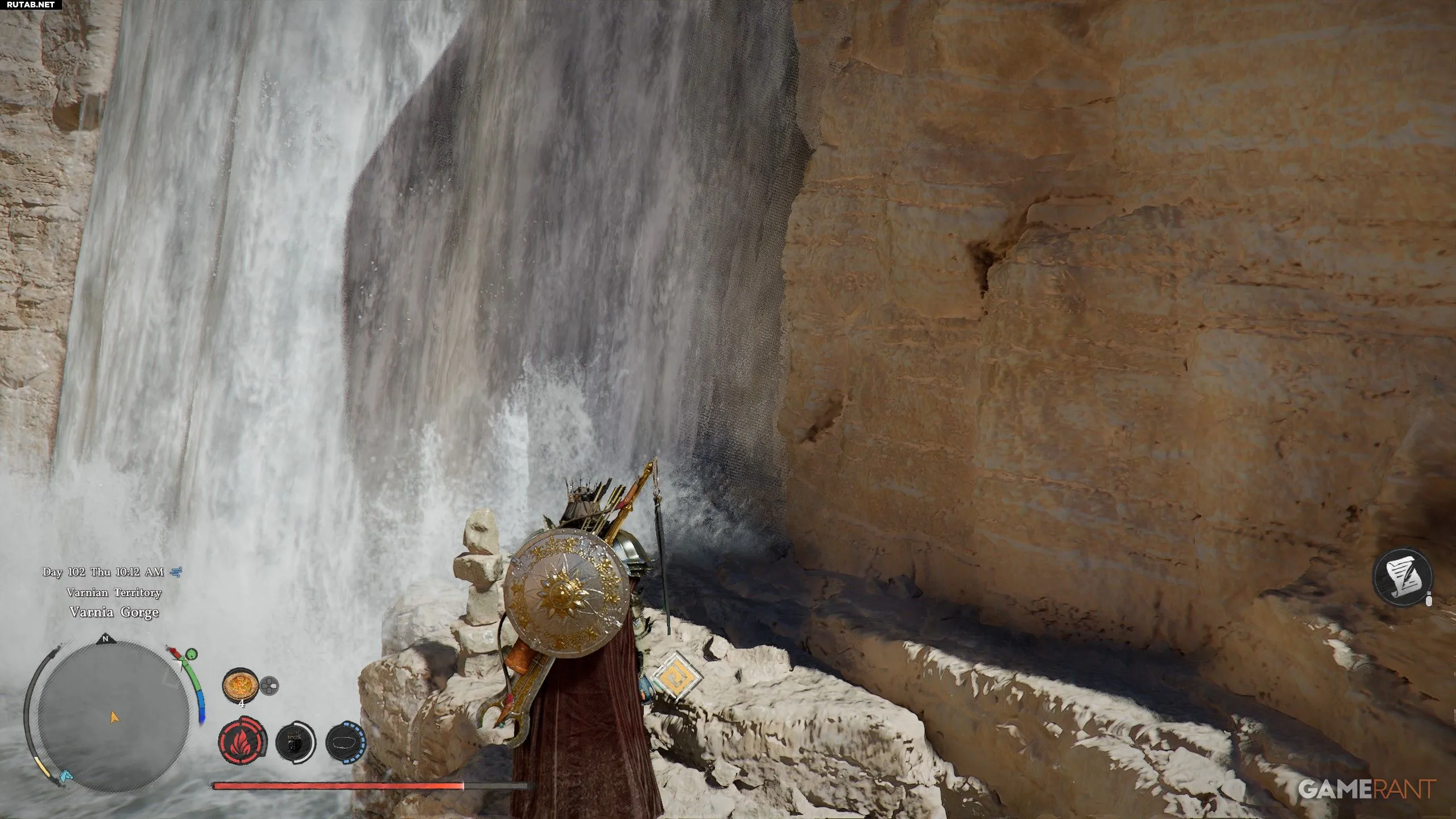 - Внизу, в Ущелье Варнии, найдите водопад. Чтобы пройти сквозь него, используйте навык «Укол» (R1+Треугольник).