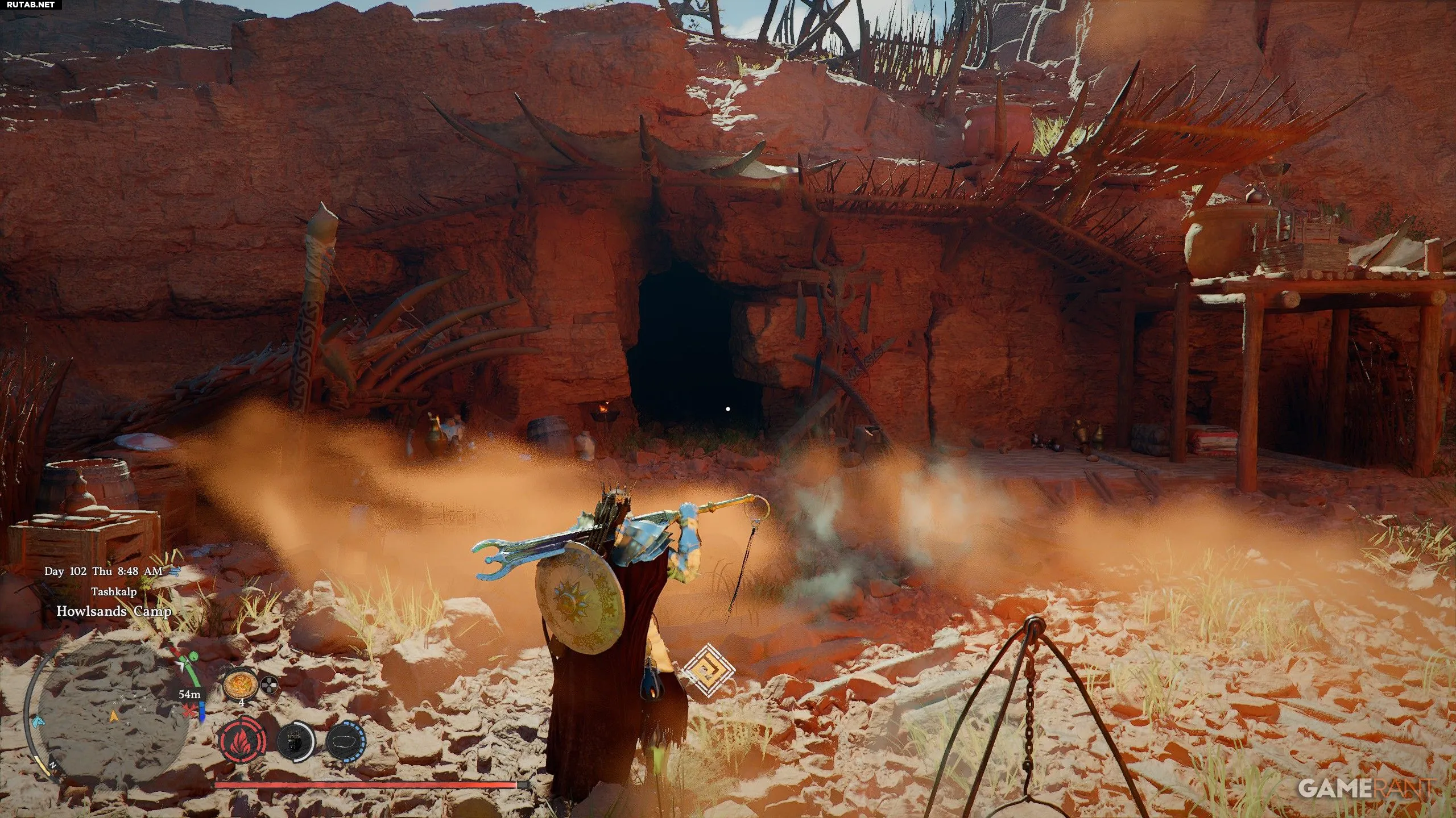 - Местоположение: Внутри небольшой пещеры к востоку от Лагеря Воющих песков, к северу от буквы «M» в «Crimson Desert».