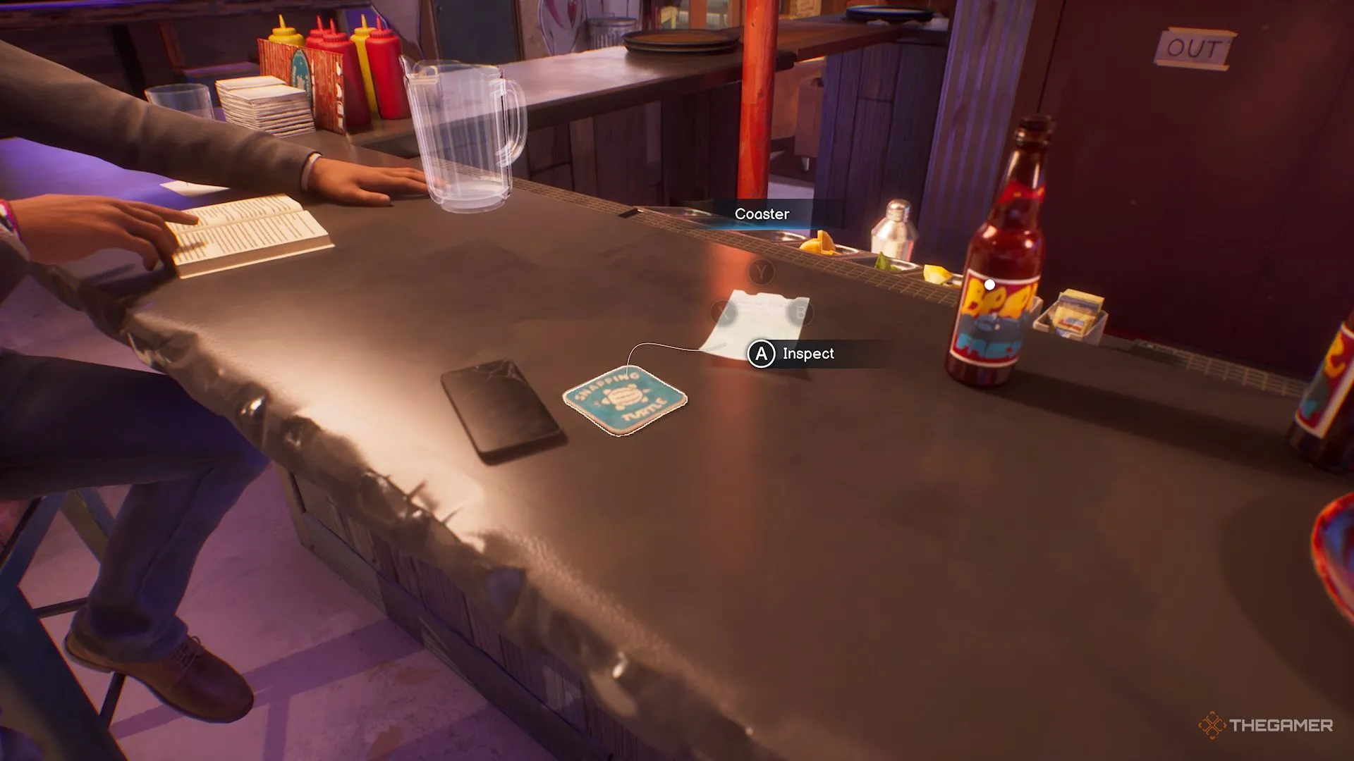 Пока вы сидите за барной стойкой от первого лица, осмотрите синий подстаканник «Щелкающая черепаха», который находится слева от вас. Переверните его, чтобы увидеть набросок на обратной стороне. Это и есть нужный коллекционный предмет.