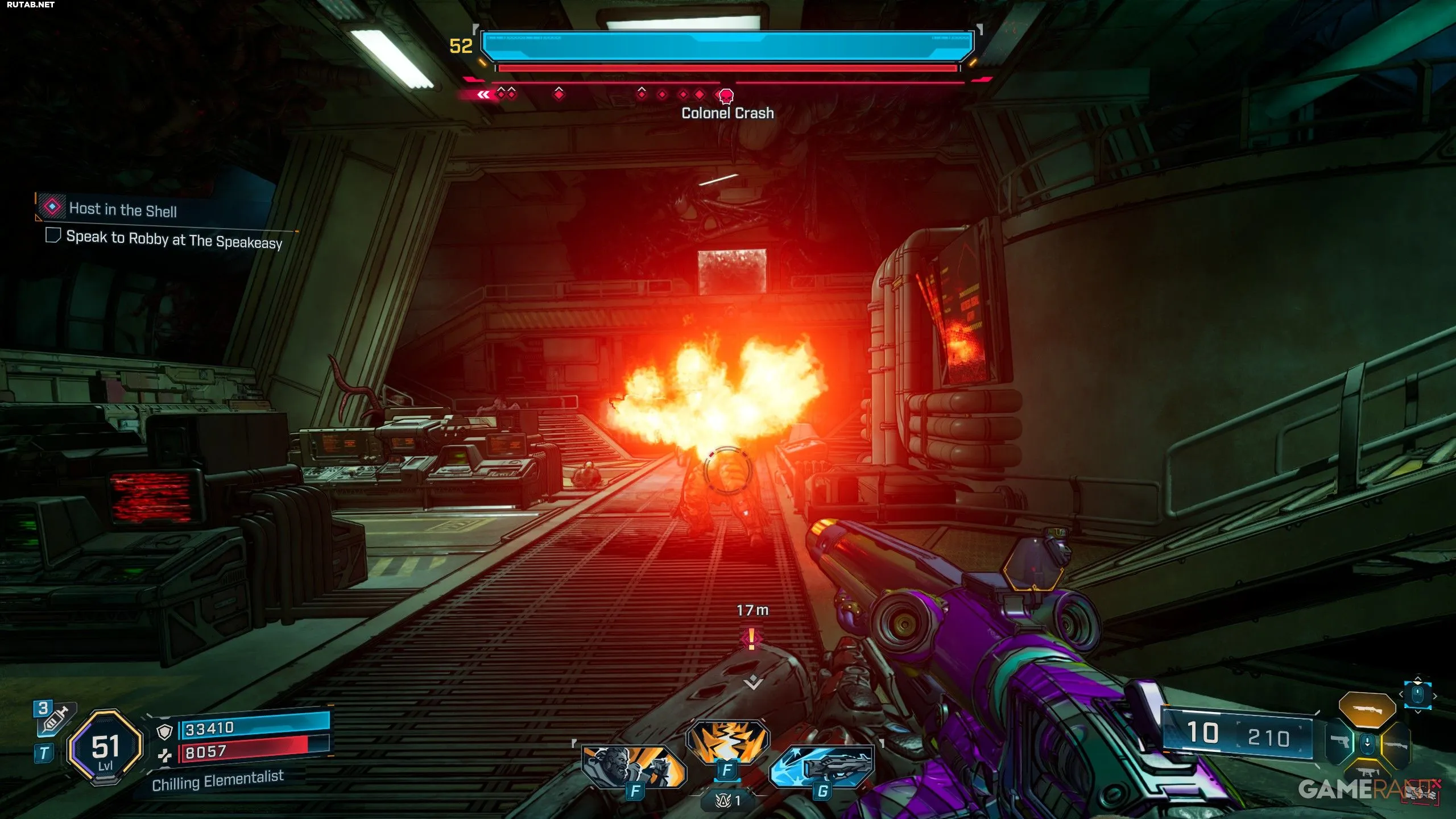 - Первая шкала здоровья Колонела Крэша — щиты (синяя), поэтому используйте шоковое и радиационное оружие.