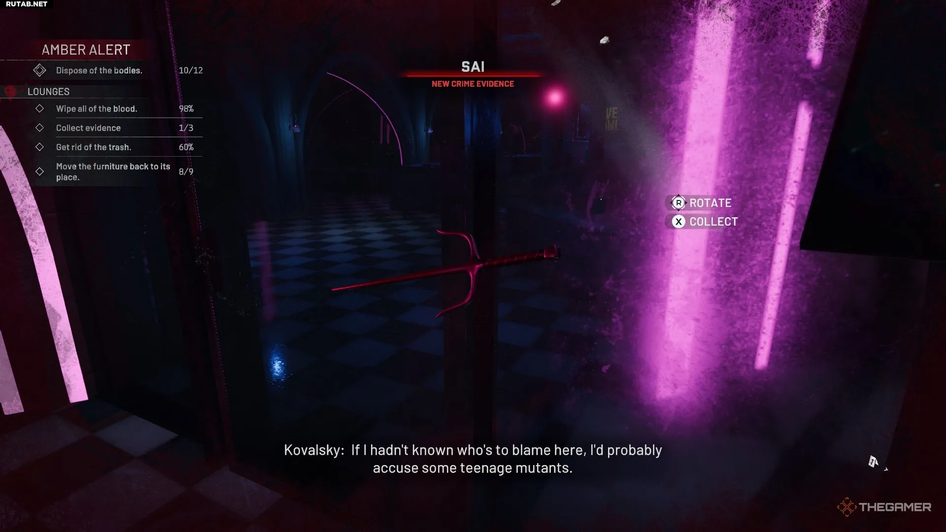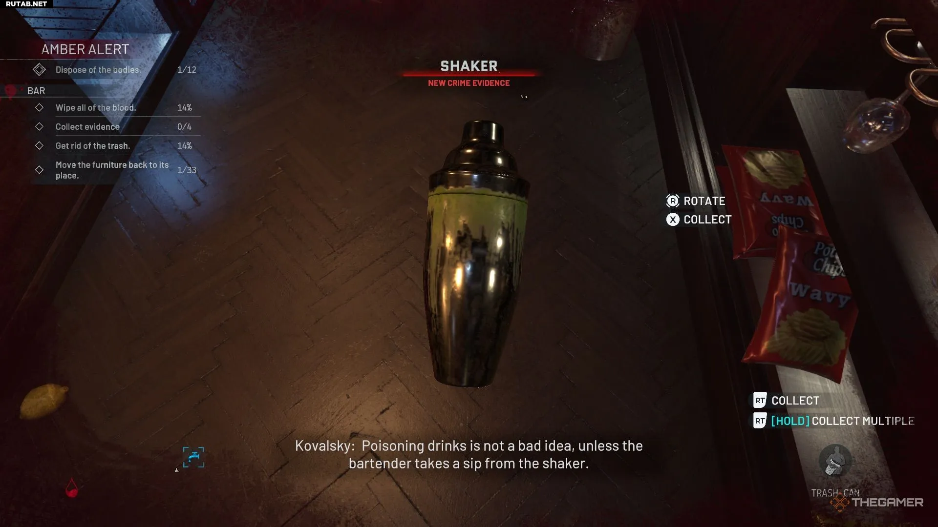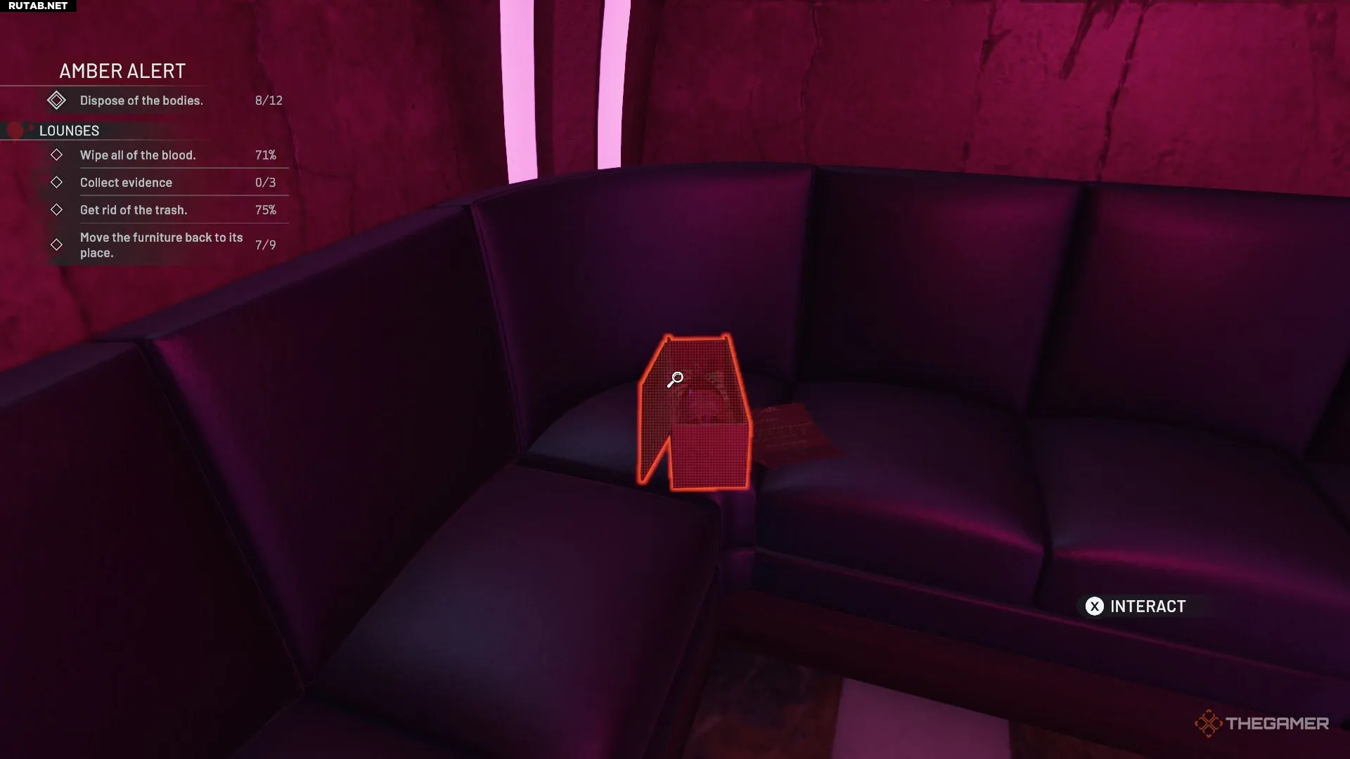 Прямо у лестницы, ведущей в лаунжи, лежит тело. Избавьтесь от него, затем приберитесь в зоне и расставьте мебель по местам. В приватных комнатах со стриптиз-шестами можно найти ценности. С другой стороны вас ждёт огромный беспорядок, два тела и улики на сиденьях.