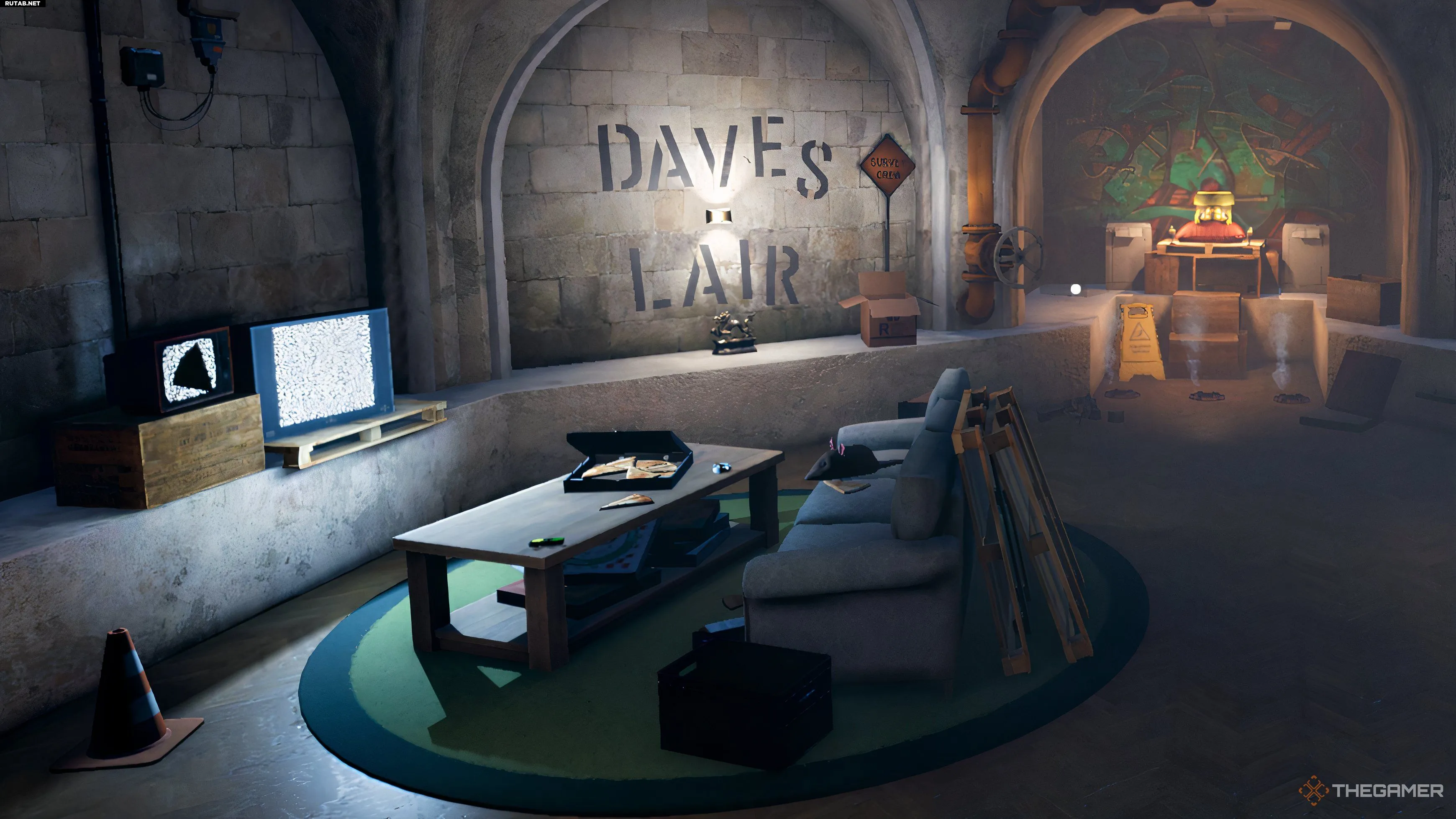 Чтобы попасть за доску для дартса и найти секретную зону, нужно набрать ровно 301 очко за три попытки. Сделав это, вы обнаружите лестницу, ведущую вниз, в «Логово Дэйва».