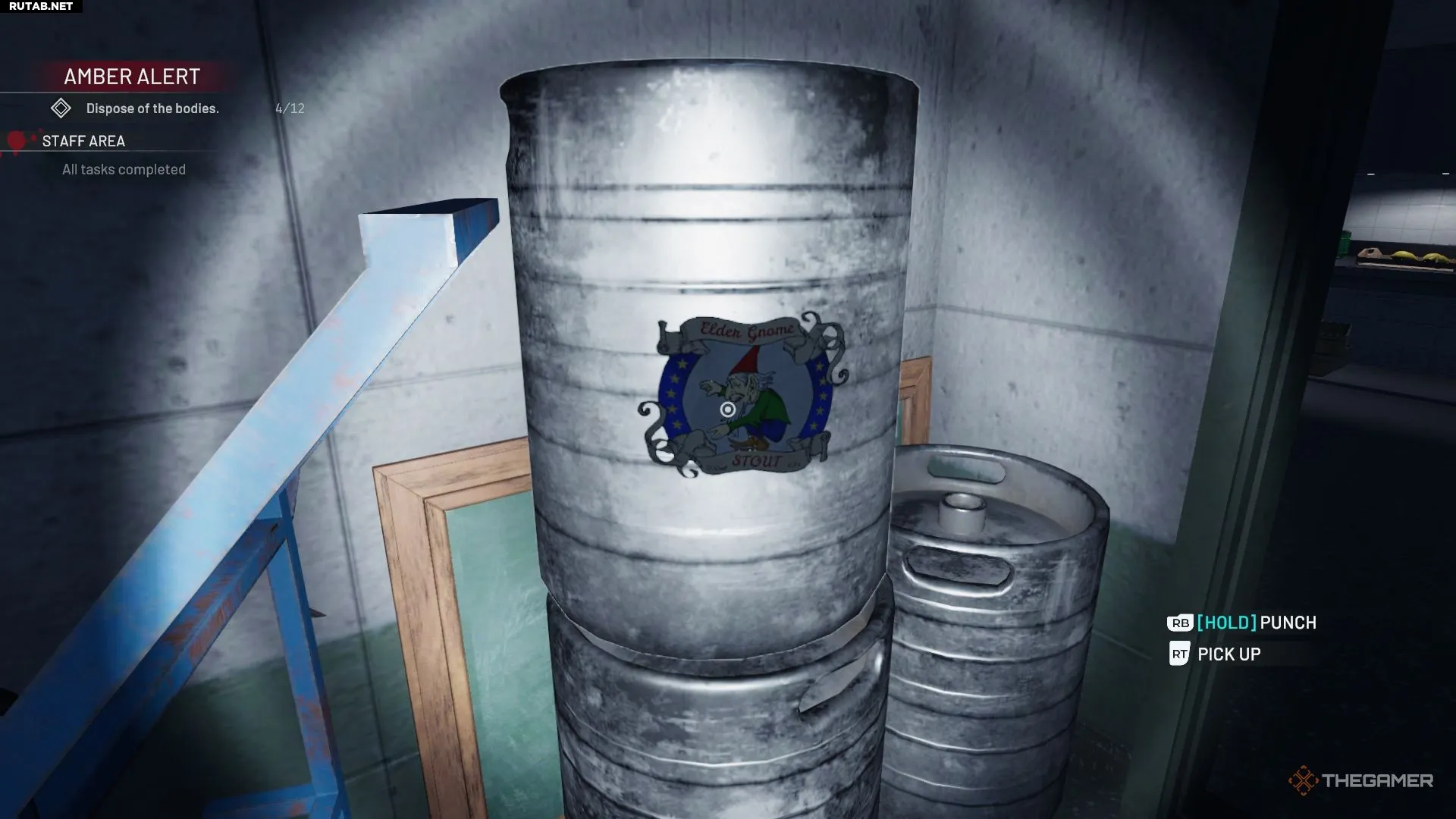 Возьмите бочонок у двери на кухню с этикеткой Elder Gnome Stout (остальные бочонки без этикеток, так что его легко найти) и отнесите его на свободное место слева от точки с ведром на кухне.