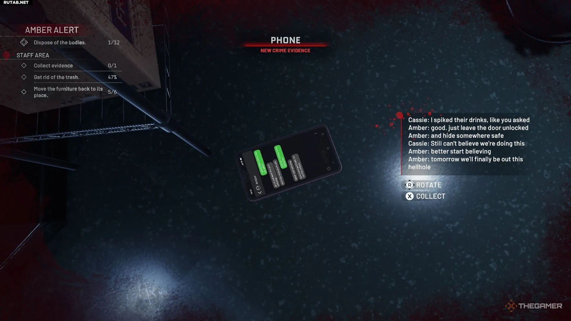 Заберите два ценных ожерелья и кольцо из боковой зоны, а также осмотрите плюшевого мишку с запиской, прежде чем двигаться дальше. На следующем лестничном пролёте кровь на полу и стенах. Уберите её и найдите на полу телефон (улику).