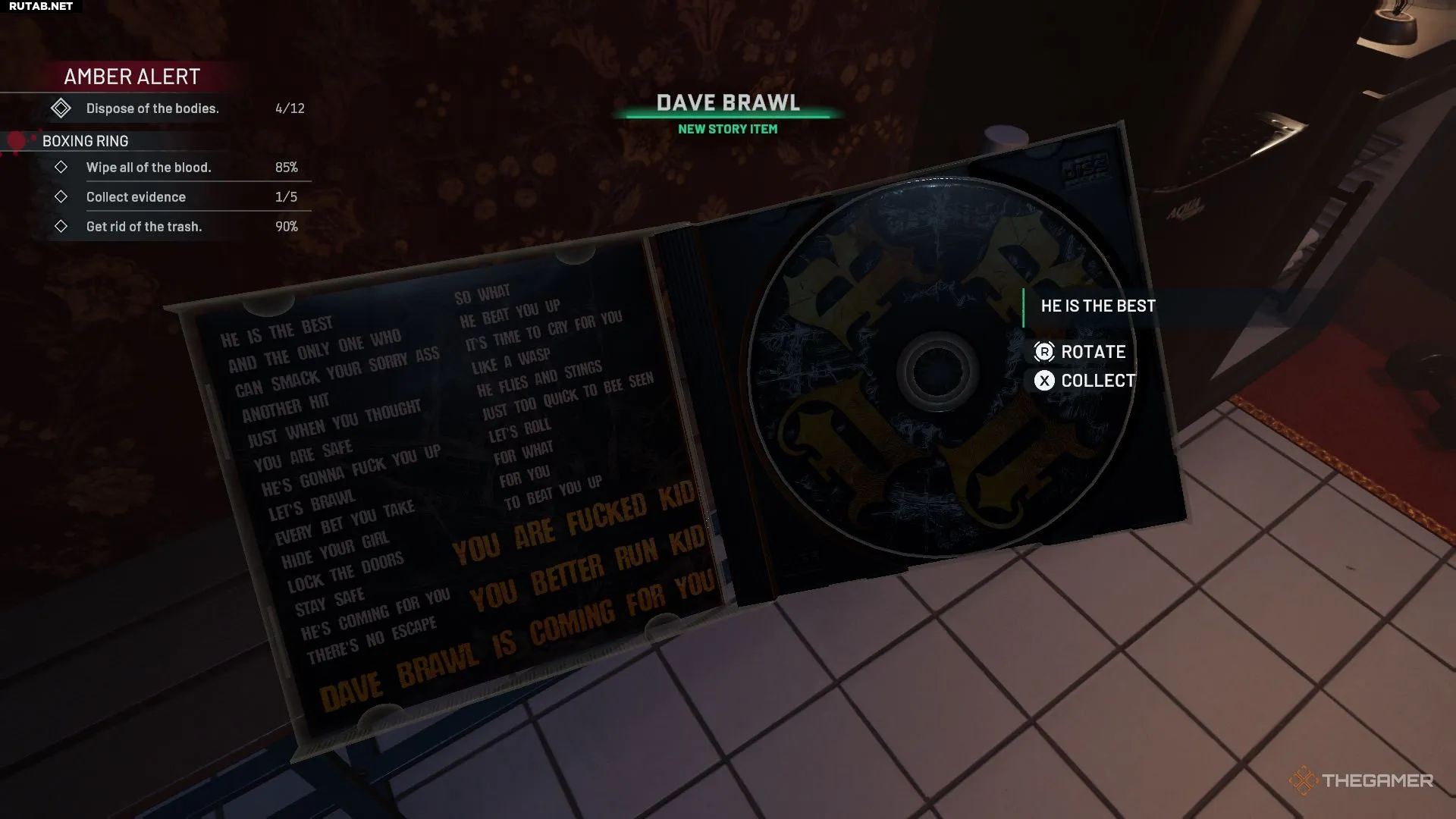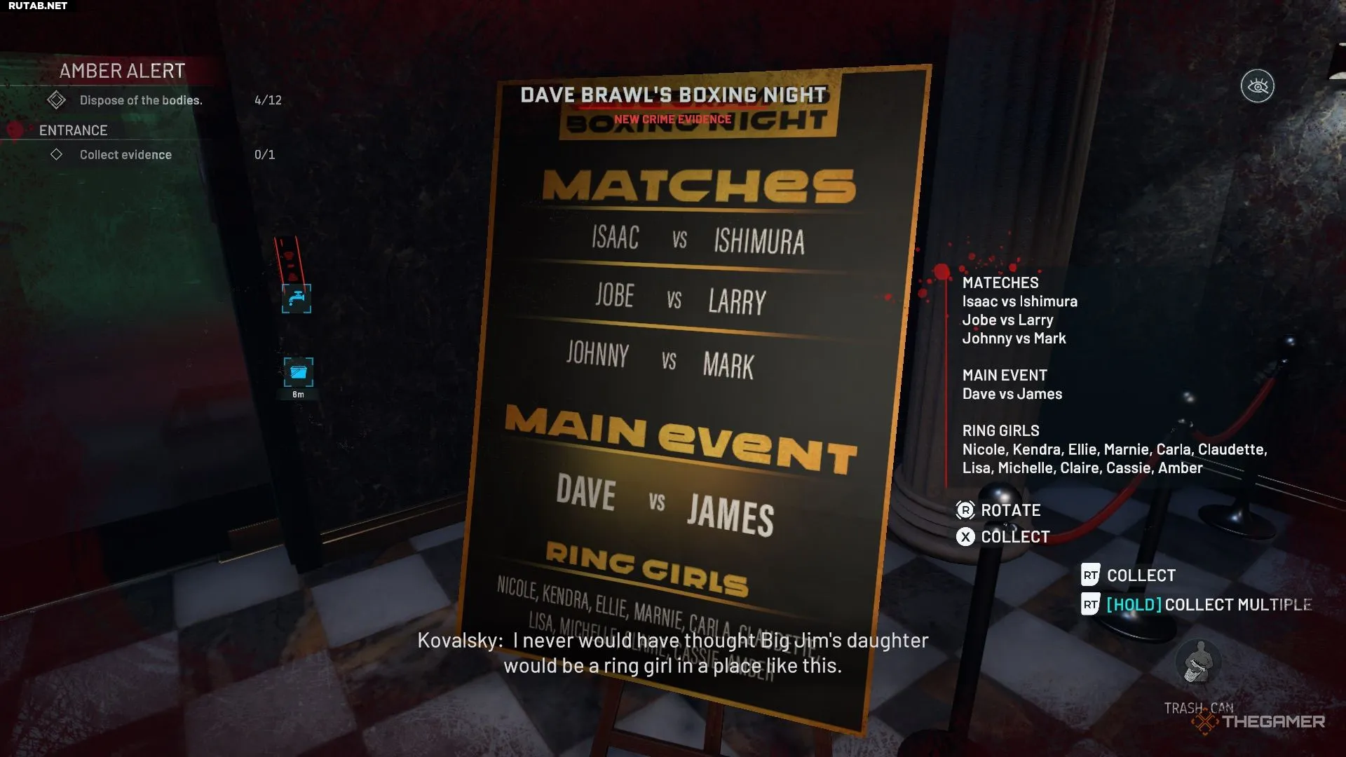 Это очень небольшая зона для уборки: одна большая кровавая полоса на красном ковре и стенд с афишей (улика), который нужно убрать. Заберите ценную статуэтку со столика сбоку и деньги слева от двери. Двойные двери слева ведут к вашему контейнеру у точки старта, а двери прямо впереди — вниз, к боксёрскому рингу. Открыть их нельзя без VIP-карты, которую вы подобрали ранее.