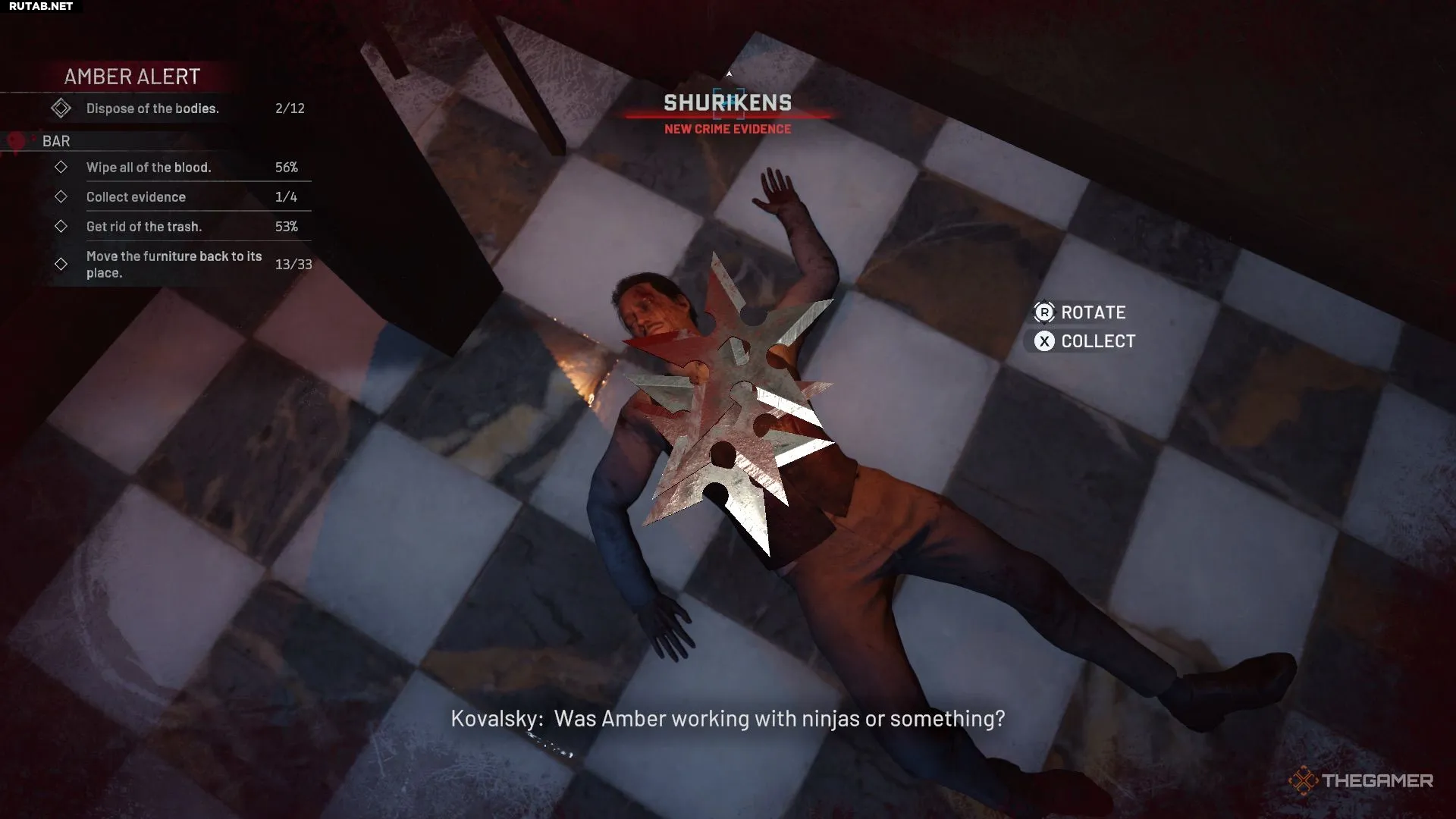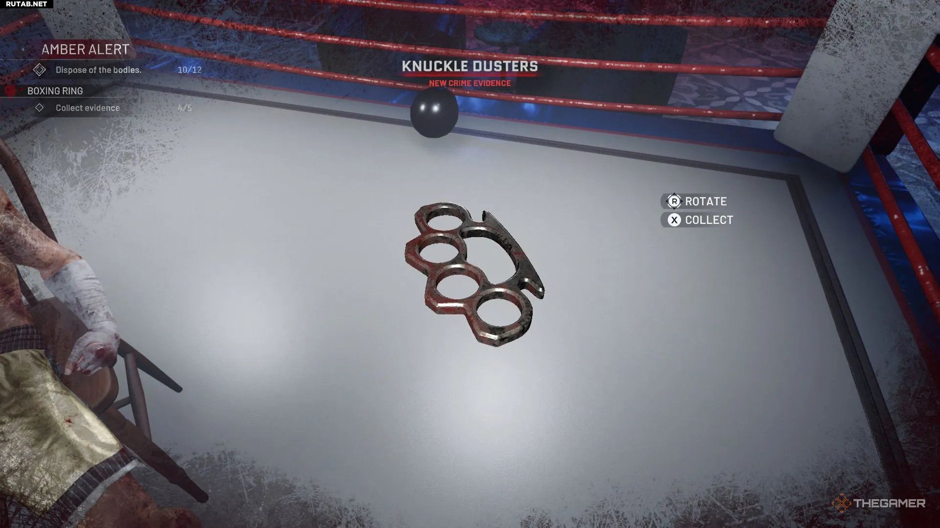 Теперь, когда ринг открыт, можно закончить уборку. Подберите катану (улику) и кастет (улику), а также избавьтесь от тела. Стул, на котором сидело тело, нужно вернуть в основную зону бара.