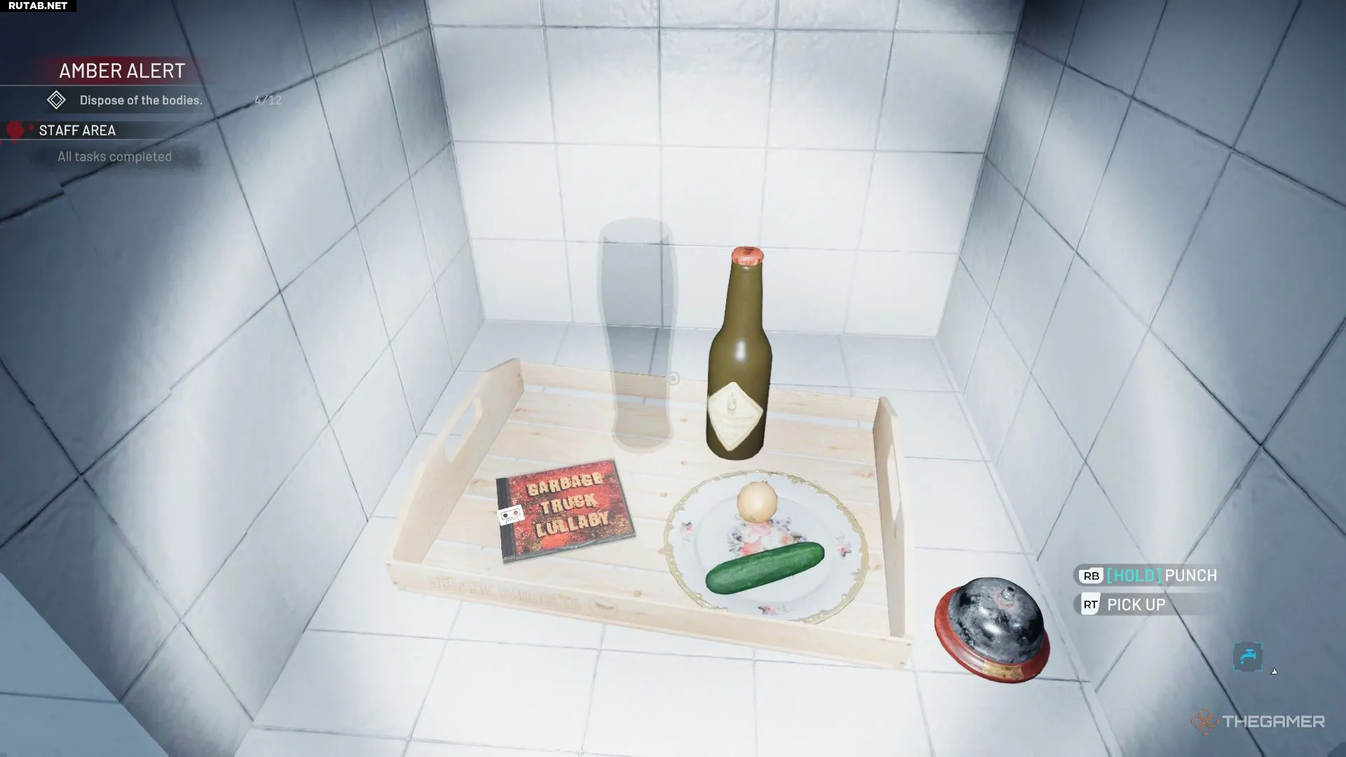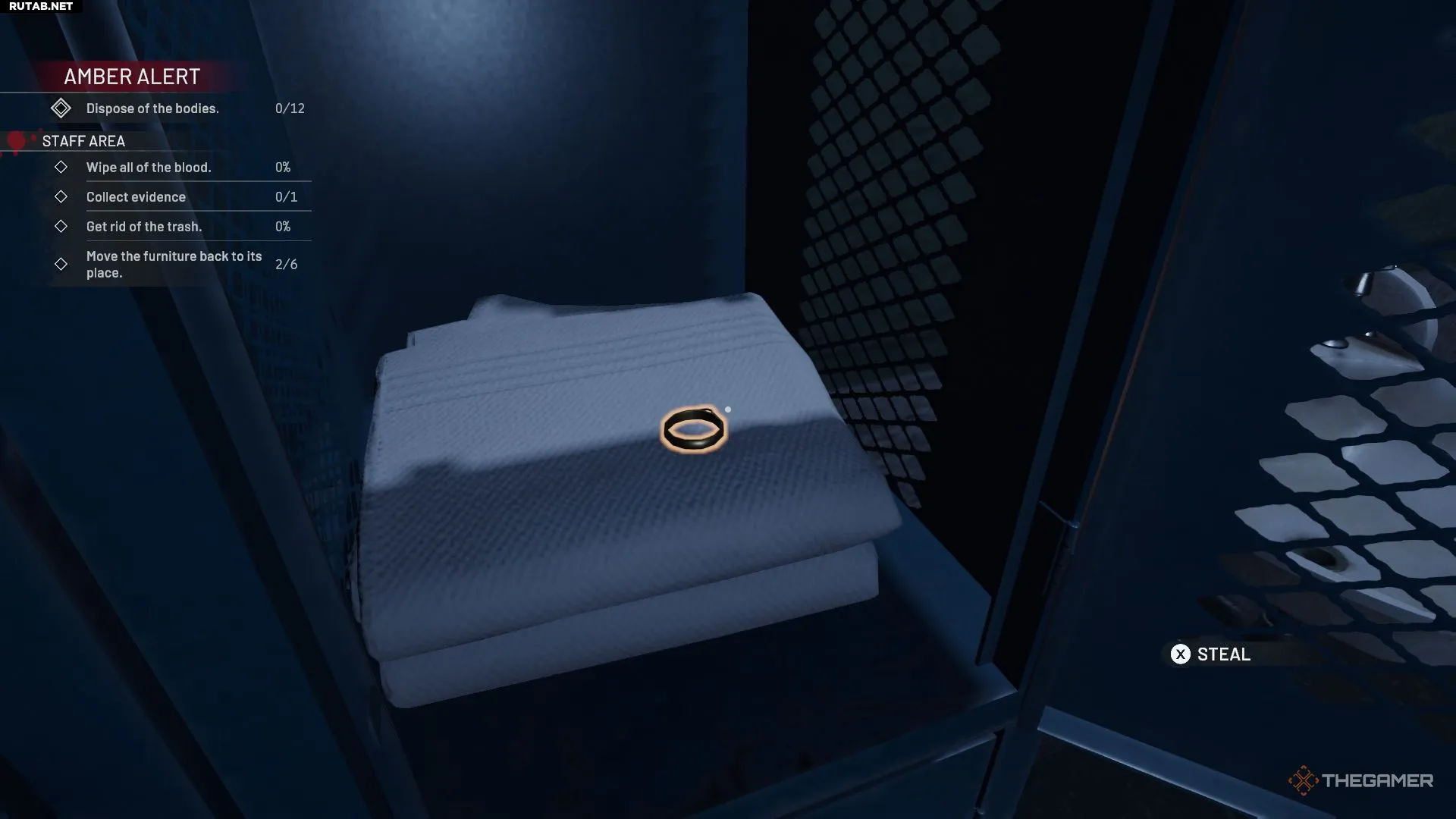 В служебной зоне на полу лежит тело. Поднимите его и поместите в контейнер. Вытрите кровь и поставьте два стула на место. В одном из шкафчиков возле ступеней можно украсть ценное кольцо.