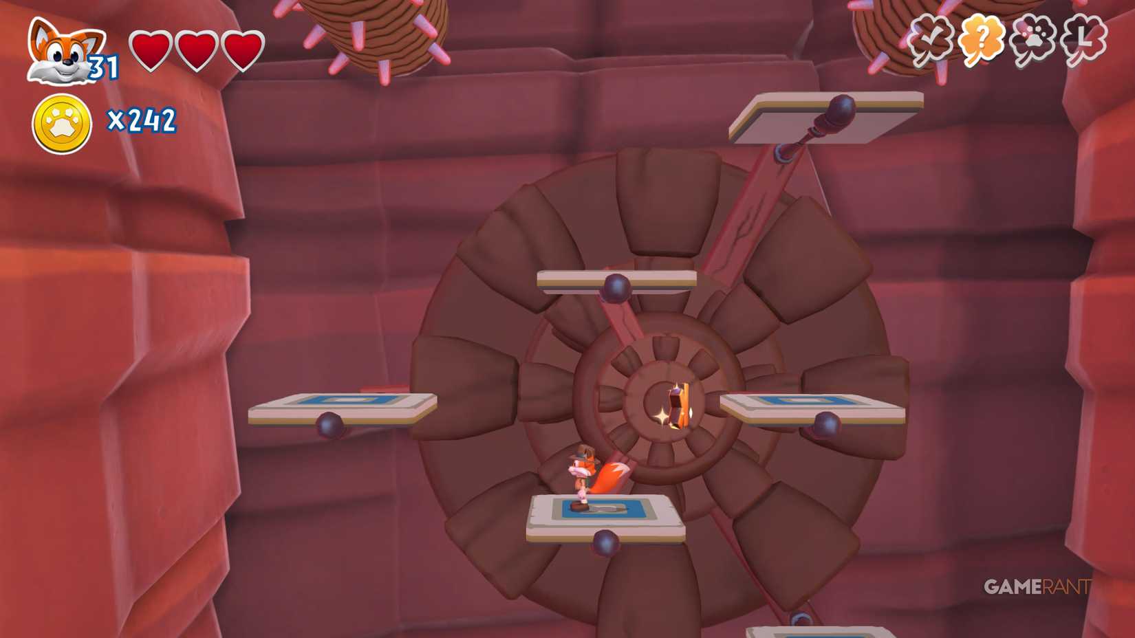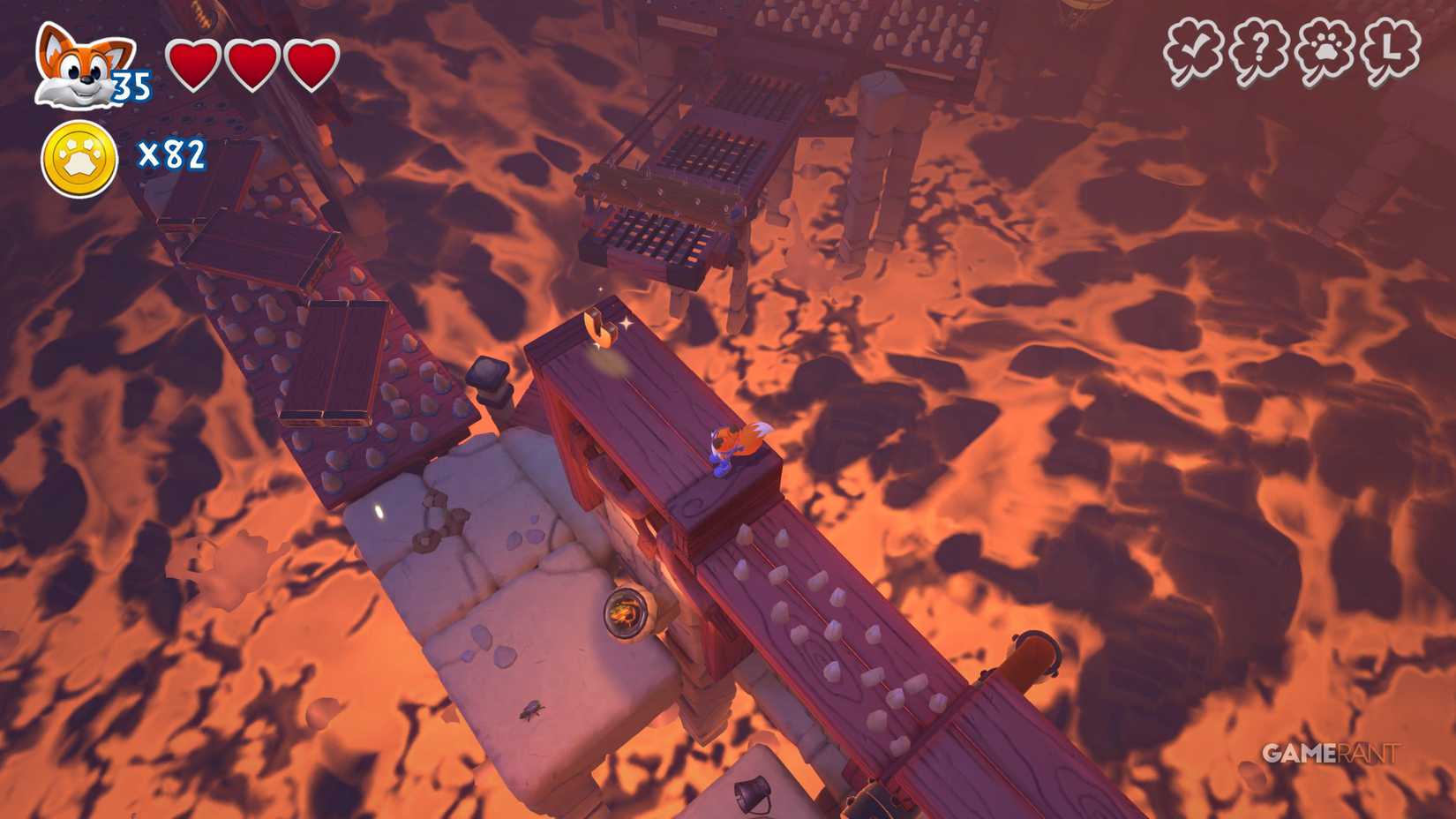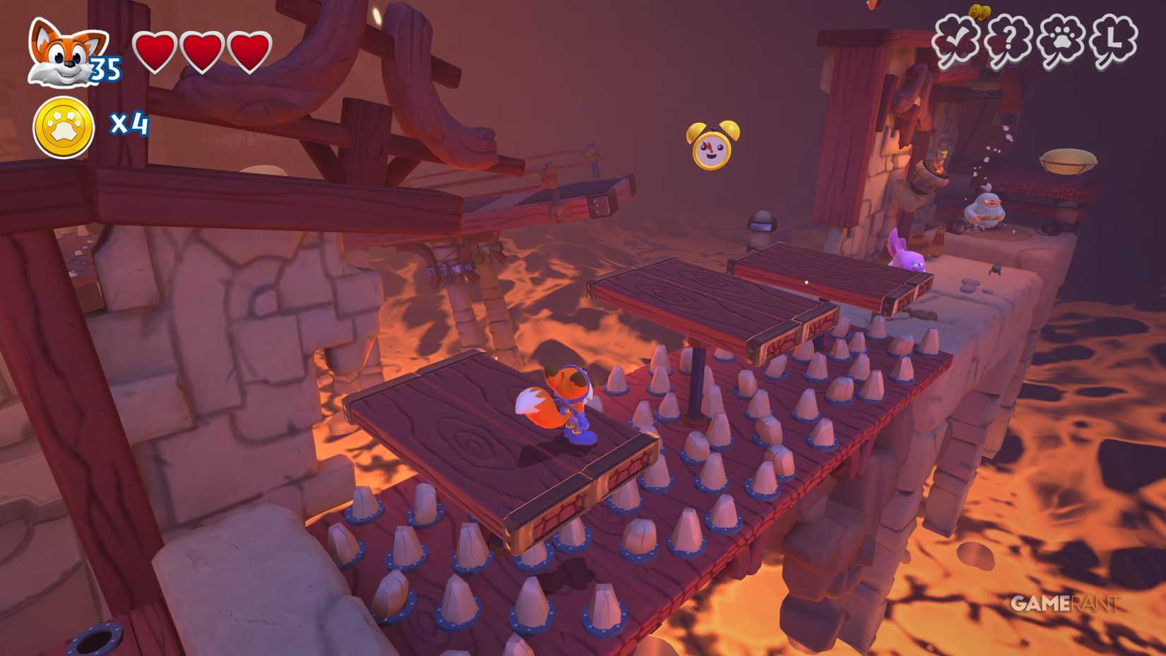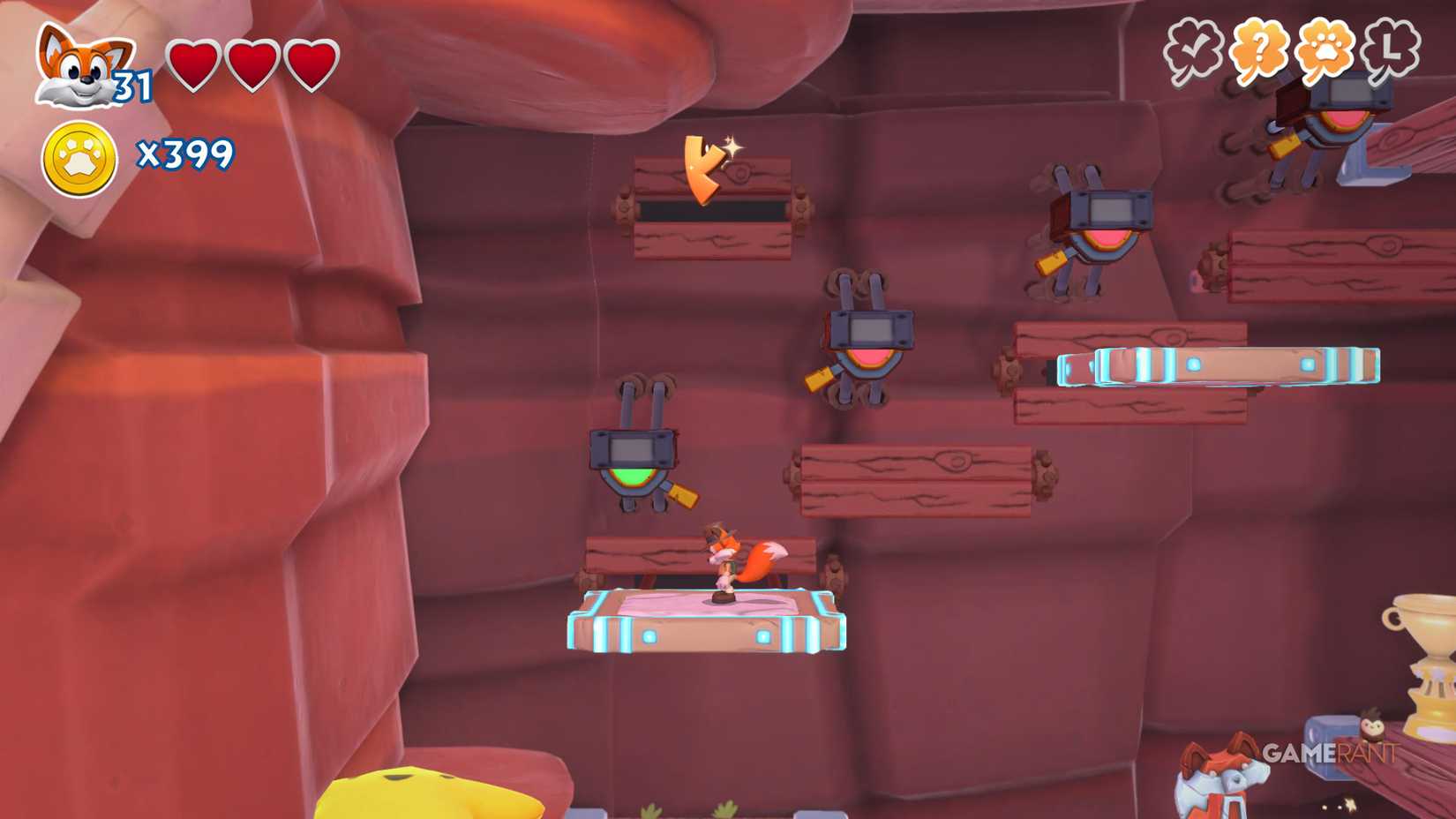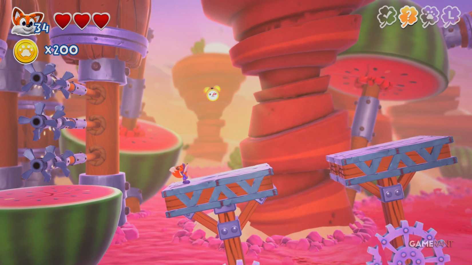 На этот раз идите по правому пути. После чекпоинта продолжайте движение вправо, мимо испытания на время. Наверху вы увидите три фиолетовых цветка. Уничтожьте их, чтобы открыть лисью нору, ведущую к скрытой странице.