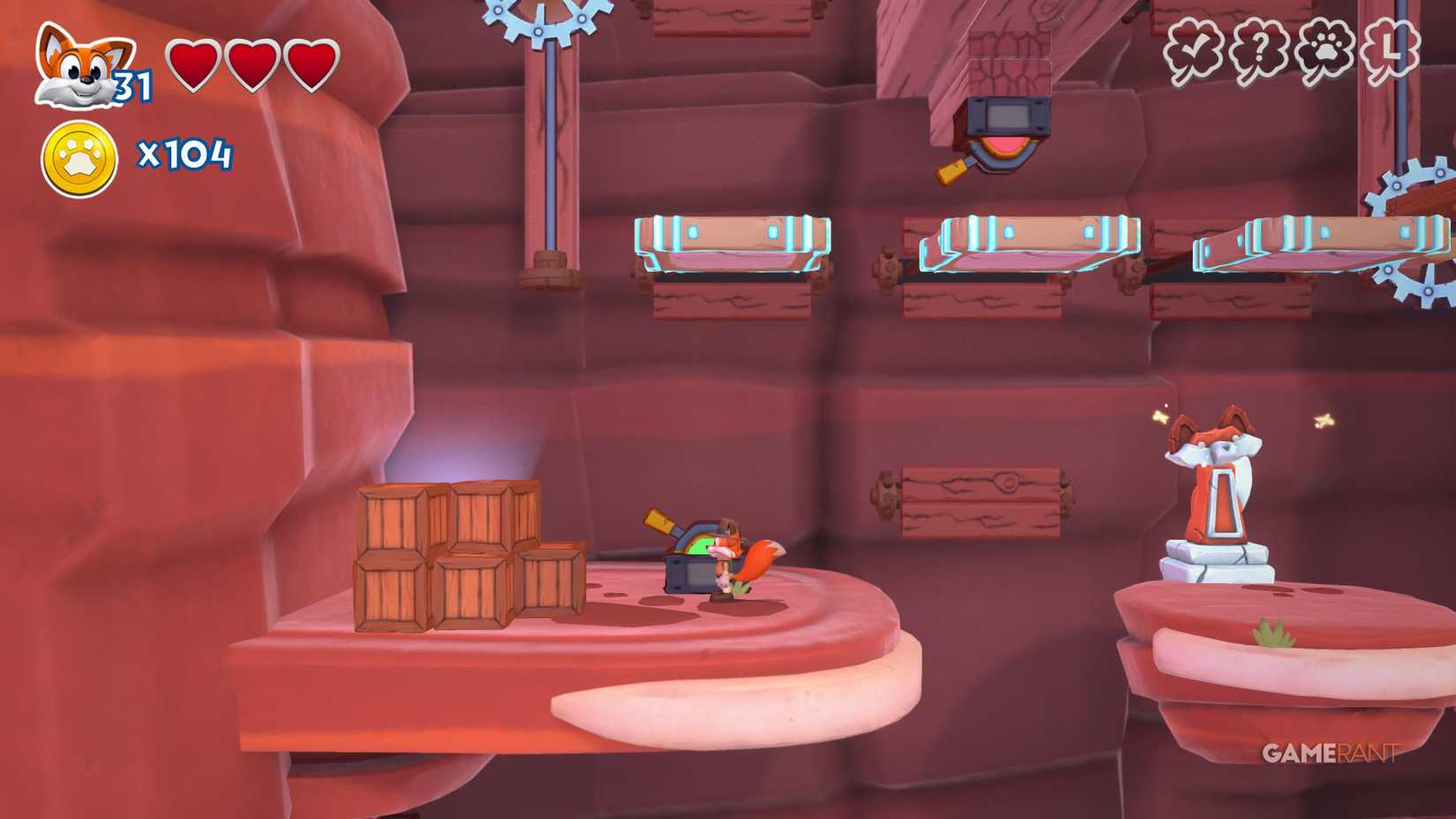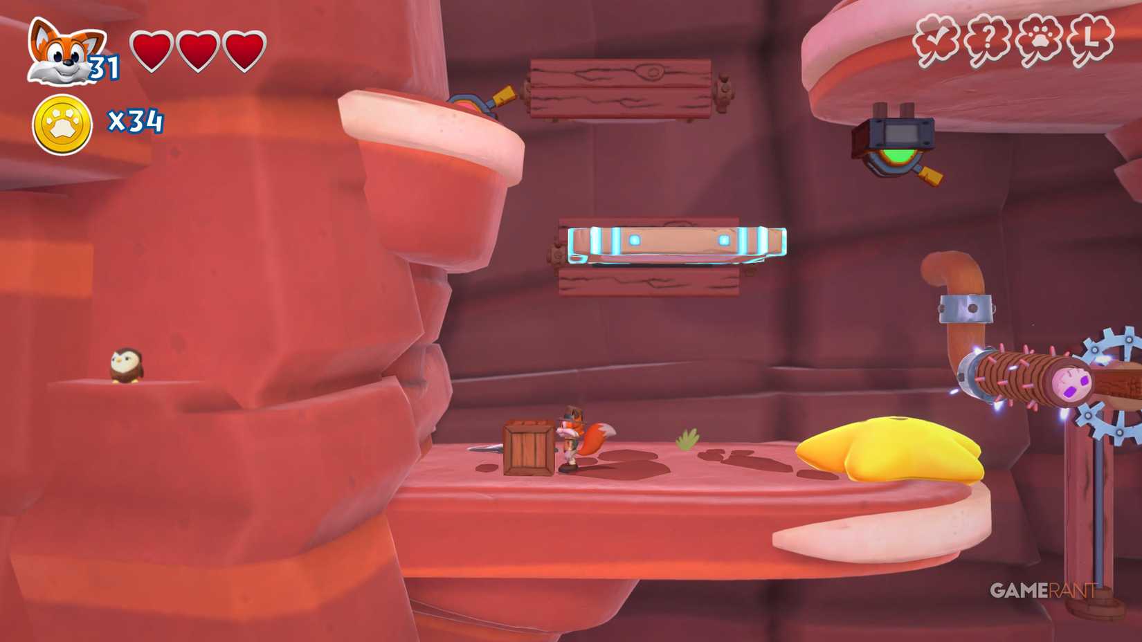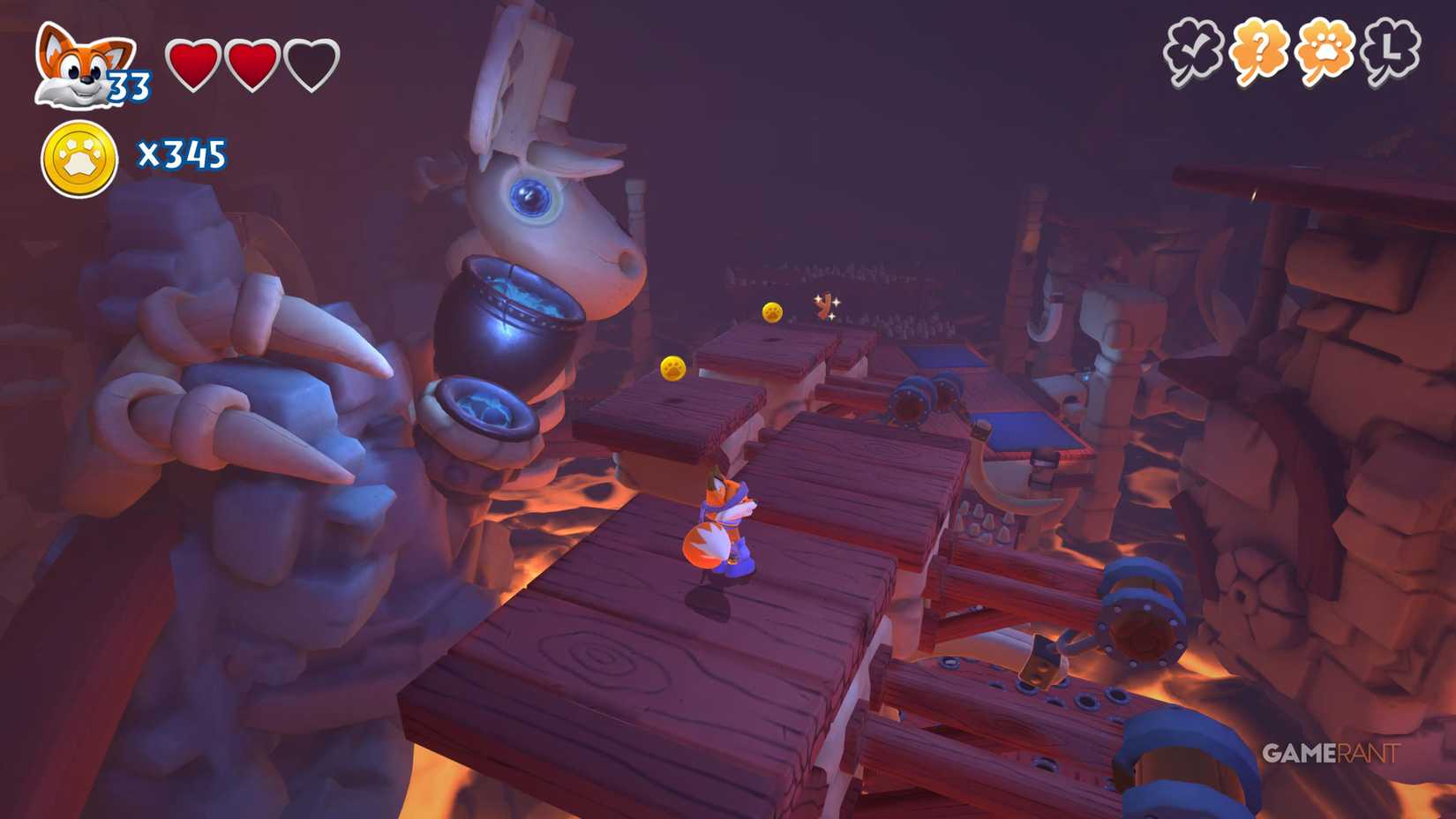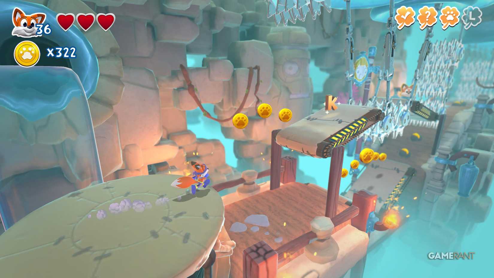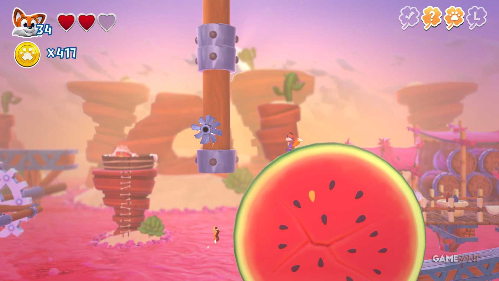 На этот раз идите по правому пути. После чекпоинта продолжайте движение вправо, мимо испытания на время. Наверху вы увидите три фиолетовых цветка. Уничтожьте их, чтобы открыть лисью нору, ведущую к скрытой странице.