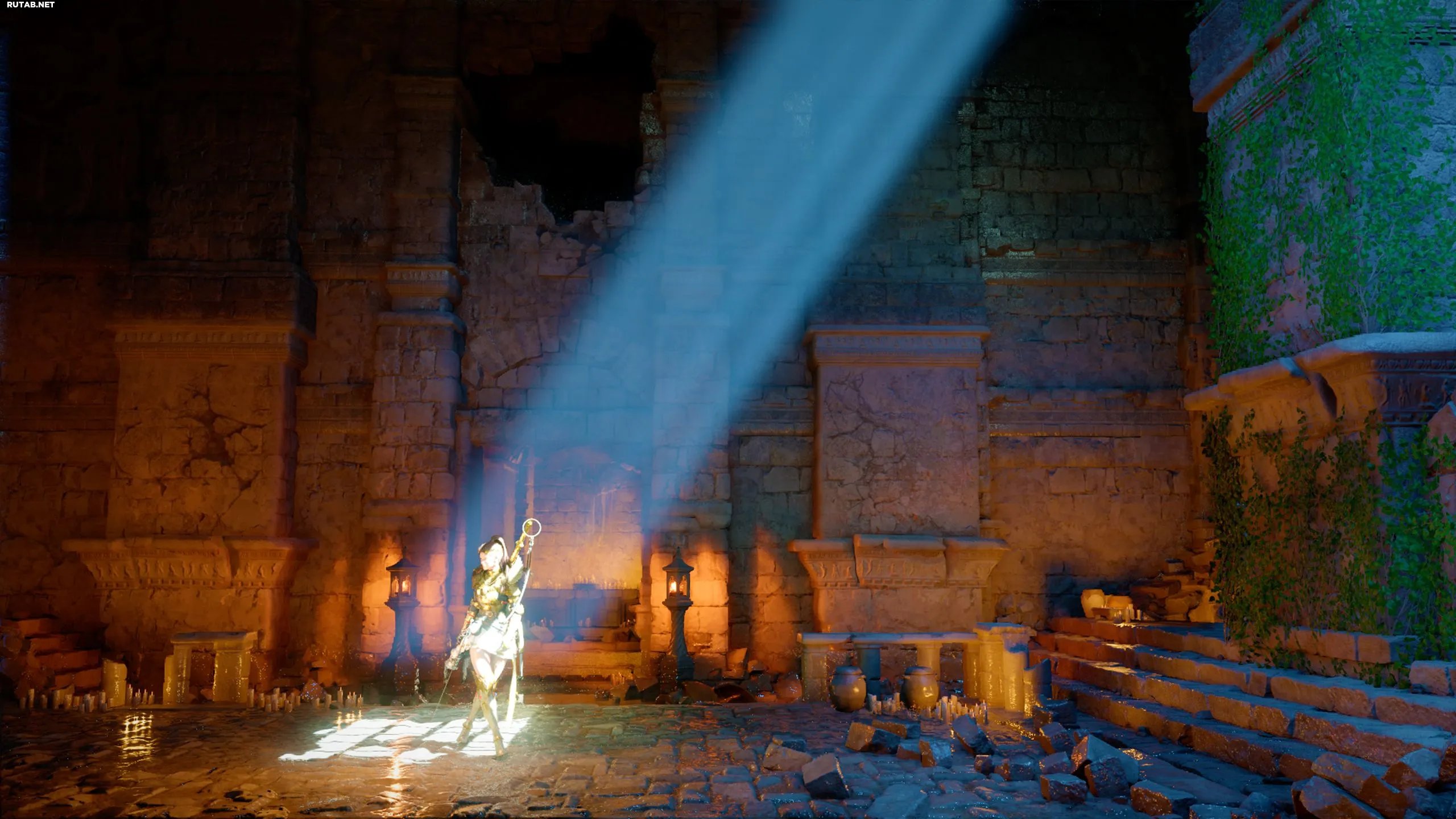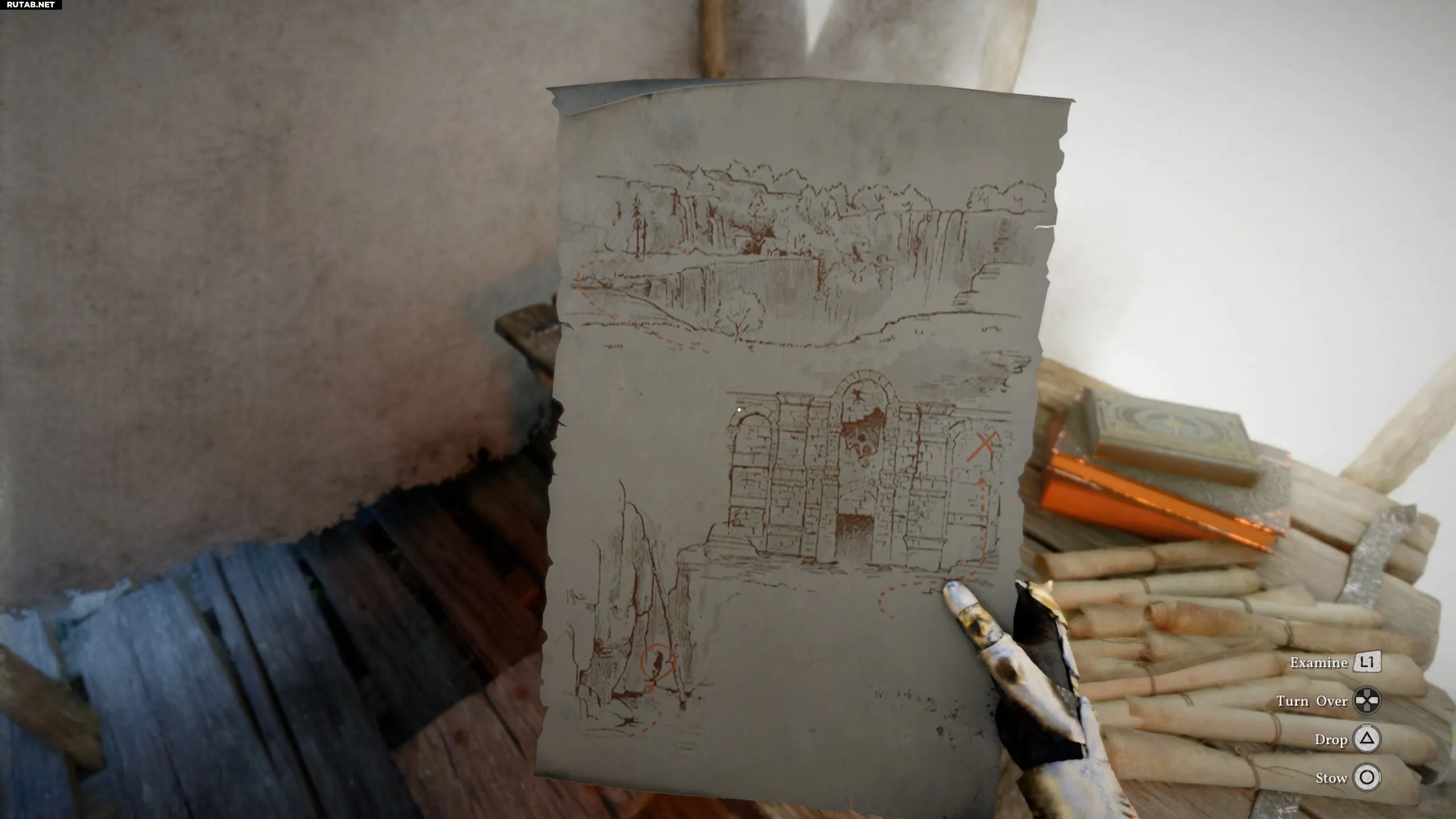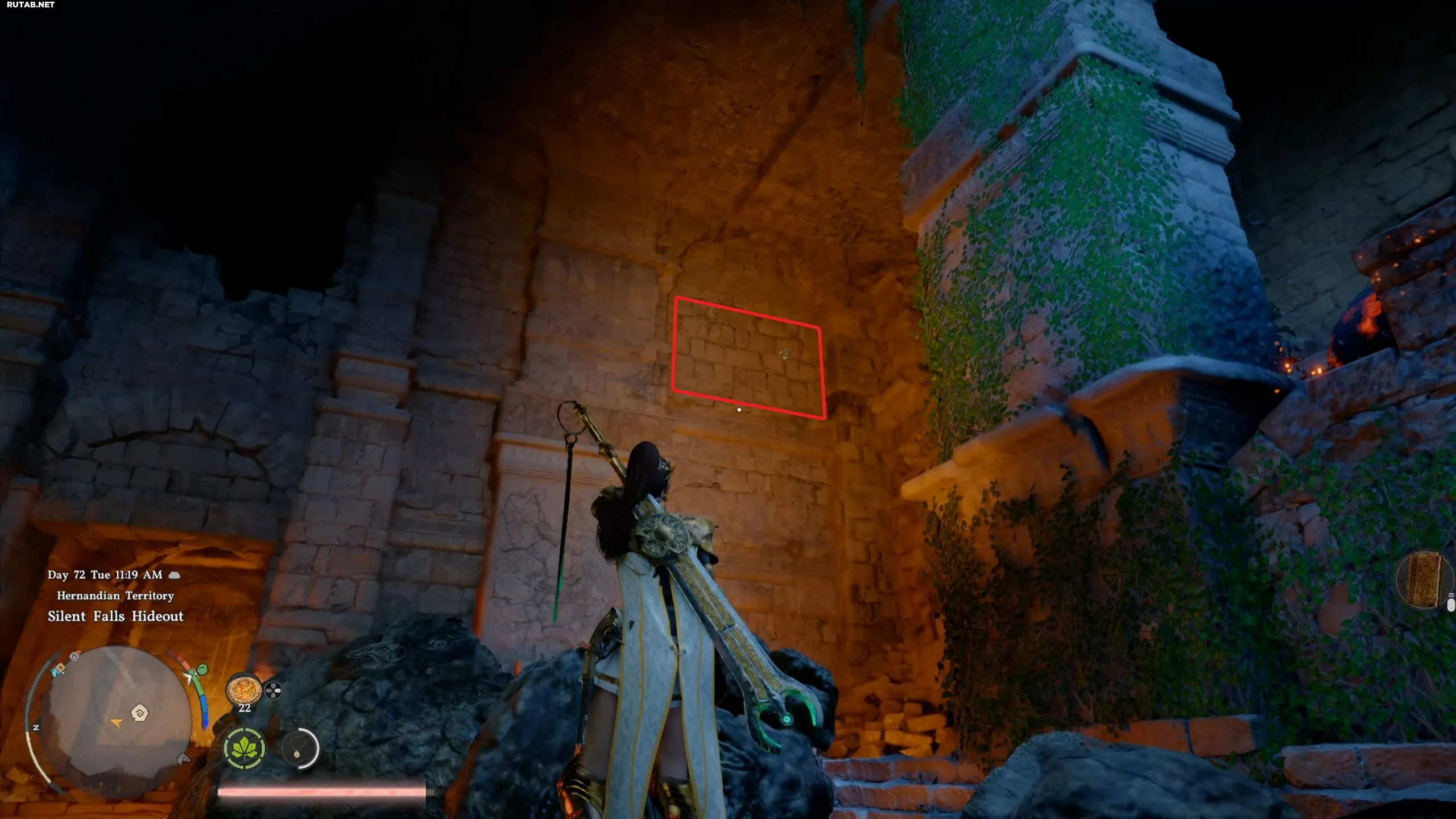 Если посмотреть на запертые ворота между двумя высокими стенами, эта сцена будет похожа на один из набросков на карте. Зажгите фонарь и направьте его в правый верхний угол стены — на ней проявится бледный зеленый лист. Это и есть место, где спрятано сокровище.