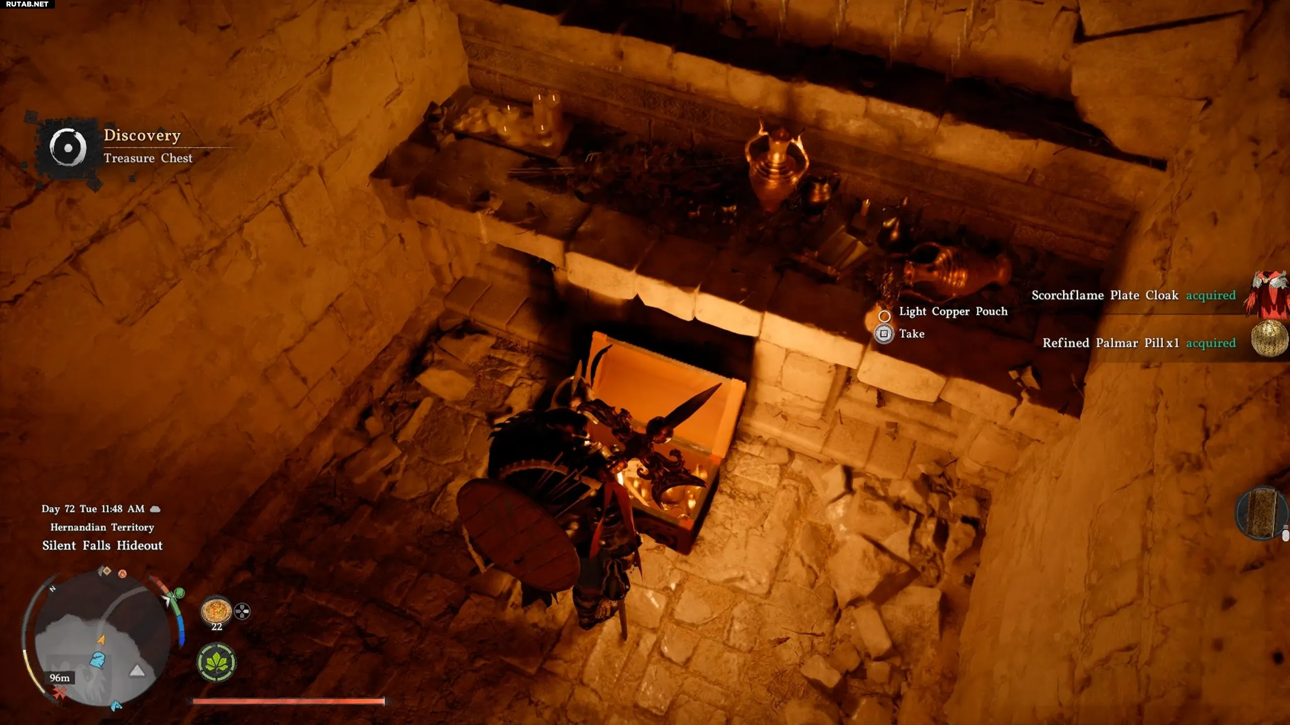Откройте сундук, чтобы получить Пламенный пластинчатый плащ (Scorchflame Plate Cloak) и Улучшенную пилюлю Палмара (Refined Palmar Pill). Плащ дает 3 уровень сопротивления огню, что крайне полезно против огненных врагов или для исследования опасных локаций. Улучшенная пилюля Палмара — редкий расходник, который дает второй шанс в бою, восстанавливая все здоровье после смерти.