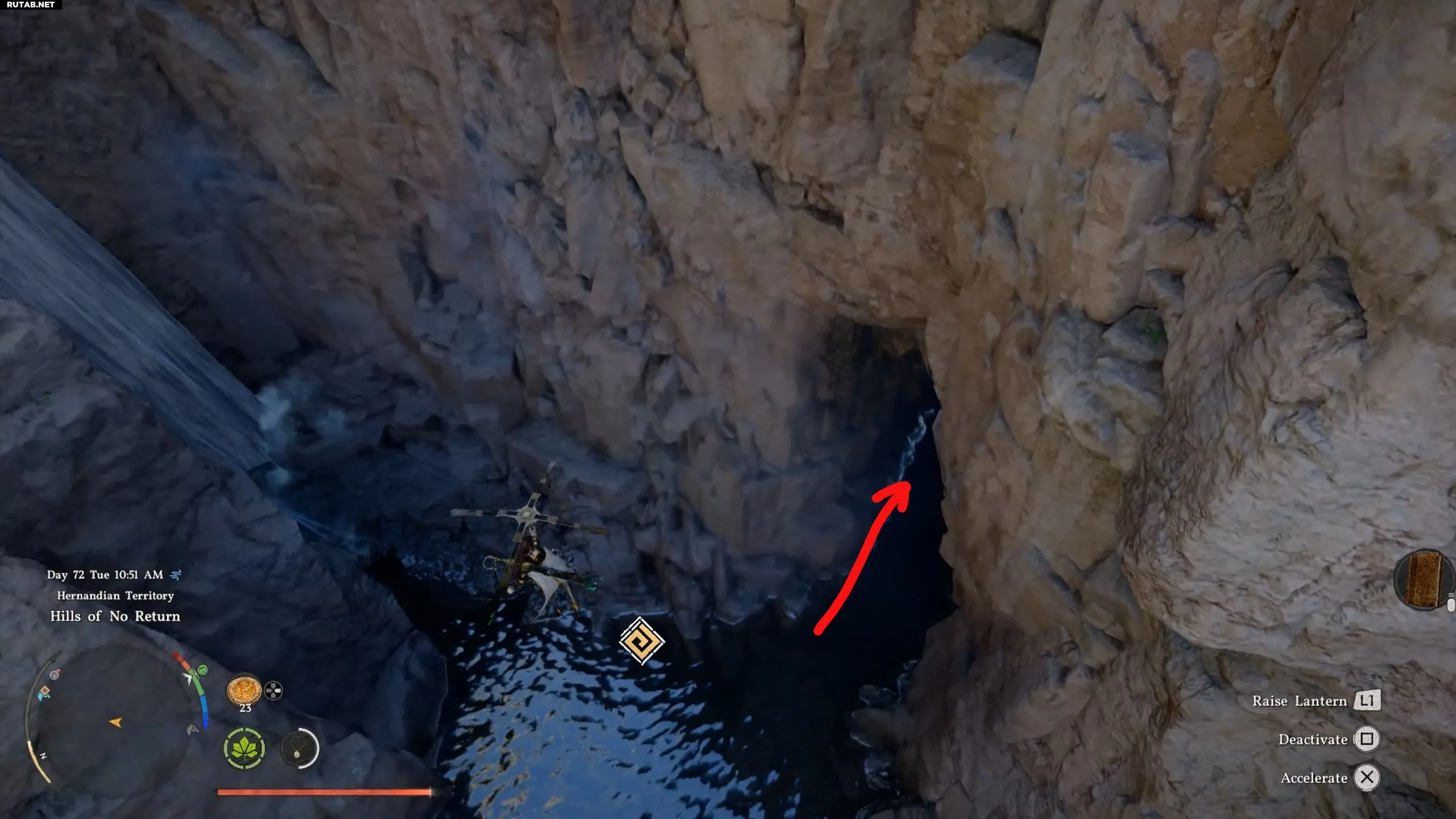 Медленно спланируйте вниз в промежуток между водопадом и скалой, чтобы обнаружить вход в пещеру. Проплывите через воду внутрь, пока не увидите арку. Будьте готовы — внутри вас ждет босс.
