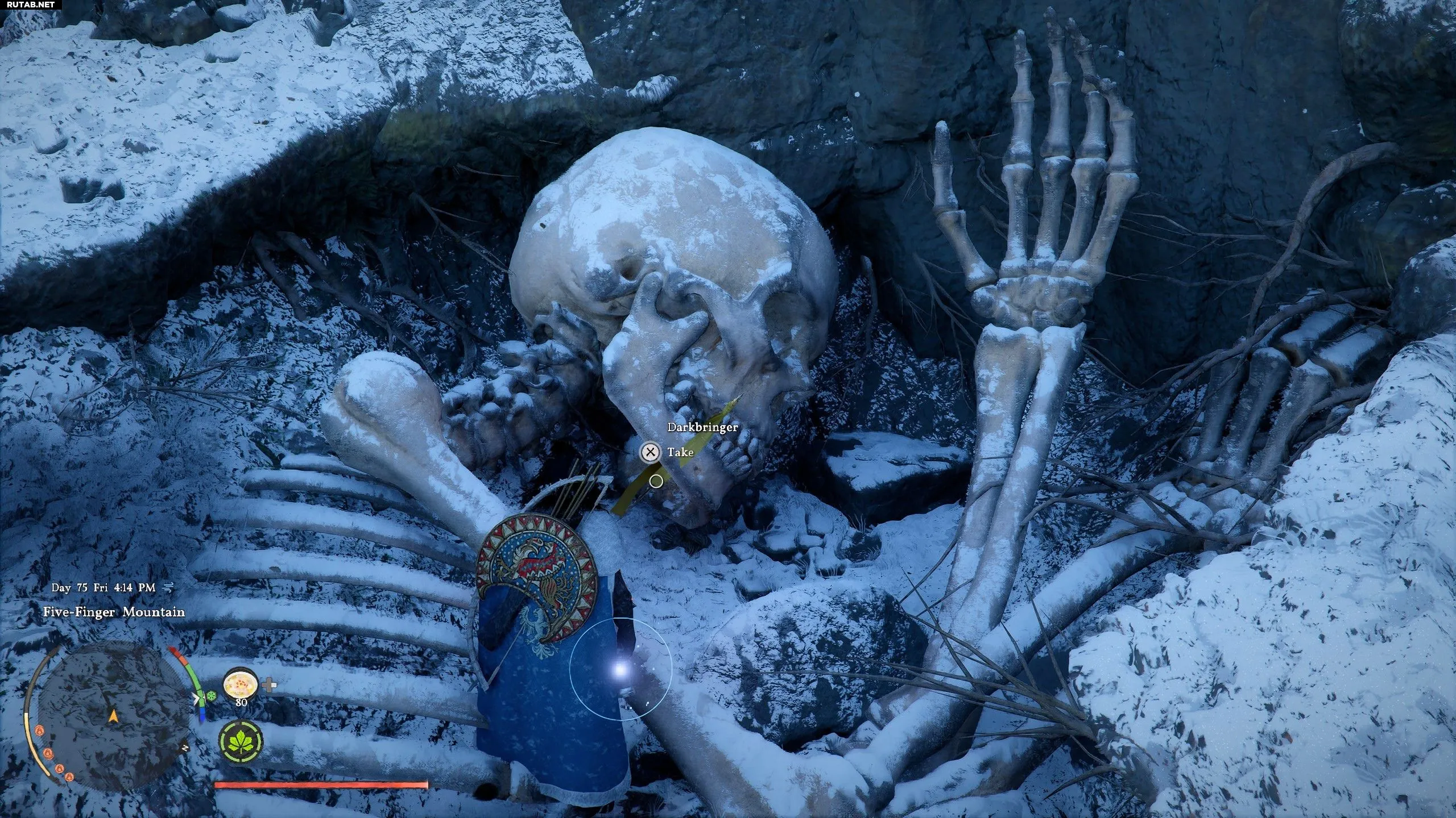 Добравшись до места, осмотрите подножие горы. Вы найдёте яму, в которой погребён скелет великана. Подойдя к скелету, вы увидите меч Темнопризыватель, застрявший в его челюсти, который можно вытащить. К счастью, поблизости нет врагов, так что вы сможете беспрепятственно забрать меч в свой инвентарь.