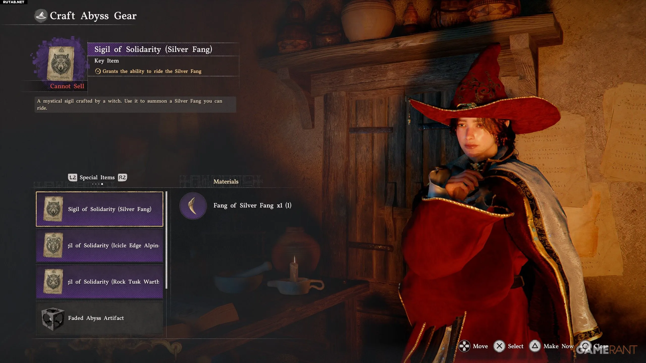 - Нажмите R2/RT, чтобы перейти на вкладку «Особый предмет» («Special Item»), и создайте «Печать Единства (Серебряный Клык)» («Sigil of Solidarity (Silver Fang)»).