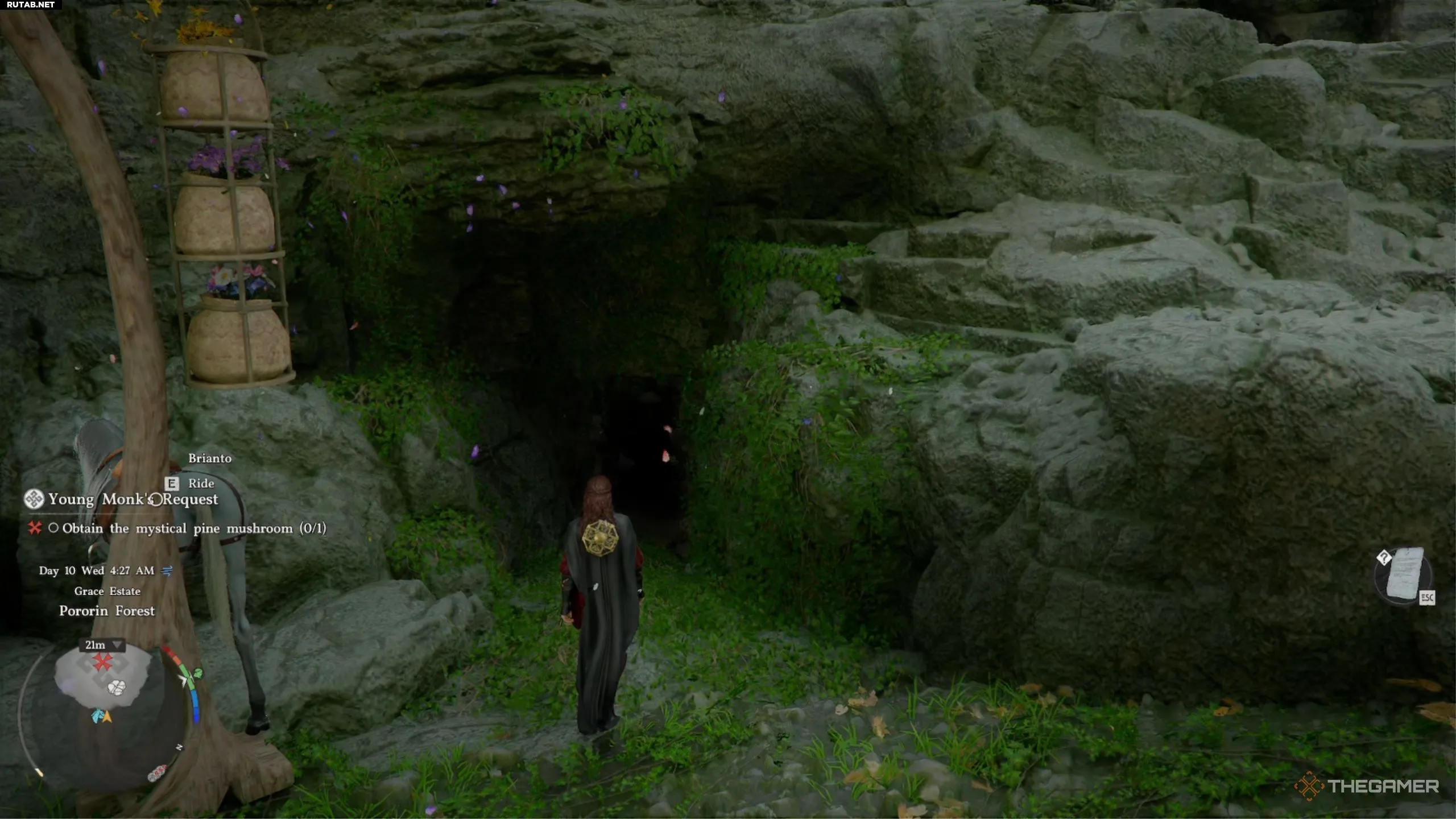 Оказавшись в нижней части этой области, вы увидите пещеру с деревянным столбом рядом. Войдите в пещеру и постоянно используйте рывок, чтобы преодолеть зону с усыпляющими грибами. В конце пути вы найдёте Мистический сосновый гриб. Задание завершится, как только вы возьмёте один гриб, но можно собрать их все.