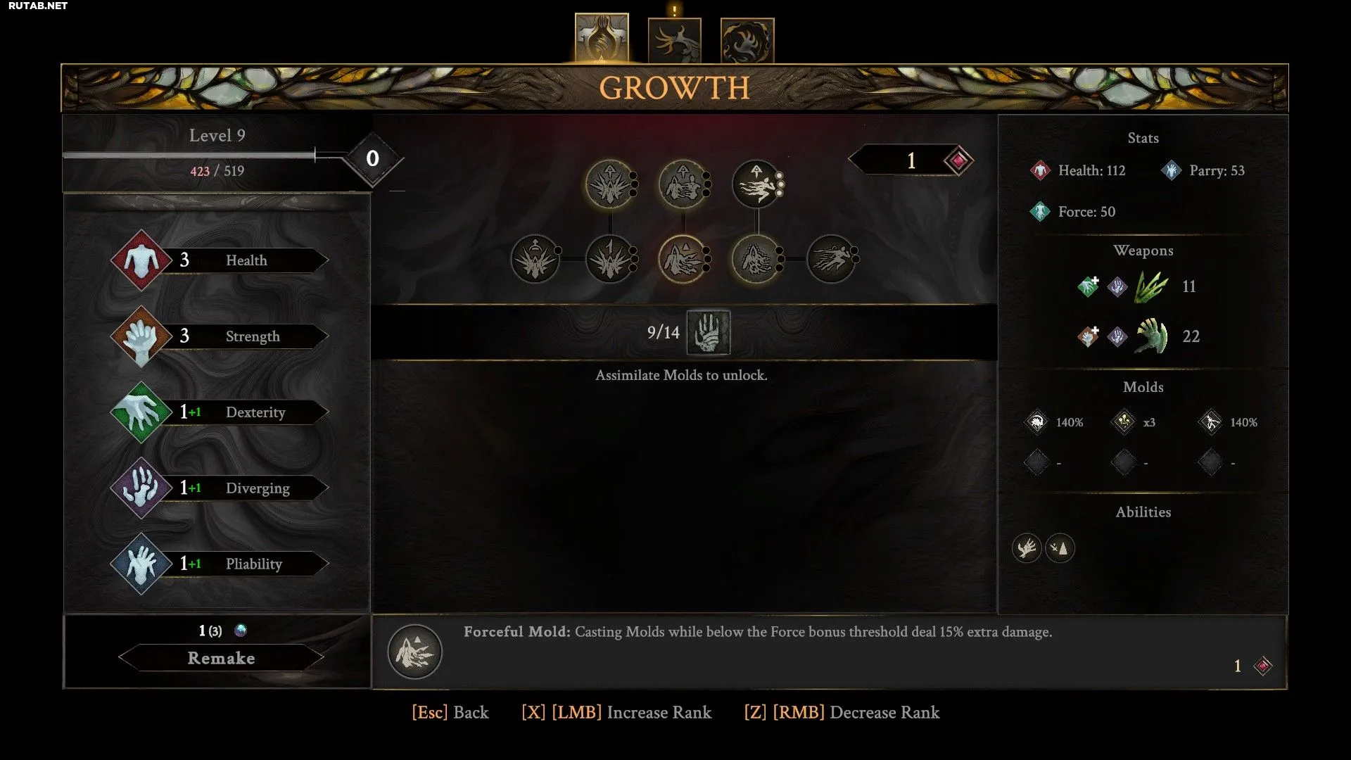 Осталось объяснить две характеристики, но прежде чем это сделать, игрокам стоит взглянуть на экран роста в меню Суррогата и обратить внимание на различные второстепенные характеристики в правом верхнем углу (Здоровье, Парирование, Сила, Рывок). Они увеличиваются при повышении основных характеристик (7 очков в Здоровье = 127 HP) и так далее.